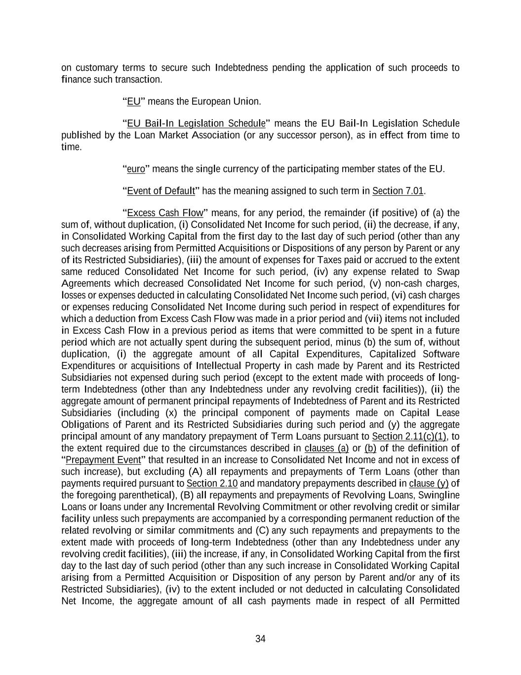 34 on customary terms to secure such Indebtedness pending the application of such proceeds to finance such transaction. “EU” means the European Union. “EU Bail-In Legislation Schedule” means the EU Bail-In Legislation Schedule published by the Loan Market Association (or any successor person), as in effect from time to time. “euro” means the single currency of the participating member states of the EU. “Event of Default” has the meaning assigned to such term in Section 7.01. “Excess Cash Flow” means, for any period, the remainder (if positive) of (a) the sum of, without duplication, (i) Consolidated Net Income for such period, (ii) the decrease, if any, in Consolidated Working Capital from the first day to the last day of such period (other than any such decreases arising from Permitted Acquisitions or Dispositions of any person by Parent or any of its Restricted Subsidiaries), (iii) the amount of expenses for Taxes paid or accrued to the extent same reduced Consolidated Net Income for such period, (iv) any expense related to Swap Agreements which decreased Consolidated Net Income for such period, (v) non-cash charges, losses or expenses deducted in calculating Consolidated Net Income such period, (vi) cash charges or expenses reducing Consolidated Net Income during such period in respect of expenditures for which a deduction from Excess Cash Flow was made in a prior period and (vii) items not included in Excess Cash Flow in a previous period as items that were committed to be spent in a future period which are not actually spent during the subsequent period, minus (b) the sum of, without duplication, (i) the aggregate amount of all Capital Expenditures, Capitalized Software Expenditures or acquisitions of Intellectual Property in cash made by Parent and its Restricted Subsidiaries not expensed during such period (except to the extent made with proceeds of long- term Indebtedness (other than any Indebtedness under any revolving credit facilities)), (ii) the aggregate amount of permanent principal repayments of Indebtedness of Parent and its Restricted Subsidiaries (including (x) the principal component of payments made on Capital Lease Obligations of Parent and its Restricted Subsidiaries during such period and (y) the aggregate principal amount of any mandatory prepayment of Term Loans pursuant to Section 2.11(c)(1), to the extent required due to the circumstances described in clauses (a) or (b) of the definition of “Prepayment Event” that resulted in an increase to Consolidated Net Income and not in excess of such increase), but excluding (A) all repayments and prepayments of Term Loans (other than payments required pursuant to Section 2.10 and mandatory prepayments described in clause (y) of the foregoing parenthetical), (B) all repayments and prepayments of Revolving Loans, Swingline Loans or loans under any Incremental Revolving Commitment or other revolving credit or similar facility unless such prepayments are accompanied by a corresponding permanent reduction of the related revolving or similar commitments and (C) any such repayments and prepayments to the extent made with proceeds of long-term Indebtedness (other than any Indebtedness under any revolving credit facilities), (iii) the increase, if any, in Consolidated Working Capital from the first day to the last day of such period (other than any such increase in Consolidated Working Capital arising from a Permitted Acquisition or Disposition of any person by Parent and/or any of its Restricted Subsidiaries), (iv) to the extent included or not deducted in calculating Consolidated Net Income, the aggregate amount of all cash payments made in respect of all Permitted