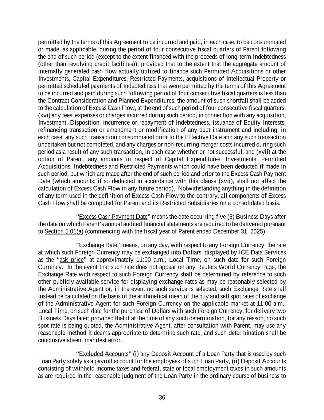 36 permitted by the terms of this Agreement to be incurred and paid, in each case, to be consummated or made, as applicable, during the period of four consecutive fiscal quarters of Parent following the end of such period (except to the extent financed with the proceeds of long-term Indebtedness (other than revolving credit facilities)); provided that to the extent that the aggregate amount of internally generated cash flow actually utilized to finance such Permitted Acquisitions or other Investments, Capital Expenditures, Restricted Payments, acquisitions of Intellectual Property or permitted scheduled payments of Indebtedness that were permitted by the terms of this Agreement to be incurred and paid during such following period of four consecutive fiscal quarters is less than the Contract Consideration and Planned Expenditures, the amount of such shortfall shall be added to the calculation of Excess Cash Flow, at the end of such period of four consecutive fiscal quarters, (xvi) any fees, expenses or charges incurred during such period, in connection with any acquisition, Investment, Disposition, incurrence or repayment of Indebtedness, issuance of Equity Interests, refinancing transaction or amendment or modification of any debt instrument and including, in each case, any such transaction consummated prior to the Effective Date and any such transaction undertaken but not completed, and any charges or non-recurring merger costs incurred during such period as a result of any such transaction, in each case whether or not successful, and (xvii) at the option of Parent, any amounts in respect of Capital Expenditures, Investments, Permitted Acquisitions, Indebtedness and Restricted Payments which could have been deducted if made in such period, but which are made after the end of such period and prior to the Excess Cash Payment Date (which amounts, if so deducted in accordance with this clause (xvii), shall not affect the calculation of Excess Cash Flow in any future period). Notwithstanding anything in the definition of any term used in the definition of Excess Cash Flow to the contrary, all components of Excess Cash Flow shall be computed for Parent and its Restricted Subsidiaries on a consolidated basis. “Excess Cash Payment Date” means the date occurring five (5) Business Days after the date on which Parent’s annual audited financial statements are required to be delivered pursuant to Section 5.01(a) (commencing with the fiscal year of Parent ended December 31, 2025). “Exchange Rate” means, on any day, with respect to any Foreign Currency, the rate at which such Foreign Currency may be exchanged into Dollars, displayed by ICE Data Services as the “ask price” at approximately 11:00 a.m., Local Time, on such date for such Foreign Currency. In the event that such rate does not appear on any Reuters World Currency Page, the Exchange Rate with respect to such Foreign Currency shall be determined by reference to such other publicly available service for displaying exchange rates as may be reasonably selected by the Administrative Agent or, in the event no such service is selected, such Exchange Rate shall instead be calculated on the basis of the arithmetical mean of the buy and sell spot rates of exchange of the Administrative Agent for such Foreign Currency on the applicable market at 11:00 a.m., Local Time, on such date for the purchase of Dollars with such Foreign Currency, for delivery two Business Days later; provided that if at the time of any such determination, for any reason, no such spot rate is being quoted, the Administrative Agent, after consultation with Parent, may use any reasonable method it deems appropriate to determine such rate, and such determination shall be conclusive absent manifest error. “Excluded Accounts” (i) any Deposit Account of a Loan Party that is used by such Loan Party solely as a payroll account for the employees of such Loan Party, (ii) Deposit Accounts consisting of withheld income taxes and federal, state or local employment taxes in such amounts as are required in the reasonable judgment of the Loan Party in the ordinary course of business to
