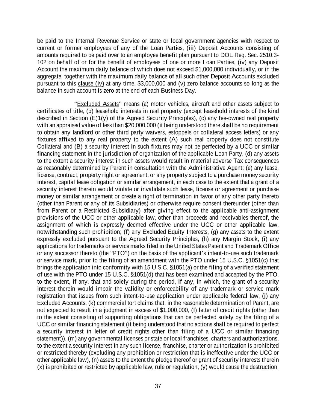 37 be paid to the Internal Revenue Service or state or local government agencies with respect to current or former employees of any of the Loan Parties, (iii) Deposit Accounts consisting of amounts required to be paid over to an employee benefit plan pursuant to DOL Reg. Sec. 2510.3- 102 on behalf of or for the benefit of employees of one or more Loan Parties, (iv) any Deposit Account the maximum daily balance of which does not exceed $1,000,000 individually, or in the aggregate, together with the maximum daily balance of all such other Deposit Accounts excluded pursuant to this clause (iv) at any time, $3,000,000 and (v) zero balance accounts so long as the balance in such account is zero at the end of each Business Day. “Excluded Assets” means (a) motor vehicles, aircraft and other assets subject to certificates of title, (b) leasehold interests in real property (except leasehold interests of the kind described in Section (E)1(y) of the Agreed Security Principles), (c) any fee-owned real property with an appraised value of less than $20,000,000 (it being understood there shall be no requirement to obtain any landlord or other third party waivers, estoppels or collateral access letters) or any fixtures affixed to any real property to the extent (A) such real property does not constitute Collateral and (B) a security interest in such fixtures may not be perfected by a UCC or similar financing statement in the jurisdiction of organization of the applicable Loan Party, (d) any assets to the extent a security interest in such assets would result in material adverse Tax consequences as reasonably determined by Parent in consultation with the Administrative Agent; (e) any lease, license, contract, property right or agreement, or any property subject to a purchase money security interest, capital lease obligation or similar arrangement, in each case to the extent that a grant of a security interest therein would violate or invalidate such lease, license or agreement or purchase money or similar arrangement or create a right of termination in favor of any other party thereto (other than Parent or any of its Subsidiaries) or otherwise require consent thereunder (other than from Parent or a Restricted Subsidiary) after giving effect to the applicable anti-assignment provisions of the UCC or other applicable law, other than proceeds and receivables thereof, the assignment of which is expressly deemed effective under the UCC or other applicable law, notwithstanding such prohibition; (f) any Excluded Equity Interests, (g) any assets to the extent expressly excluded pursuant to the Agreed Security Principles, (h) any Margin Stock, (i) any applications for trademarks or service marks filed in the United States Patent and Trademark Office or any successor thereto (the “PTO”) on the basis of the applicant’s intent-to-use such trademark or service mark, prior to the filing of an amendment with the PTO under 15 U.S.C. §1051(c) that brings the application into conformity with 15 U.S.C. §1051(a) or the filing of a verified statement of use with the PTO under 15 U.S.C. §1051(d) that has been examined and accepted by the PTO, to the extent, if any, that and solely during the period, if any, in which, the grant of a security interest therein would impair the validity or enforceability of any trademark or service mark registration that issues from such intent-to-use application under applicable federal law, (j) any Excluded Accounts, (k) commercial tort claims that, in the reasonable determination of Parent, are not expected to result in a judgment in excess of $1,000,000, (l) letter of credit rights (other than to the extent consisting of supporting obligations that can be perfected solely by the filing of a UCC or similar financing statement (it being understood that no actions shall be required to perfect a security interest in letter of credit rights other than filing of a UCC or similar financing statement)), (m) any governmental licenses or state or local franchises, charters and authorizations, to the extent a security interest in any such license, franchise, charter or authorization is prohibited or restricted thereby (excluding any prohibition or restriction that is ineffective under the UCC or other applicable law), (n) assets to the extent the pledge thereof or grant of security interests therein (x) is prohibited or restricted by applicable law, rule or regulation, (y) would cause the destruction,