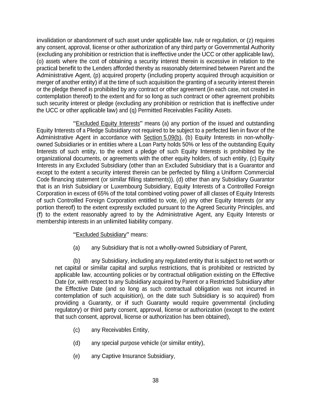 38 invalidation or abandonment of such asset under applicable law, rule or regulation, or (z) requires any consent, approval, license or other authorization of any third party or Governmental Authority (excluding any prohibition or restriction that is ineffective under the UCC or other applicable law), (o) assets where the cost of obtaining a security interest therein is excessive in relation to the practical benefit to the Lenders afforded thereby as reasonably determined between Parent and the Administrative Agent, (p) acquired property (including property acquired through acquisition or merger of another entity) if at the time of such acquisition the granting of a security interest therein or the pledge thereof is prohibited by any contract or other agreement (in each case, not created in contemplation thereof) to the extent and for so long as such contract or other agreement prohibits such security interest or pledge (excluding any prohibition or restriction that is ineffective under the UCC or other applicable law) and (q) Permitted Receivables Facility Assets. “Excluded Equity Interests” means (a) any portion of the issued and outstanding Equity Interests of a Pledge Subsidiary not required to be subject to a perfected lien in favor of the Administrative Agent in accordance with Section 5.09(b), (b) Equity Interests in non-wholly- owned Subsidiaries or in entities where a Loan Party holds 50% or less of the outstanding Equity Interests of such entity, to the extent a pledge of such Equity Interests is prohibited by the organizational documents, or agreements with the other equity holders, of such entity, (c) Equity Interests in any Excluded Subsidiary (other than an Excluded Subsidiary that is a Guarantor and except to the extent a security interest therein can be perfected by filing a Uniform Commercial Code financing statement (or similar filing statements)), (d) other than any Subsidiary Guarantor that is an Irish Subsidiary or Luxembourg Subsidiary, Equity Interests of a Controlled Foreign Corporation in excess of 65% of the total combined voting power of all classes of Equity Interests of such Controlled Foreign Corporation entitled to vote, (e) any other Equity Interests (or any portion thereof) to the extent expressly excluded pursuant to the Agreed Security Principles, and (f) to the extent reasonably agreed to by the Administrative Agent, any Equity Interests or membership interests in an unlimited liability company. “Excluded Subsidiary” means: (a) any Subsidiary that is not a wholly-owned Subsidiary of Parent, (b) any Subsidiary, including any regulated entity that is subject to net worth or net capital or similar capital and surplus restrictions, that is prohibited or restricted by applicable law, accounting policies or by contractual obligation existing on the Effective Date (or, with respect to any Subsidiary acquired by Parent or a Restricted Subsidiary after the Effective Date (and so long as such contractual obligation was not incurred in contemplation of such acquisition), on the date such Subsidiary is so acquired) from providing a Guaranty, or if such Guaranty would require governmental (including regulatory) or third party consent, approval, license or authorization (except to the extent that such consent, approval, license or authorization has been obtained), (c) any Receivables Entity, (d) any special purpose vehicle (or similar entity), (e) any Captive Insurance Subsidiary,