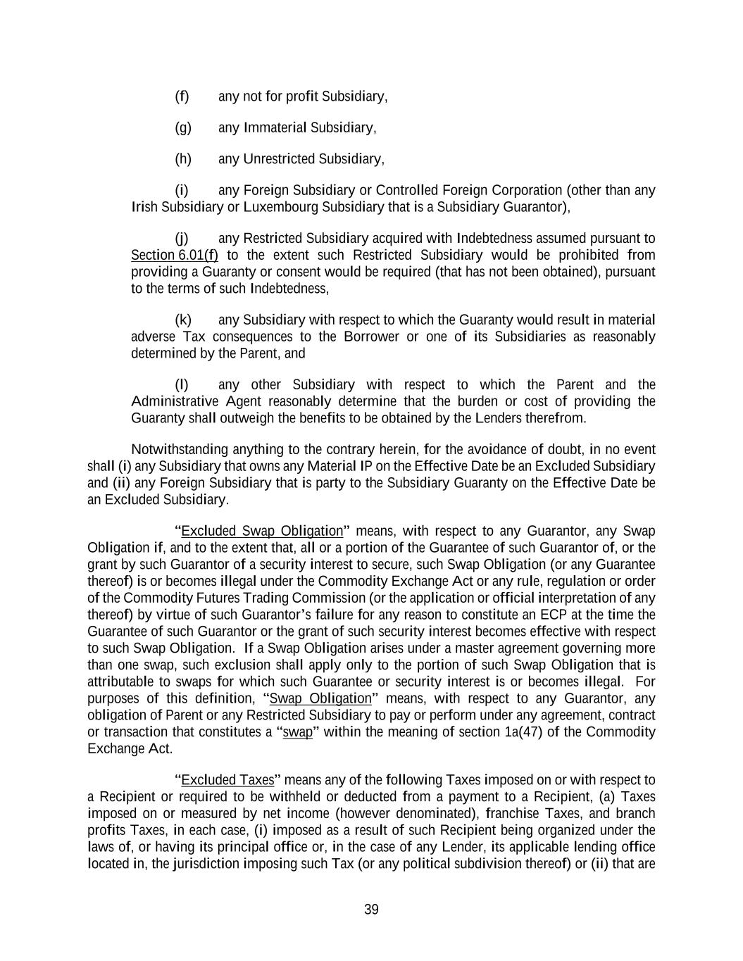 39 (f) any not for profit Subsidiary, (g) any Immaterial Subsidiary, (h) any Unrestricted Subsidiary, (i) any Foreign Subsidiary or Controlled Foreign Corporation (other than any Irish Subsidiary or Luxembourg Subsidiary that is a Subsidiary Guarantor), (j) any Restricted Subsidiary acquired with Indebtedness assumed pursuant to Section 6.01(f) to the extent such Restricted Subsidiary would be prohibited from providing a Guaranty or consent would be required (that has not been obtained), pursuant to the terms of such Indebtedness, (k) any Subsidiary with respect to which the Guaranty would result in material adverse Tax consequences to the Borrower or one of its Subsidiaries as reasonably determined by the Parent, and (l) any other Subsidiary with respect to which the Parent and the Administrative Agent reasonably determine that the burden or cost of providing the Guaranty shall outweigh the benefits to be obtained by the Lenders therefrom. Notwithstanding anything to the contrary herein, for the avoidance of doubt, in no event shall (i) any Subsidiary that owns any Material IP on the Effective Date be an Excluded Subsidiary and (ii) any Foreign Subsidiary that is party to the Subsidiary Guaranty on the Effective Date be an Excluded Subsidiary. “Excluded Swap Obligation” means, with respect to any Guarantor, any Swap Obligation if, and to the extent that, all or a portion of the Guarantee of such Guarantor of, or the grant by such Guarantor of a security interest to secure, such Swap Obligation (or any Guarantee thereof) is or becomes illegal under the Commodity Exchange Act or any rule, regulation or order of the Commodity Futures Trading Commission (or the application or official interpretation of any thereof) by virtue of such Guarantor’s failure for any reason to constitute an ECP at the time the Guarantee of such Guarantor or the grant of such security interest becomes effective with respect to such Swap Obligation. If a Swap Obligation arises under a master agreement governing more than one swap, such exclusion shall apply only to the portion of such Swap Obligation that is attributable to swaps for which such Guarantee or security interest is or becomes illegal. For purposes of this definition, “Swap Obligation” means, with respect to any Guarantor, any obligation of Parent or any Restricted Subsidiary to pay or perform under any agreement, contract or transaction that constitutes a “swap” within the meaning of section 1a(47) of the Commodity Exchange Act. “Excluded Taxes” means any of the following Taxes imposed on or with respect to a Recipient or required to be withheld or deducted from a payment to a Recipient, (a) Taxes imposed on or measured by net income (however denominated), franchise Taxes, and branch profits Taxes, in each case, (i) imposed as a result of such Recipient being organized under the laws of, or having its principal office or, in the case of any Lender, its applicable lending office located in, the jurisdiction imposing such Tax (or any political subdivision thereof) or (ii) that are