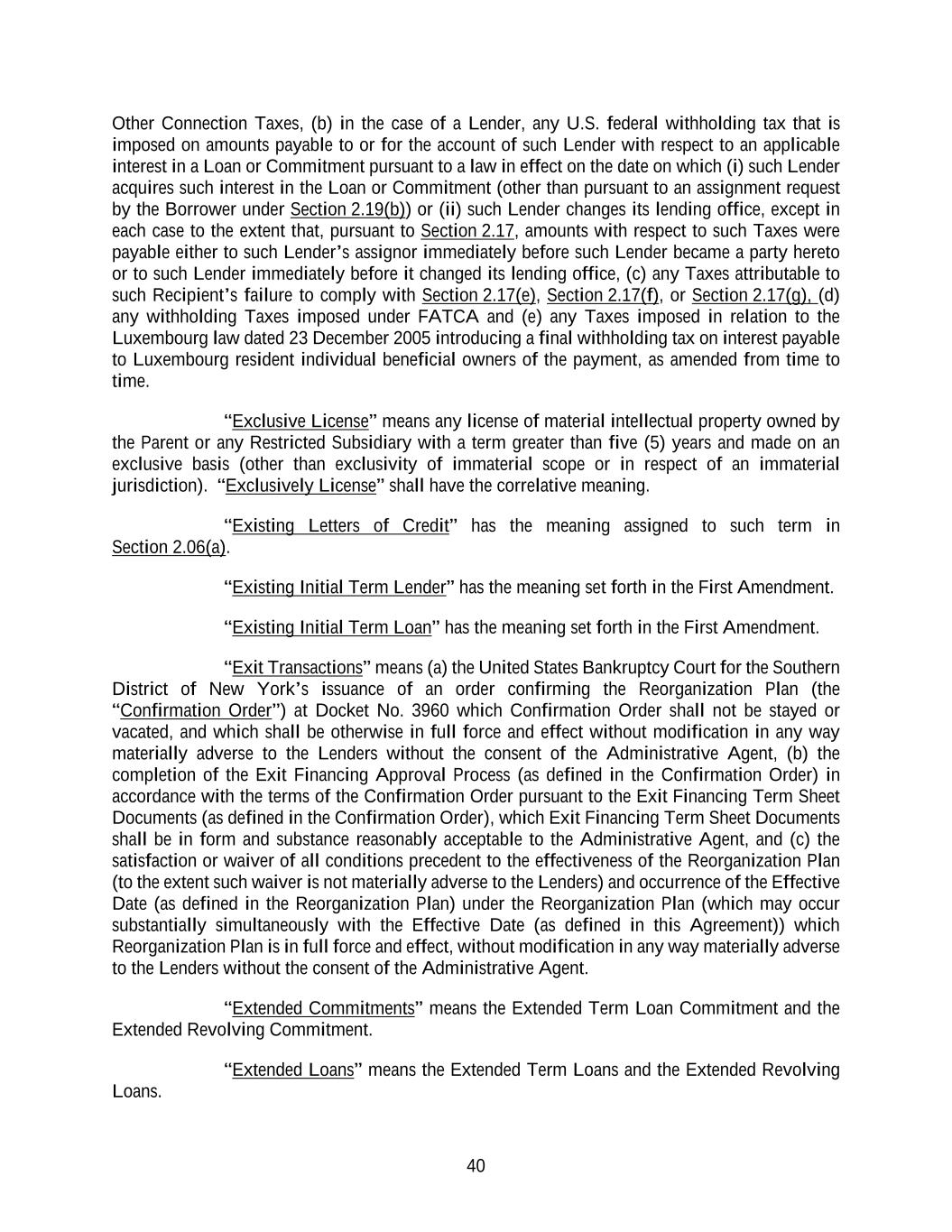 40 Other Connection Taxes, (b) in the case of a Lender, any U.S. federal withholding tax that is imposed on amounts payable to or for the account of such Lender with respect to an applicable interest in a Loan or Commitment pursuant to a law in effect on the date on which (i) such Lender acquires such interest in the Loan or Commitment (other than pursuant to an assignment request by the Borrower under Section 2.19(b)) or (ii) such Lender changes its lending office, except in each case to the extent that, pursuant to Section 2.17, amounts with respect to such Taxes were payable either to such Lender’s assignor immediately before such Lender became a party hereto or to such Lender immediately before it changed its lending office, (c) any Taxes attributable to such Recipient’s failure to comply with Section 2.17(e), Section 2.17(f), or Section 2.17(g), (d) any withholding Taxes imposed under FATCA and (e) any Taxes imposed in relation to the Luxembourg law dated 23 December 2005 introducing a final withholding tax on interest payable to Luxembourg resident individual beneficial owners of the payment, as amended from time to time. “Exclusive License” means any license of material intellectual property owned by the Parent or any Restricted Subsidiary with a term greater than five (5) years and made on an exclusive basis (other than exclusivity of immaterial scope or in respect of an immaterial jurisdiction). “Exclusively License” shall have the correlative meaning. “Existing Letters of Credit” has the meaning assigned to such term in Section 2.06(a). “Existing Initial Term Lender” has the meaning set forth in the First Amendment. “Existing Initial Term Loan” has the meaning set forth in the First Amendment. “Exit Transactions” means (a) the United States Bankruptcy Court for the Southern District of New York’s issuance of an order confirming the Reorganization Plan (the “Confirmation Order”) at Docket No. 3960 which Confirmation Order shall not be stayed or vacated, and which shall be otherwise in full force and effect without modification in any way materially adverse to the Lenders without the consent of the Administrative Agent, (b) the completion of the Exit Financing Approval Process (as defined in the Confirmation Order) in accordance with the terms of the Confirmation Order pursuant to the Exit Financing Term Sheet Documents (as defined in the Confirmation Order), which Exit Financing Term Sheet Documents shall be in form and substance reasonably acceptable to the Administrative Agent, and (c) the satisfaction or waiver of all conditions precedent to the effectiveness of the Reorganization Plan (to the extent such waiver is not materially adverse to the Lenders) and occurrence of the Effective Date (as defined in the Reorganization Plan) under the Reorganization Plan (which may occur substantially simultaneously with the Effective Date (as defined in this Agreement)) which Reorganization Plan is in full force and effect, without modification in any way materially adverse to the Lenders without the consent of the Administrative Agent. “Extended Commitments” means the Extended Term Loan Commitment and the Extended Revolving Commitment. “Extended Loans” means the Extended Term Loans and the Extended Revolving Loans.