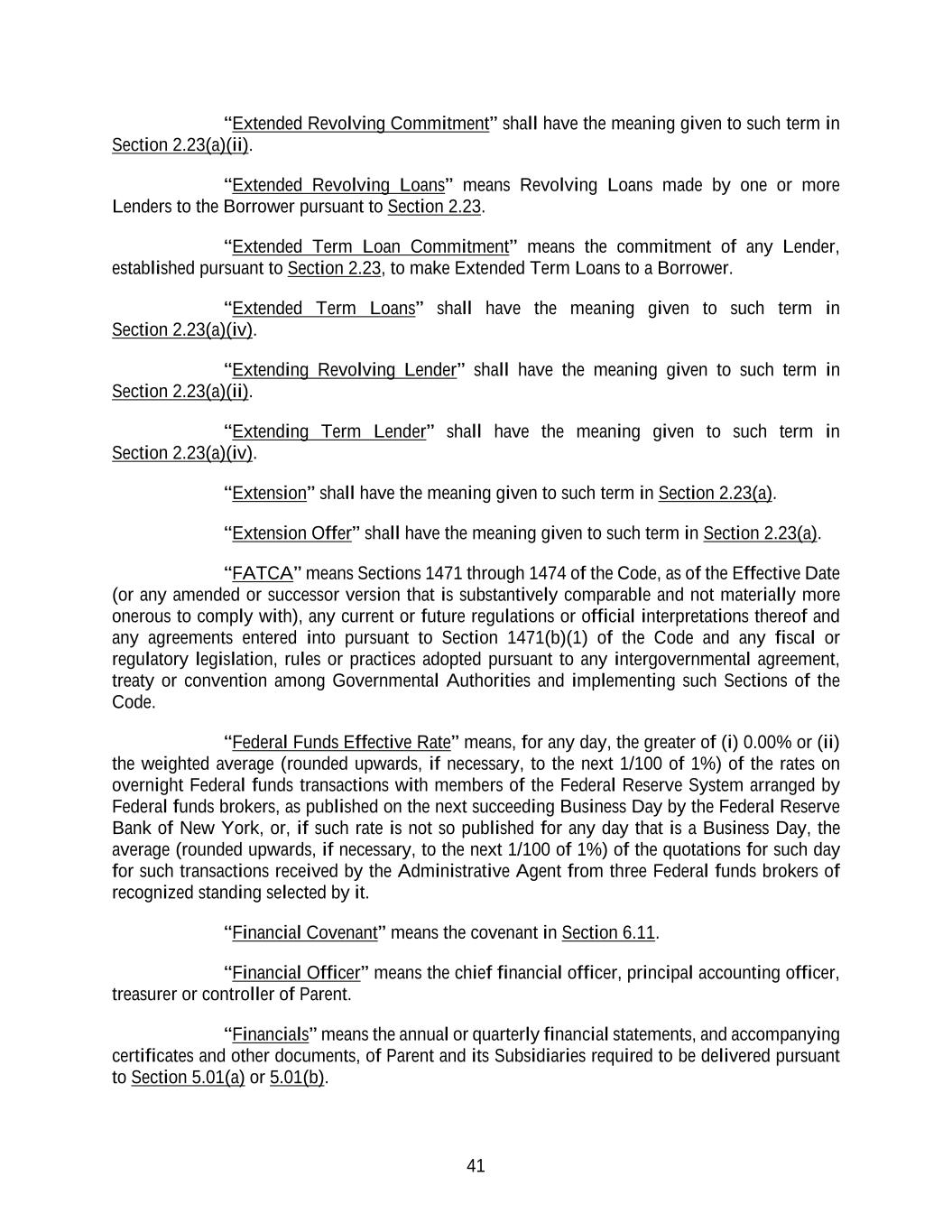 41 “Extended Revolving Commitment” shall have the meaning given to such term in Section 2.23(a)(ii). “Extended Revolving Loans” means Revolving Loans made by one or more Lenders to the Borrower pursuant to Section 2.23. “Extended Term Loan Commitment” means the commitment of any Lender, established pursuant to Section 2.23, to make Extended Term Loans to a Borrower. “Extended Term Loans” shall have the meaning given to such term in Section 2.23(a)(iv). “Extending Revolving Lender” shall have the meaning given to such term in Section 2.23(a)(ii). “Extending Term Lender” shall have the meaning given to such term in Section 2.23(a)(iv). “Extension” shall have the meaning given to such term in Section 2.23(a). “Extension Offer” shall have the meaning given to such term in Section 2.23(a). “FATCA” means Sections 1471 through 1474 of the Code, as of the Effective Date (or any amended or successor version that is substantively comparable and not materially more onerous to comply with), any current or future regulations or official interpretations thereof and any agreements entered into pursuant to Section 1471(b)(1) of the Code and any fiscal or regulatory legislation, rules or practices adopted pursuant to any intergovernmental agreement, treaty or convention among Governmental Authorities and implementing such Sections of the Code. “Federal Funds Effective Rate” means, for any day, the greater of (i) 0.00% or (ii) the weighted average (rounded upwards, if necessary, to the next 1/100 of 1%) of the rates on overnight Federal funds transactions with members of the Federal Reserve System arranged by Federal funds brokers, as published on the next succeeding Business Day by the Federal Reserve Bank of New York, or, if such rate is not so published for any day that is a Business Day, the average (rounded upwards, if necessary, to the next 1/100 of 1%) of the quotations for such day for such transactions received by the Administrative Agent from three Federal funds brokers of recognized standing selected by it. “Financial Covenant” means the covenant in Section 6.11. “Financial Officer” means the chief financial officer, principal accounting officer, treasurer or controller of Parent. “Financials” means the annual or quarterly financial statements, and accompanying certificates and other documents, of Parent and its Subsidiaries required to be delivered pursuant to Section 5.01(a) or 5.01(b).