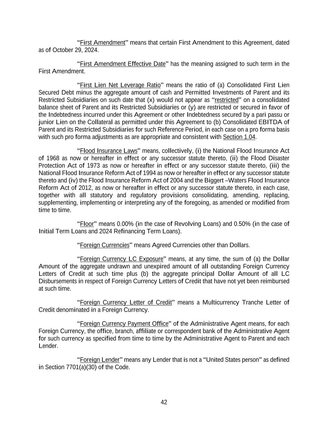 42 “First Amendment” means that certain First Amendment to this Agreement, dated as of October 29, 2024. “First Amendment Effective Date” has the meaning assigned to such term in the First Amendment. “First Lien Net Leverage Ratio” means the ratio of (a) Consolidated First Lien Secured Debt minus the aggregate amount of cash and Permitted Investments of Parent and its Restricted Subsidiaries on such date that (x) would not appear as “restricted” on a consolidated balance sheet of Parent and its Restricted Subsidiaries or (y) are restricted or secured in favor of the Indebtedness incurred under this Agreement or other Indebtedness secured by a pari passu or junior Lien on the Collateral as permitted under this Agreement to (b) Consolidated EBITDA of Parent and its Restricted Subsidiaries for such Reference Period, in each case on a pro forma basis with such pro forma adjustments as are appropriate and consistent with Section 1.04. “Flood Insurance Laws” means, collectively, (i) the National Flood Insurance Act of 1968 as now or hereafter in effect or any successor statute thereto, (ii) the Flood Disaster Protection Act of 1973 as now or hereafter in effect or any successor statute thereto, (iii) the National Flood Insurance Reform Act of 1994 as now or hereafter in effect or any successor statute thereto and (iv) the Flood Insurance Reform Act of 2004 and the Biggert –Waters Flood Insurance Reform Act of 2012, as now or hereafter in effect or any successor statute thereto, in each case, together with all statutory and regulatory provisions consolidating, amending, replacing, supplementing, implementing or interpreting any of the foregoing, as amended or modified from time to time. “Floor” means 0.00% (in the case of Revolving Loans) and 0.50% (in the case of Initial Term Loans and 2024 Refinancing Term Loans). “Foreign Currencies” means Agreed Currencies other than Dollars. “Foreign Currency LC Exposure” means, at any time, the sum of (a) the Dollar Amount of the aggregate undrawn and unexpired amount of all outstanding Foreign Currency Letters of Credit at such time plus (b) the aggregate principal Dollar Amount of all LC Disbursements in respect of Foreign Currency Letters of Credit that have not yet been reimbursed at such time. “Foreign Currency Letter of Credit” means a Multicurrency Tranche Letter of Credit denominated in a Foreign Currency. “Foreign Currency Payment Office” of the Administrative Agent means, for each Foreign Currency, the office, branch, affiliate or correspondent bank of the Administrative Agent for such currency as specified from time to time by the Administrative Agent to Parent and each Lender. “Foreign Lender” means any Lender that is not a “United States person” as defined in Section 7701(a)(30) of the Code.