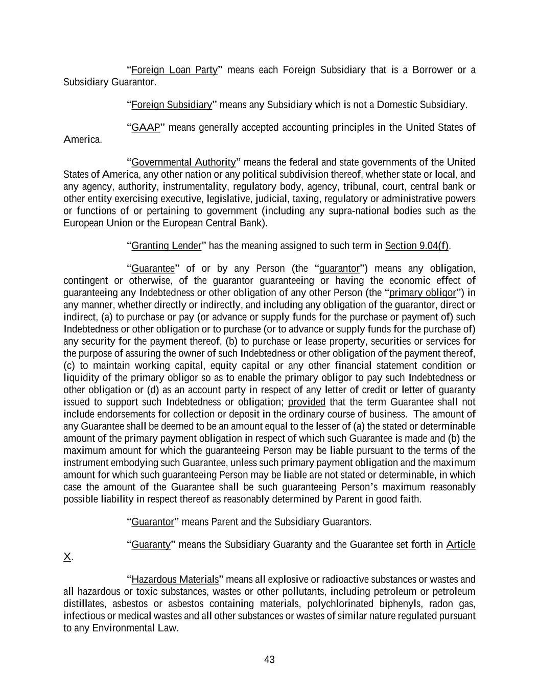 43 “Foreign Loan Party” means each Foreign Subsidiary that is a Borrower or a Subsidiary Guarantor. “Foreign Subsidiary” means any Subsidiary which is not a Domestic Subsidiary. “GAAP” means generally accepted accounting principles in the United States of America. “Governmental Authority” means the federal and state governments of the United States of America, any other nation or any political subdivision thereof, whether state or local, and any agency, authority, instrumentality, regulatory body, agency, tribunal, court, central bank or other entity exercising executive, legislative, judicial, taxing, regulatory or administrative powers or functions of or pertaining to government (including any supra-national bodies such as the European Union or the European Central Bank). “Granting Lender” has the meaning assigned to such term in Section 9.04(f). “Guarantee” of or by any Person (the “guarantor”) means any obligation, contingent or otherwise, of the guarantor guaranteeing or having the economic effect of guaranteeing any Indebtedness or other obligation of any other Person (the “primary obligor”) in any manner, whether directly or indirectly, and including any obligation of the guarantor, direct or indirect, (a) to purchase or pay (or advance or supply funds for the purchase or payment of) such Indebtedness or other obligation or to purchase (or to advance or supply funds for the purchase of) any security for the payment thereof, (b) to purchase or lease property, securities or services for the purpose of assuring the owner of such Indebtedness or other obligation of the payment thereof, (c) to maintain working capital, equity capital or any other financial statement condition or liquidity of the primary obligor so as to enable the primary obligor to pay such Indebtedness or other obligation or (d) as an account party in respect of any letter of credit or letter of guaranty issued to support such Indebtedness or obligation; provided that the term Guarantee shall not include endorsements for collection or deposit in the ordinary course of business. The amount of any Guarantee shall be deemed to be an amount equal to the lesser of (a) the stated or determinable amount of the primary payment obligation in respect of which such Guarantee is made and (b) the maximum amount for which the guaranteeing Person may be liable pursuant to the terms of the instrument embodying such Guarantee, unless such primary payment obligation and the maximum amount for which such guaranteeing Person may be liable are not stated or determinable, in which case the amount of the Guarantee shall be such guaranteeing Person’s maximum reasonably possible liability in respect thereof as reasonably determined by Parent in good faith. “Guarantor” means Parent and the Subsidiary Guarantors. “Guaranty” means the Subsidiary Guaranty and the Guarantee set forth in Article X. “Hazardous Materials” means all explosive or radioactive substances or wastes and all hazardous or toxic substances, wastes or other pollutants, including petroleum or petroleum distillates, asbestos or asbestos containing materials, polychlorinated biphenyls, radon gas, infectious or medical wastes and all other substances or wastes of similar nature regulated pursuant to any Environmental Law.