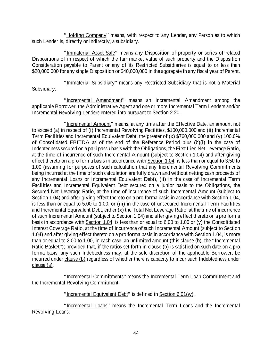 44 “Holding Company” means, with respect to any Lender, any Person as to which such Lender is, directly or indirectly, a subsidiary. “Immaterial Asset Sale” means any Disposition of property or series of related Dispositions of in respect of which the fair market value of such property and the Disposition Consideration payable to Parent or any of its Restricted Subsidiaries is equal to or less than $20,000,000 for any single Disposition or $40,000,000 in the aggregate in any fiscal year of Parent. “Immaterial Subsidiary” means any Restricted Subsidiary that is not a Material Subsidiary. “Incremental Amendment” means an Incremental Amendment among the applicable Borrower, the Administrative Agent and one or more Incremental Term Lenders and/or Incremental Revolving Lenders entered into pursuant to Section 2.20. “Incremental Amount” means, at any time after the Effective Date, an amount not to exceed (a) in respect of (i) Incremental Revolving Facilities, $100,000,000 and (ii) Incremental Term Facilities and Incremental Equivalent Debt, the greater of (x) $760,000,000 and (y) 100.0% of Consolidated EBITDA as of the end of the Reference Period plus (b)(i) in the case of Indebtedness secured on a pari passu basis with the Obligations, the First Lien Net Leverage Ratio, at the time of incurrence of such Incremental Amount (subject to Section 1.04) and after giving effect thereto on a pro forma basis in accordance with Section 1.04, is less than or equal to 3.50 to 1.00 (assuming for purposes of such calculation that any Incremental Revolving Commitments being incurred at the time of such calculation are fully drawn and without netting cash proceeds of any Incremental Loans or Incremental Equivalent Debt), (ii) in the case of Incremental Term Facilities and Incremental Equivalent Debt secured on a junior basis to the Obligations, the Secured Net Leverage Ratio, at the time of incurrence of such Incremental Amount (subject to Section 1.04) and after giving effect thereto on a pro forma basis in accordance with Section 1.04, is less than or equal to 5.00 to 1.00, or (iii) in the case of unsecured Incremental Term Facilities and Incremental Equivalent Debt, either (x) the Total Net Leverage Ratio, at the time of incurrence of such Incremental Amount (subject to Section 1.04) and after giving effect thereto on a pro forma basis in accordance with Section 1.04, is less than or equal to 6.00 to 1.00 or (y) the Consolidated Interest Coverage Ratio, at the time of incurrence of such Incremental Amount (subject to Section 1.04) and after giving effect thereto on a pro forma basis in accordance with Section 1.04, is more than or equal to 2.00 to 1.00, in each case, an unlimited amount (this clause (b), the “Incremental Ratio Basket”); provided that, if the ratios set forth in clause (b) is satisfied on such date on a pro forma basis, any such Indebtedness may, at the sole discretion of the applicable Borrower, be incurred under clause (b) regardless of whether there is capacity to incur such Indebtedness under clause (a). “Incremental Commitments” means the Incremental Term Loan Commitment and the Incremental Revolving Commitment. “Incremental Equivalent Debt” is defined in Section 6.01(w). “Incremental Loans” means the Incremental Term Loans and the Incremental Revolving Loans.