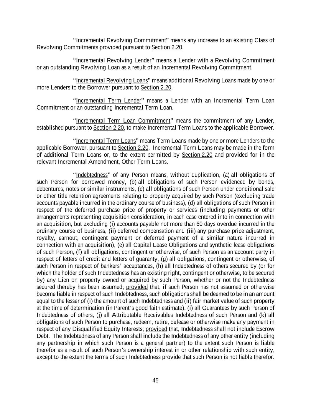 45 “Incremental Revolving Commitment” means any increase to an existing Class of Revolving Commitments provided pursuant to Section 2.20. “Incremental Revolving Lender” means a Lender with a Revolving Commitment or an outstanding Revolving Loan as a result of an Incremental Revolving Commitment. “Incremental Revolving Loans” means additional Revolving Loans made by one or more Lenders to the Borrower pursuant to Section 2.20. “Incremental Term Lender” means a Lender with an Incremental Term Loan Commitment or an outstanding Incremental Term Loan. “Incremental Term Loan Commitment” means the commitment of any Lender, established pursuant to Section 2.20, to make Incremental Term Loans to the applicable Borrower. “Incremental Term Loans” means Term Loans made by one or more Lenders to the applicable Borrower, pursuant to Section 2.20. Incremental Term Loans may be made in the form of additional Term Loans or, to the extent permitted by Section 2.20 and provided for in the relevant Incremental Amendment, Other Term Loans. “Indebtedness” of any Person means, without duplication, (a) all obligations of such Person for borrowed money, (b) all obligations of such Person evidenced by bonds, debentures, notes or similar instruments, (c) all obligations of such Person under conditional sale or other title retention agreements relating to property acquired by such Person (excluding trade accounts payable incurred in the ordinary course of business), (d) all obligations of such Person in respect of the deferred purchase price of property or services (including payments or other arrangements representing acquisition consideration, in each case entered into in connection with an acquisition, but excluding (i) accounts payable not more than 60 days overdue incurred in the ordinary course of business, (ii) deferred compensation and (iii) any purchase price adjustment, royalty, earnout, contingent payment or deferred payment of a similar nature incurred in connection with an acquisition), (e) all Capital Lease Obligations and synthetic lease obligations of such Person, (f) all obligations, contingent or otherwise, of such Person as an account party in respect of letters of credit and letters of guaranty, (g) all obligations, contingent or otherwise, of such Person in respect of bankers’ acceptances, (h) all Indebtedness of others secured by (or for which the holder of such Indebtedness has an existing right, contingent or otherwise, to be secured by) any Lien on property owned or acquired by such Person, whether or not the Indebtedness secured thereby has been assumed; provided that, if such Person has not assumed or otherwise become liable in respect of such Indebtedness, such obligations shall be deemed to be in an amount equal to the lesser of (i) the amount of such Indebtedness and (ii) fair market value of such property at the time of determination (in Parent’s good faith estimate), (i) all Guarantees by such Person of Indebtedness of others, (j) all Attributable Receivables Indebtedness of such Person and (k) all obligations of such Person to purchase, redeem, retire, defease or otherwise make any payment in respect of any Disqualified Equity Interests; provided that, Indebtedness shall not include Escrow Debt. The Indebtedness of any Person shall include the Indebtedness of any other entity (including any partnership in which such Person is a general partner) to the extent such Person is liable therefor as a result of such Person’s ownership interest in or other relationship with such entity, except to the extent the terms of such Indebtedness provide that such Person is not liable therefor.