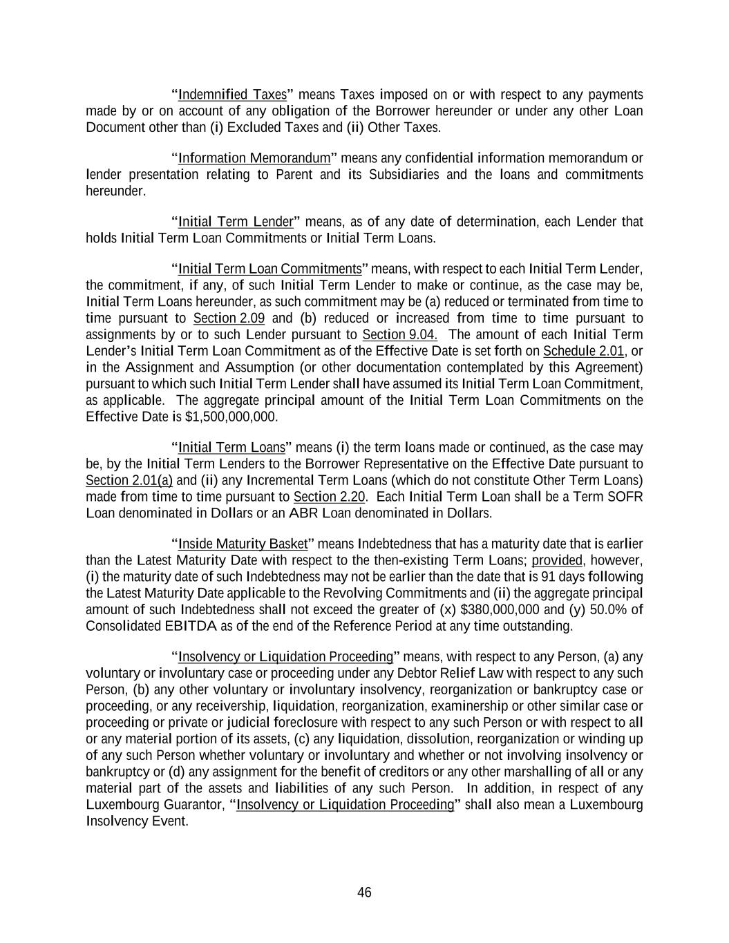 46 “Indemnified Taxes” means Taxes imposed on or with respect to any payments made by or on account of any obligation of the Borrower hereunder or under any other Loan Document other than (i) Excluded Taxes and (ii) Other Taxes. “Information Memorandum” means any confidential information memorandum or lender presentation relating to Parent and its Subsidiaries and the loans and commitments hereunder. “Initial Term Lender” means, as of any date of determination, each Lender that holds Initial Term Loan Commitments or Initial Term Loans. “Initial Term Loan Commitments” means, with respect to each Initial Term Lender, the commitment, if any, of such Initial Term Lender to make or continue, as the case may be, Initial Term Loans hereunder, as such commitment may be (a) reduced or terminated from time to time pursuant to Section 2.09 and (b) reduced or increased from time to time pursuant to assignments by or to such Lender pursuant to Section 9.04. The amount of each Initial Term Lender’s Initial Term Loan Commitment as of the Effective Date is set forth on Schedule 2.01, or in the Assignment and Assumption (or other documentation contemplated by this Agreement) pursuant to which such Initial Term Lender shall have assumed its Initial Term Loan Commitment, as applicable. The aggregate principal amount of the Initial Term Loan Commitments on the Effective Date is $1,500,000,000. “Initial Term Loans” means (i) the term loans made or continued, as the case may be, by the Initial Term Lenders to the Borrower Representative on the Effective Date pursuant to Section 2.01(a) and (ii) any Incremental Term Loans (which do not constitute Other Term Loans) made from time to time pursuant to Section 2.20. Each Initial Term Loan shall be a Term SOFR Loan denominated in Dollars or an ABR Loan denominated in Dollars. “Inside Maturity Basket” means Indebtedness that has a maturity date that is earlier than the Latest Maturity Date with respect to the then-existing Term Loans; provided, however, (i) the maturity date of such Indebtedness may not be earlier than the date that is 91 days following the Latest Maturity Date applicable to the Revolving Commitments and (ii) the aggregate principal amount of such Indebtedness shall not exceed the greater of (x) $380,000,000 and (y) 50.0% of Consolidated EBITDA as of the end of the Reference Period at any time outstanding. “Insolvency or Liquidation Proceeding” means, with respect to any Person, (a) any voluntary or involuntary case or proceeding under any Debtor Relief Law with respect to any such Person, (b) any other voluntary or involuntary insolvency, reorganization or bankruptcy case or proceeding, or any receivership, liquidation, reorganization, examinership or other similar case or proceeding or private or judicial foreclosure with respect to any such Person or with respect to all or any material portion of its assets, (c) any liquidation, dissolution, reorganization or winding up of any such Person whether voluntary or involuntary and whether or not involving insolvency or bankruptcy or (d) any assignment for the benefit of creditors or any other marshalling of all or any material part of the assets and liabilities of any such Person. In addition, in respect of any Luxembourg Guarantor, “Insolvency or Liquidation Proceeding” shall also mean a Luxembourg Insolvency Event.