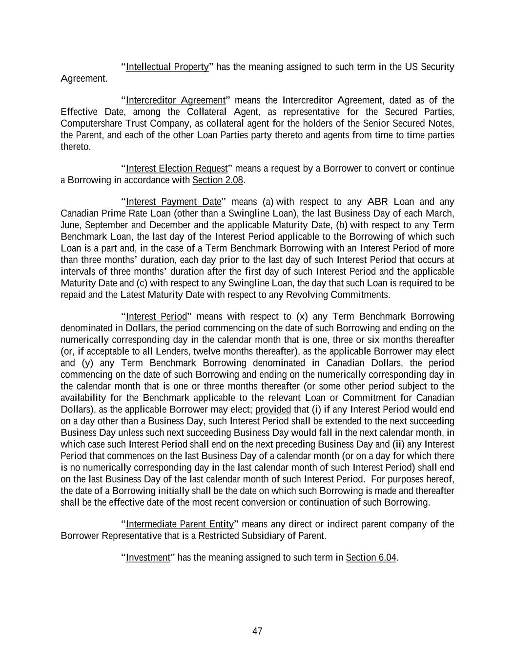 47 “Intellectual Property” has the meaning assigned to such term in the US Security Agreement. “Intercreditor Agreement” means the Intercreditor Agreement, dated as of the Effective Date, among the Collateral Agent, as representative for the Secured Parties, Computershare Trust Company, as collateral agent for the holders of the Senior Secured Notes, the Parent, and each of the other Loan Parties party thereto and agents from time to time parties thereto. “Interest Election Request” means a request by a Borrower to convert or continue a Borrowing in accordance with Section 2.08. “Interest Payment Date” means (a) with respect to any ABR Loan and any Canadian Prime Rate Loan (other than a Swingline Loan), the last Business Day of each March, June, September and December and the applicable Maturity Date, (b) with respect to any Term Benchmark Loan, the last day of the Interest Period applicable to the Borrowing of which such Loan is a part and, in the case of a Term Benchmark Borrowing with an Interest Period of more than three months’ duration, each day prior to the last day of such Interest Period that occurs at intervals of three months’ duration after the first day of such Interest Period and the applicable Maturity Date and (c) with respect to any Swingline Loan, the day that such Loan is required to be repaid and the Latest Maturity Date with respect to any Revolving Commitments. “Interest Period” means with respect to (x) any Term Benchmark Borrowing denominated in Dollars, the period commencing on the date of such Borrowing and ending on the numerically corresponding day in the calendar month that is one, three or six months thereafter (or, if acceptable to all Lenders, twelve months thereafter), as the applicable Borrower may elect and (y) any Term Benchmark Borrowing denominated in Canadian Dollars, the period commencing on the date of such Borrowing and ending on the numerically corresponding day in the calendar month that is one or three months thereafter (or some other period subject to the availability for the Benchmark applicable to the relevant Loan or Commitment for Canadian Dollars), as the applicable Borrower may elect; provided that (i) if any Interest Period would end on a day other than a Business Day, such Interest Period shall be extended to the next succeeding Business Day unless such next succeeding Business Day would fall in the next calendar month, in which case such Interest Period shall end on the next preceding Business Day and (ii) any Interest Period that commences on the last Business Day of a calendar month (or on a day for which there is no numerically corresponding day in the last calendar month of such Interest Period) shall end on the last Business Day of the last calendar month of such Interest Period. For purposes hereof, the date of a Borrowing initially shall be the date on which such Borrowing is made and thereafter shall be the effective date of the most recent conversion or continuation of such Borrowing. “Intermediate Parent Entity” means any direct or indirect parent company of the Borrower Representative that is a Restricted Subsidiary of Parent. “Investment” has the meaning assigned to such term in Section 6.04.
