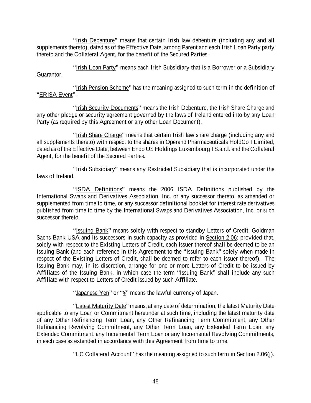 48 “Irish Debenture” means that certain Irish law debenture (including any and all supplements thereto), dated as of the Effective Date, among Parent and each Irish Loan Party party thereto and the Collateral Agent, for the benefit of the Secured Parties. “Irish Loan Party” means each Irish Subsidiary that is a Borrower or a Subsidiary Guarantor. “Irish Pension Scheme” has the meaning assigned to such term in the definition of “ERISA Event”. “Irish Security Documents” means the Irish Debenture, the Irish Share Charge and any other pledge or security agreement governed by the laws of Ireland entered into by any Loan Party (as required by this Agreement or any other Loan Document). “Irish Share Charge” means that certain Irish law share charge (including any and all supplements thereto) with respect to the shares in Operand Pharmaceuticals HoldCo I Limited, dated as of the Effective Date, between Endo US Holdings Luxembourg I S.a.r.l. and the Collateral Agent, for the benefit of the Secured Parties. “Irish Subsidiary” means any Restricted Subsidiary that is incorporated under the laws of Ireland. “ISDA Definitions” means the 2006 ISDA Definitions published by the International Swaps and Derivatives Association, Inc. or any successor thereto, as amended or supplemented from time to time, or any successor definitional booklet for interest rate derivatives published from time to time by the International Swaps and Derivatives Association, Inc. or such successor thereto. “Issuing Bank” means solely with respect to standby Letters of Credit, Goldman Sachs Bank USA and its successors in such capacity as provided in Section 2.06; provided that, solely with respect to the Existing Letters of Credit, each issuer thereof shall be deemed to be an Issuing Bank (and each reference in this Agreement to the “Issuing Bank” solely when made in respect of the Existing Letters of Credit, shall be deemed to refer to each issuer thereof). The Issuing Bank may, in its discretion, arrange for one or more Letters of Credit to be issued by Affiliates of the Issuing Bank, in which case the term “Issuing Bank” shall include any such Affiliate with respect to Letters of Credit issued by such Affiliate. “Japanese Yen” or “¥” means the lawful currency of Japan. “Latest Maturity Date” means, at any date of determination, the latest Maturity Date applicable to any Loan or Commitment hereunder at such time, including the latest maturity date of any Other Refinancing Term Loan, any Other Refinancing Term Commitment, any Other Refinancing Revolving Commitment, any Other Term Loan, any Extended Term Loan, any Extended Commitment, any Incremental Term Loan or any Incremental Revolving Commitments, in each case as extended in accordance with this Agreement from time to time. “LC Collateral Account” has the meaning assigned to such term in Section 2.06(j).
