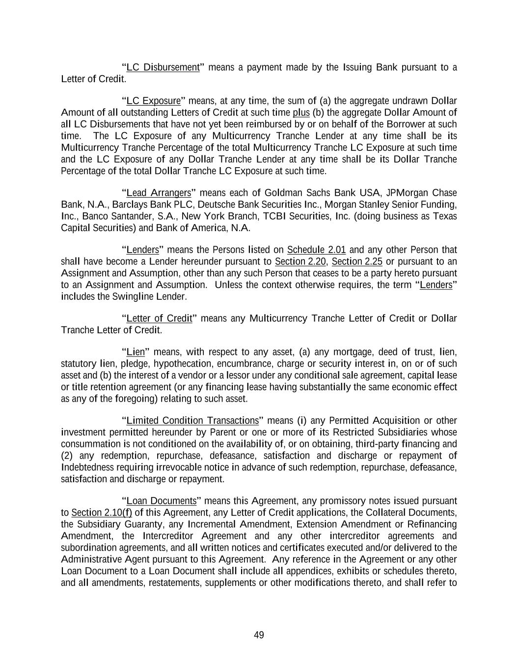 49 “LC Disbursement” means a payment made by the Issuing Bank pursuant to a Letter of Credit. “LC Exposure” means, at any time, the sum of (a) the aggregate undrawn Dollar Amount of all outstanding Letters of Credit at such time plus (b) the aggregate Dollar Amount of all LC Disbursements that have not yet been reimbursed by or on behalf of the Borrower at such time. The LC Exposure of any Multicurrency Tranche Lender at any time shall be its Multicurrency Tranche Percentage of the total Multicurrency Tranche LC Exposure at such time and the LC Exposure of any Dollar Tranche Lender at any time shall be its Dollar Tranche Percentage of the total Dollar Tranche LC Exposure at such time. “Lead Arrangers” means each of Goldman Sachs Bank USA, JPMorgan Chase Bank, N.A., Barclays Bank PLC, Deutsche Bank Securities Inc., Morgan Stanley Senior Funding, Inc., Banco Santander, S.A., New York Branch, TCBI Securities, Inc. (doing business as Texas Capital Securities) and Bank of America, N.A. “Lenders” means the Persons listed on Schedule 2.01 and any other Person that shall have become a Lender hereunder pursuant to Section 2.20, Section 2.25 or pursuant to an Assignment and Assumption, other than any such Person that ceases to be a party hereto pursuant to an Assignment and Assumption. Unless the context otherwise requires, the term “Lenders” includes the Swingline Lender. “Letter of Credit” means any Multicurrency Tranche Letter of Credit or Dollar Tranche Letter of Credit. “Lien” means, with respect to any asset, (a) any mortgage, deed of trust, lien, statutory lien, pledge, hypothecation, encumbrance, charge or security interest in, on or of such asset and (b) the interest of a vendor or a lessor under any conditional sale agreement, capital lease or title retention agreement (or any financing lease having substantially the same economic effect as any of the foregoing) relating to such asset. “Limited Condition Transactions” means (i) any Permitted Acquisition or other investment permitted hereunder by Parent or one or more of its Restricted Subsidiaries whose consummation is not conditioned on the availability of, or on obtaining, third-party financing and (2) any redemption, repurchase, defeasance, satisfaction and discharge or repayment of Indebtedness requiring irrevocable notice in advance of such redemption, repurchase, defeasance, satisfaction and discharge or repayment. “Loan Documents” means this Agreement, any promissory notes issued pursuant to Section 2.10(f) of this Agreement, any Letter of Credit applications, the Collateral Documents, the Subsidiary Guaranty, any Incremental Amendment, Extension Amendment or Refinancing Amendment, the Intercreditor Agreement and any other intercreditor agreements and subordination agreements, and all written notices and certificates executed and/or delivered to the Administrative Agent pursuant to this Agreement. Any reference in the Agreement or any other Loan Document to a Loan Document shall include all appendices, exhibits or schedules thereto, and all amendments, restatements, supplements or other modifications thereto, and shall refer to