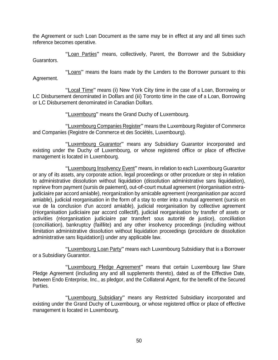50 the Agreement or such Loan Document as the same may be in effect at any and all times such reference becomes operative. “Loan Parties” means, collectively, Parent, the Borrower and the Subsidiary Guarantors. “Loans” means the loans made by the Lenders to the Borrower pursuant to this Agreement. “Local Time” means (i) New York City time in the case of a Loan, Borrowing or LC Disbursement denominated in Dollars and (ii) Toronto time in the case of a Loan, Borrowing or LC Disbursement denominated in Canadian Dollars. “Luxembourg” means the Grand Duchy of Luxembourg. “Luxembourg Companies Register” means the Luxembourg Register of Commerce and Companies (Registre de Commerce et des Sociétés, Luxembourg). “Luxembourg Guarantor” means any Subsidiary Guarantor incorporated and existing under the Duchy of Luxembourg, or whose registered office or place of effective management is located in Luxembourg. “Luxembourg Insolvency Event” means, in relation to each Luxembourg Guarantor or any of its assets, any corporate action, legal proceedings or other procedure or step in relation to administrative dissolution without liquidation (dissolution administrative sans liquidation), reprieve from payment (sursis de paiement), out-of-court mutual agreement (réorganisation extra- judiciaire par accord amiable), reorganization by amicable agreement (reorganisation par accord amiable), judicial reorganisation in the form of a stay to enter into a mutual agreement (sursis en vue de la conclusion d'un accord amiable), judicial reorganisation by collective agreement (réorganisation judiciaire par accord collectif), judicial reorganisation by transfer of assets or activities (réorganisation judiciaire par transfert sous autorité de justice), conciliation (conciliation), bankruptcy (faillite) and any other insolvency proceedings (including without limitation administrative dissolution without liquidation proceedings (procédure de dissolution administrative sans liquidation)) under any applicable law. “Luxembourg Loan Party” means each Luxembourg Subsidiary that is a Borrower or a Subsidiary Guarantor. “Luxembourg Pledge Agreement” means that certain Luxembourg law Share Pledge Agreement (including any and all supplements thereto), dated as of the Effective Date, between Endo Enterprise, Inc., as pledgor, and the Collateral Agent, for the benefit of the Secured Parties. “Luxembourg Subsidiary” means any Restricted Subsidiary incorporated and existing under the Grand Duchy of Luxembourg, or whose registered office or place of effective management is located in Luxembourg.