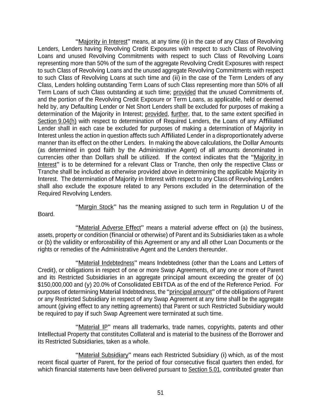 51 “Majority in Interest” means, at any time (i) in the case of any Class of Revolving Lenders, Lenders having Revolving Credit Exposures with respect to such Class of Revolving Loans and unused Revolving Commitments with respect to such Class of Revolving Loans representing more than 50% of the sum of the aggregate Revolving Credit Exposures with respect to such Class of Revolving Loans and the unused aggregate Revolving Commitments with respect to such Class of Revolving Loans at such time and (ii) in the case of the Term Lenders of any Class, Lenders holding outstanding Term Loans of such Class representing more than 50% of all Term Loans of such Class outstanding at such time; provided that the unused Commitments of, and the portion of the Revolving Credit Exposure or Term Loans, as applicable, held or deemed held by, any Defaulting Lender or Net Short Lenders shall be excluded for purposes of making a determination of the Majority in Interest; provided, further, that, to the same extent specified in Section 9.04(h) with respect to determination of Required Lenders, the Loans of any Affiliated Lender shall in each case be excluded for purposes of making a determination of Majority in Interest unless the action in question affects such Affiliated Lender in a disproportionately adverse manner than its effect on the other Lenders. In making the above calculations, the Dollar Amounts (as determined in good faith by the Administrative Agent) of all amounts denominated in currencies other than Dollars shall be utilized. If the context indicates that the “Majority in Interest” is to be determined for a relevant Class or Tranche, then only the respective Class or Tranche shall be included as otherwise provided above in determining the applicable Majority in Interest. The determination of Majority in Interest with respect to any Class of Revolving Lenders shall also exclude the exposure related to any Persons excluded in the determination of the Required Revolving Lenders. “Margin Stock” has the meaning assigned to such term in Regulation U of the Board. “Material Adverse Effect” means a material adverse effect on (a) the business, assets, property or condition (financial or otherwise) of Parent and its Subsidiaries taken as a whole or (b) the validity or enforceability of this Agreement or any and all other Loan Documents or the rights or remedies of the Administrative Agent and the Lenders thereunder. “Material Indebtedness” means Indebtedness (other than the Loans and Letters of Credit), or obligations in respect of one or more Swap Agreements, of any one or more of Parent and its Restricted Subsidiaries in an aggregate principal amount exceeding the greater of (x) $150,000,000 and (y) 20.0% of Consolidated EBITDA as of the end of the Reference Period. For purposes of determining Material Indebtedness, the “principal amount” of the obligations of Parent or any Restricted Subsidiary in respect of any Swap Agreement at any time shall be the aggregate amount (giving effect to any netting agreements) that Parent or such Restricted Subsidiary would be required to pay if such Swap Agreement were terminated at such time. “Material IP” means all trademarks, trade names, copyrights, patents and other Intellectual Property that constitutes Collateral and is material to the business of the Borrower and its Restricted Subsidiaries, taken as a whole. “Material Subsidiary” means each Restricted Subsidiary (i) which, as of the most recent fiscal quarter of Parent, for the period of four consecutive fiscal quarters then ended, for which financial statements have been delivered pursuant to Section 5.01, contributed greater than