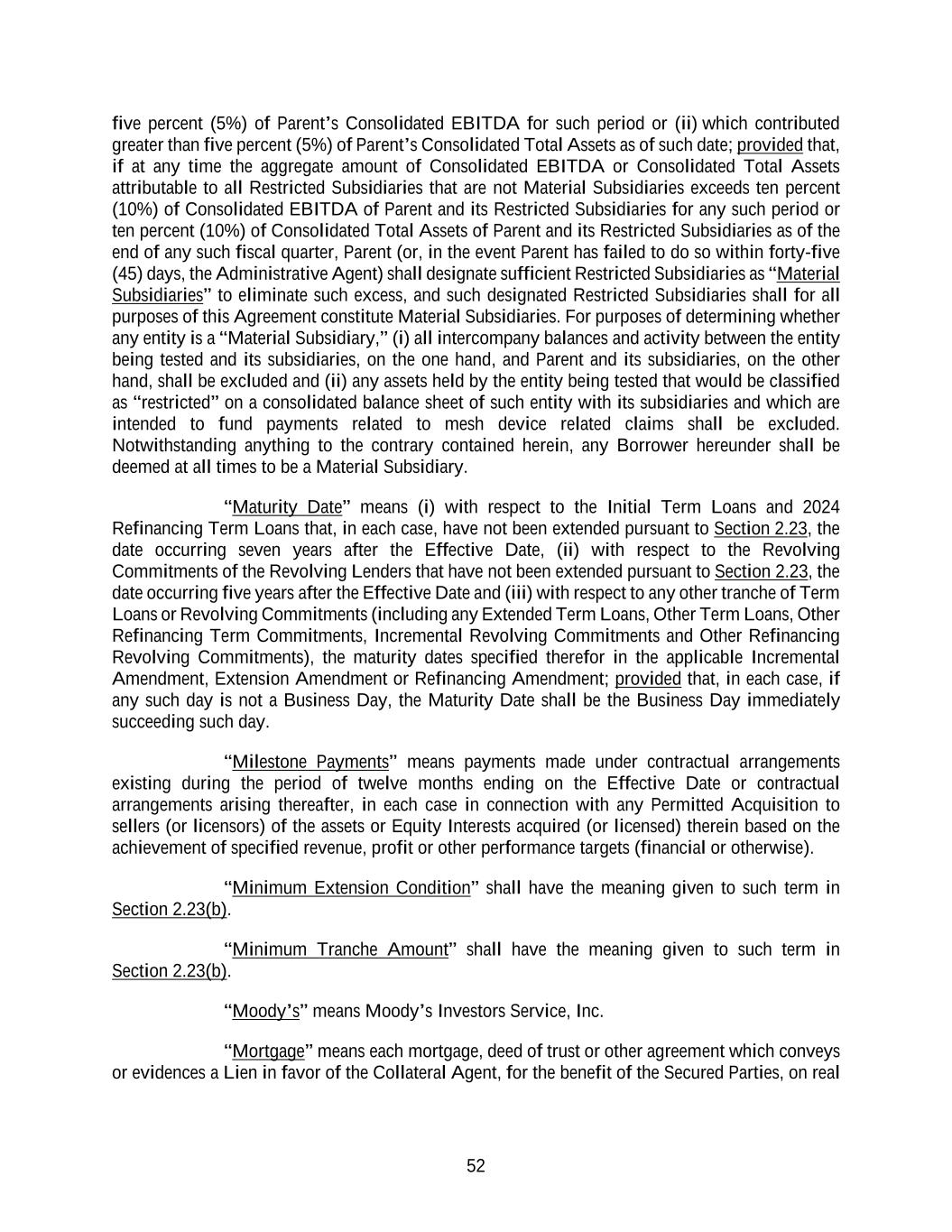 52 five percent (5%) of Parent’s Consolidated EBITDA for such period or (ii) which contributed greater than five percent (5%) of Parent’s Consolidated Total Assets as of such date; provided that, if at any time the aggregate amount of Consolidated EBITDA or Consolidated Total Assets attributable to all Restricted Subsidiaries that are not Material Subsidiaries exceeds ten percent (10%) of Consolidated EBITDA of Parent and its Restricted Subsidiaries for any such period or ten percent (10%) of Consolidated Total Assets of Parent and its Restricted Subsidiaries as of the end of any such fiscal quarter, Parent (or, in the event Parent has failed to do so within forty-five (45) days, the Administrative Agent) shall designate sufficient Restricted Subsidiaries as “Material Subsidiaries” to eliminate such excess, and such designated Restricted Subsidiaries shall for all purposes of this Agreement constitute Material Subsidiaries. For purposes of determining whether any entity is a “Material Subsidiary,” (i) all intercompany balances and activity between the entity being tested and its subsidiaries, on the one hand, and Parent and its subsidiaries, on the other hand, shall be excluded and (ii) any assets held by the entity being tested that would be classified as “restricted” on a consolidated balance sheet of such entity with its subsidiaries and which are intended to fund payments related to mesh device related claims shall be excluded. Notwithstanding anything to the contrary contained herein, any Borrower hereunder shall be deemed at all times to be a Material Subsidiary. “Maturity Date” means (i) with respect to the Initial Term Loans and 2024 Refinancing Term Loans that, in each case, have not been extended pursuant to Section 2.23, the date occurring seven years after the Effective Date, (ii) with respect to the Revolving Commitments of the Revolving Lenders that have not been extended pursuant to Section 2.23, the date occurring five years after the Effective Date and (iii) with respect to any other tranche of Term Loans or Revolving Commitments (including any Extended Term Loans, Other Term Loans, Other Refinancing Term Commitments, Incremental Revolving Commitments and Other Refinancing Revolving Commitments), the maturity dates specified therefor in the applicable Incremental Amendment, Extension Amendment or Refinancing Amendment; provided that, in each case, if any such day is not a Business Day, the Maturity Date shall be the Business Day immediately succeeding such day. “Milestone Payments” means payments made under contractual arrangements existing during the period of twelve months ending on the Effective Date or contractual arrangements arising thereafter, in each case in connection with any Permitted Acquisition to sellers (or licensors) of the assets or Equity Interests acquired (or licensed) therein based on the achievement of specified revenue, profit or other performance targets (financial or otherwise). “Minimum Extension Condition” shall have the meaning given to such term in Section 2.23(b). “Minimum Tranche Amount” shall have the meaning given to such term in Section 2.23(b). “Moody’s” means Moody’s Investors Service, Inc. “Mortgage” means each mortgage, deed of trust or other agreement which conveys or evidences a Lien in favor of the Collateral Agent, for the benefit of the Secured Parties, on real