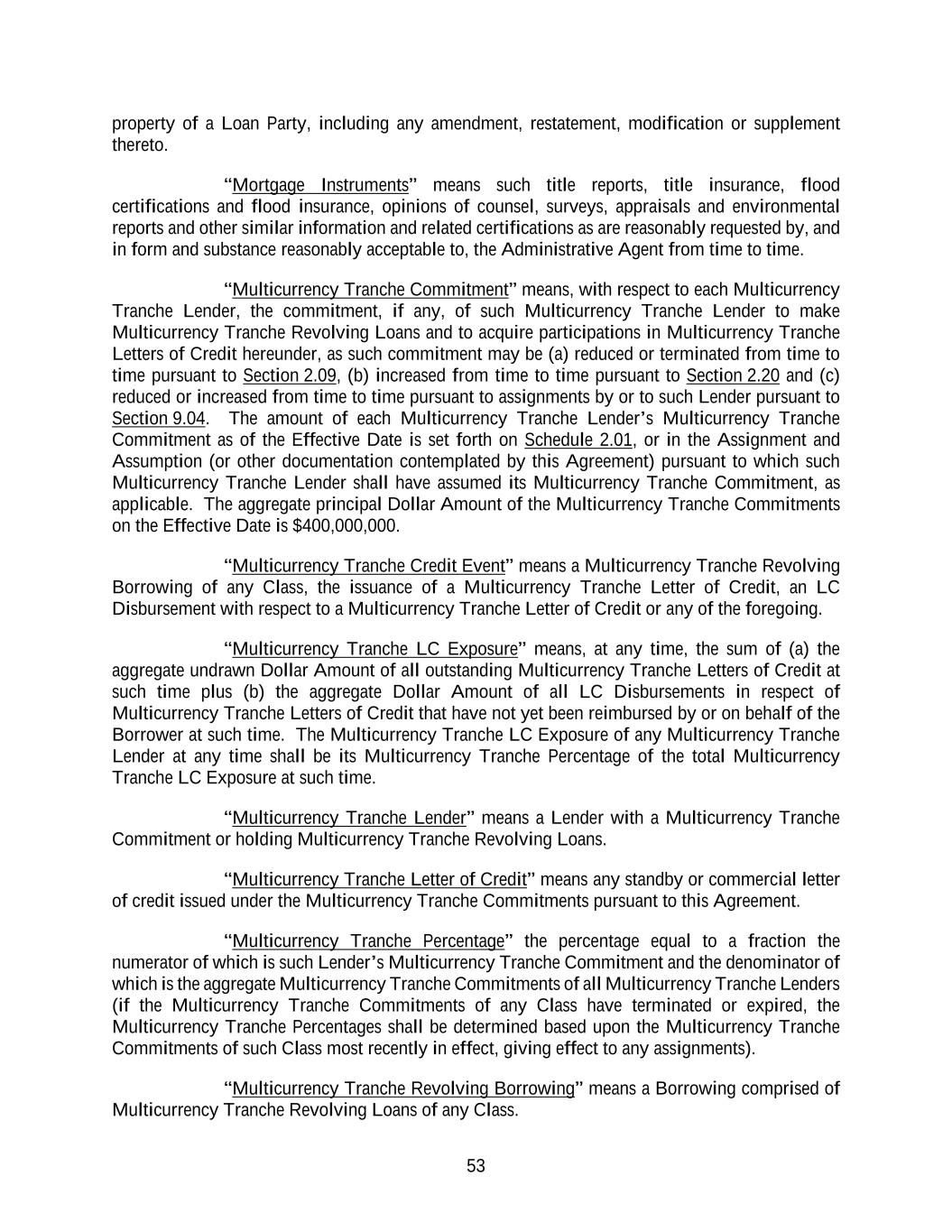 53 property of a Loan Party, including any amendment, restatement, modification or supplement thereto. “Mortgage Instruments” means such title reports, title insurance, flood certifications and flood insurance, opinions of counsel, surveys, appraisals and environmental reports and other similar information and related certifications as are reasonably requested by, and in form and substance reasonably acceptable to, the Administrative Agent from time to time. “Multicurrency Tranche Commitment” means, with respect to each Multicurrency Tranche Lender, the commitment, if any, of such Multicurrency Tranche Lender to make Multicurrency Tranche Revolving Loans and to acquire participations in Multicurrency Tranche Letters of Credit hereunder, as such commitment may be (a) reduced or terminated from time to time pursuant to Section 2.09, (b) increased from time to time pursuant to Section 2.20 and (c) reduced or increased from time to time pursuant to assignments by or to such Lender pursuant to Section 9.04. The amount of each Multicurrency Tranche Lender’s Multicurrency Tranche Commitment as of the Effective Date is set forth on Schedule 2.01, or in the Assignment and Assumption (or other documentation contemplated by this Agreement) pursuant to which such Multicurrency Tranche Lender shall have assumed its Multicurrency Tranche Commitment, as applicable. The aggregate principal Dollar Amount of the Multicurrency Tranche Commitments on the Effective Date is $400,000,000. “Multicurrency Tranche Credit Event” means a Multicurrency Tranche Revolving Borrowing of any Class, the issuance of a Multicurrency Tranche Letter of Credit, an LC Disbursement with respect to a Multicurrency Tranche Letter of Credit or any of the foregoing. “Multicurrency Tranche LC Exposure” means, at any time, the sum of (a) the aggregate undrawn Dollar Amount of all outstanding Multicurrency Tranche Letters of Credit at such time plus (b) the aggregate Dollar Amount of all LC Disbursements in respect of Multicurrency Tranche Letters of Credit that have not yet been reimbursed by or on behalf of the Borrower at such time. The Multicurrency Tranche LC Exposure of any Multicurrency Tranche Lender at any time shall be its Multicurrency Tranche Percentage of the total Multicurrency Tranche LC Exposure at such time. “Multicurrency Tranche Lender” means a Lender with a Multicurrency Tranche Commitment or holding Multicurrency Tranche Revolving Loans. “Multicurrency Tranche Letter of Credit” means any standby or commercial letter of credit issued under the Multicurrency Tranche Commitments pursuant to this Agreement. “Multicurrency Tranche Percentage” the percentage equal to a fraction the numerator of which is such Lender’s Multicurrency Tranche Commitment and the denominator of which is the aggregate Multicurrency Tranche Commitments of all Multicurrency Tranche Lenders (if the Multicurrency Tranche Commitments of any Class have terminated or expired, the Multicurrency Tranche Percentages shall be determined based upon the Multicurrency Tranche Commitments of such Class most recently in effect, giving effect to any assignments). “Multicurrency Tranche Revolving Borrowing” means a Borrowing comprised of Multicurrency Tranche Revolving Loans of any Class.