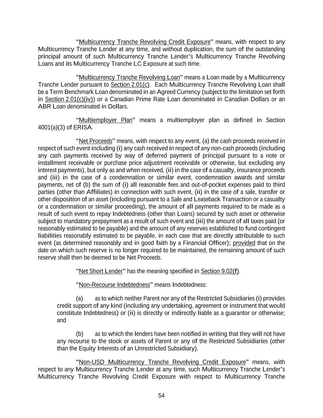 54 “Multicurrency Tranche Revolving Credit Exposure” means, with respect to any Multicurrency Tranche Lender at any time, and without duplication, the sum of the outstanding principal amount of such Multicurrency Tranche Lender’s Multicurrency Tranche Revolving Loans and its Multicurrency Tranche LC Exposure at such time. “Multicurrency Tranche Revolving Loan” means a Loan made by a Multicurrency Tranche Lender pursuant to Section 2.01(c). Each Multicurrency Tranche Revolving Loan shall be a Term Benchmark Loan denominated in an Agreed Currency (subject to the limitation set forth in Section 2.01(c)(iv)) or a Canadian Prime Rate Loan denominated in Canadian Dollars or an ABR Loan denominated in Dollars. “Multiemployer Plan” means a multiemployer plan as defined in Section 4001(a)(3) of ERISA. “Net Proceeds” means, with respect to any event, (a) the cash proceeds received in respect of such event including (i) any cash received in respect of any non-cash proceeds (including any cash payments received by way of deferred payment of principal pursuant to a note or installment receivable or purchase price adjustment receivable or otherwise, but excluding any interest payments), but only as and when received, (ii) in the case of a casualty, insurance proceeds and (iii) in the case of a condemnation or similar event, condemnation awards and similar payments, net of (b) the sum of (i) all reasonable fees and out-of-pocket expenses paid to third parties (other than Affiliates) in connection with such event, (ii) in the case of a sale, transfer or other disposition of an asset (including pursuant to a Sale and Leaseback Transaction or a casualty or a condemnation or similar proceeding), the amount of all payments required to be made as a result of such event to repay Indebtedness (other than Loans) secured by such asset or otherwise subject to mandatory prepayment as a result of such event and (iii) the amount of all taxes paid (or reasonably estimated to be payable) and the amount of any reserves established to fund contingent liabilities reasonably estimated to be payable, in each case that are directly attributable to such event (as determined reasonably and in good faith by a Financial Officer); provided that on the date on which such reserve is no longer required to be maintained, the remaining amount of such reserve shall then be deemed to be Net Proceeds. “Net Short Lender” has the meaning specified in Section 9.02(f). “Non-Recourse Indebtedness” means Indebtedness: (a) as to which neither Parent nor any of the Restricted Subsidiaries (i) provides credit support of any kind (including any undertaking, agreement or instrument that would constitute Indebtedness) or (ii) is directly or indirectly liable as a guarantor or otherwise; and (b) as to which the lenders have been notified in writing that they will not have any recourse to the stock or assets of Parent or any of the Restricted Subsidiaries (other than the Equity Interests of an Unrestricted Subsidiary). “Non-USD Multicurrency Tranche Revolving Credit Exposure” means, with respect to any Multicurrency Tranche Lender at any time, such Multicurrency Tranche Lender’s Multicurrency Tranche Revolving Credit Exposure with respect to Multicurrency Tranche