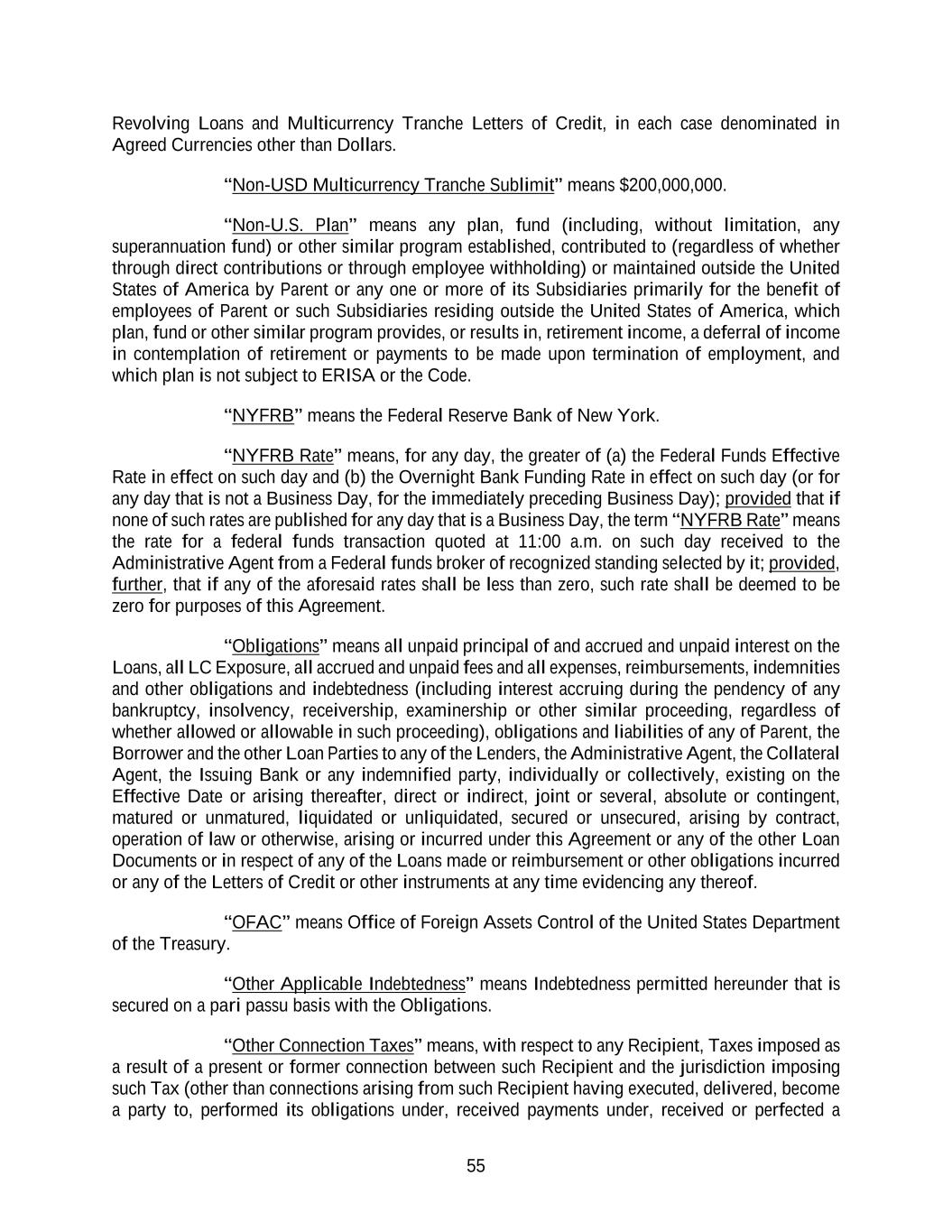 55 Revolving Loans and Multicurrency Tranche Letters of Credit, in each case denominated in Agreed Currencies other than Dollars. “Non-USD Multicurrency Tranche Sublimit” means $200,000,000. “Non-U.S. Plan” means any plan, fund (including, without limitation, any superannuation fund) or other similar program established, contributed to (regardless of whether through direct contributions or through employee withholding) or maintained outside the United States of America by Parent or any one or more of its Subsidiaries primarily for the benefit of employees of Parent or such Subsidiaries residing outside the United States of America, which plan, fund or other similar program provides, or results in, retirement income, a deferral of income in contemplation of retirement or payments to be made upon termination of employment, and which plan is not subject to ERISA or the Code. “NYFRB” means the Federal Reserve Bank of New York. “NYFRB Rate” means, for any day, the greater of (a) the Federal Funds Effective Rate in effect on such day and (b) the Overnight Bank Funding Rate in effect on such day (or for any day that is not a Business Day, for the immediately preceding Business Day); provided that if none of such rates are published for any day that is a Business Day, the term “NYFRB Rate” means the rate for a federal funds transaction quoted at 11:00 a.m. on such day received to the Administrative Agent from a Federal funds broker of recognized standing selected by it; provided, further, that if any of the aforesaid rates shall be less than zero, such rate shall be deemed to be zero for purposes of this Agreement. “Obligations” means all unpaid principal of and accrued and unpaid interest on the Loans, all LC Exposure, all accrued and unpaid fees and all expenses, reimbursements, indemnities and other obligations and indebtedness (including interest accruing during the pendency of any bankruptcy, insolvency, receivership, examinership or other similar proceeding, regardless of whether allowed or allowable in such proceeding), obligations and liabilities of any of Parent, the Borrower and the other Loan Parties to any of the Lenders, the Administrative Agent, the Collateral Agent, the Issuing Bank or any indemnified party, individually or collectively, existing on the Effective Date or arising thereafter, direct or indirect, joint or several, absolute or contingent, matured or unmatured, liquidated or unliquidated, secured or unsecured, arising by contract, operation of law or otherwise, arising or incurred under this Agreement or any of the other Loan Documents or in respect of any of the Loans made or reimbursement or other obligations incurred or any of the Letters of Credit or other instruments at any time evidencing any thereof. “OFAC” means Office of Foreign Assets Control of the United States Department of the Treasury. “Other Applicable Indebtedness” means Indebtedness permitted hereunder that is secured on a pari passu basis with the Obligations. “Other Connection Taxes” means, with respect to any Recipient, Taxes imposed as a result of a present or former connection between such Recipient and the jurisdiction imposing such Tax (other than connections arising from such Recipient having executed, delivered, become a party to, performed its obligations under, received payments under, received or perfected a