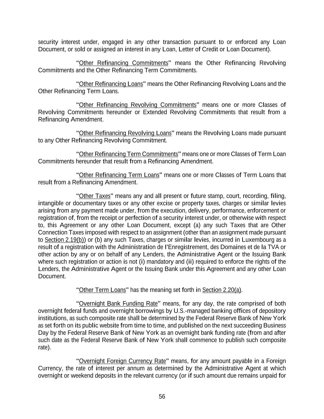 56 security interest under, engaged in any other transaction pursuant to or enforced any Loan Document, or sold or assigned an interest in any Loan, Letter of Credit or Loan Document). “Other Refinancing Commitments” means the Other Refinancing Revolving Commitments and the Other Refinancing Term Commitments. “Other Refinancing Loans” means the Other Refinancing Revolving Loans and the Other Refinancing Term Loans. “Other Refinancing Revolving Commitments” means one or more Classes of Revolving Commitments hereunder or Extended Revolving Commitments that result from a Refinancing Amendment. “Other Refinancing Revolving Loans” means the Revolving Loans made pursuant to any Other Refinancing Revolving Commitment. “Other Refinancing Term Commitments” means one or more Classes of Term Loan Commitments hereunder that result from a Refinancing Amendment. “Other Refinancing Term Loans” means one or more Classes of Term Loans that result from a Refinancing Amendment. “Other Taxes” means any and all present or future stamp, court, recording, filing, intangible or documentary taxes or any other excise or property taxes, charges or similar levies arising from any payment made under, from the execution, delivery, performance, enforcement or registration of, from the receipt or perfection of a security interest under, or otherwise with respect to, this Agreement or any other Loan Document, except (a) any such Taxes that are Other Connection Taxes imposed with respect to an assignment (other than an assignment made pursuant to Section 2.19(b)) or (b) any such Taxes, charges or similar levies, incurred in Luxembourg as a result of a registration with the Administration de I'Enregistrement, des Domaines et de la TVA or other action by any or on behalf of any Lenders, the Administrative Agent or the Issuing Bank where such registration or action is not (i) mandatory and (ii) required to enforce the rights of the Lenders, the Administrative Agent or the Issuing Bank under this Agreement and any other Loan Document. “Other Term Loans” has the meaning set forth in Section 2.20(a). “Overnight Bank Funding Rate” means, for any day, the rate comprised of both overnight federal funds and overnight borrowings by U.S.-managed banking offices of depository institutions, as such composite rate shall be determined by the Federal Reserve Bank of New York as set forth on its public website from time to time, and published on the next succeeding Business Day by the Federal Reserve Bank of New York as an overnight bank funding rate (from and after such date as the Federal Reserve Bank of New York shall commence to publish such composite rate). “Overnight Foreign Currency Rate” means, for any amount payable in a Foreign Currency, the rate of interest per annum as determined by the Administrative Agent at which overnight or weekend deposits in the relevant currency (or if such amount due remains unpaid for