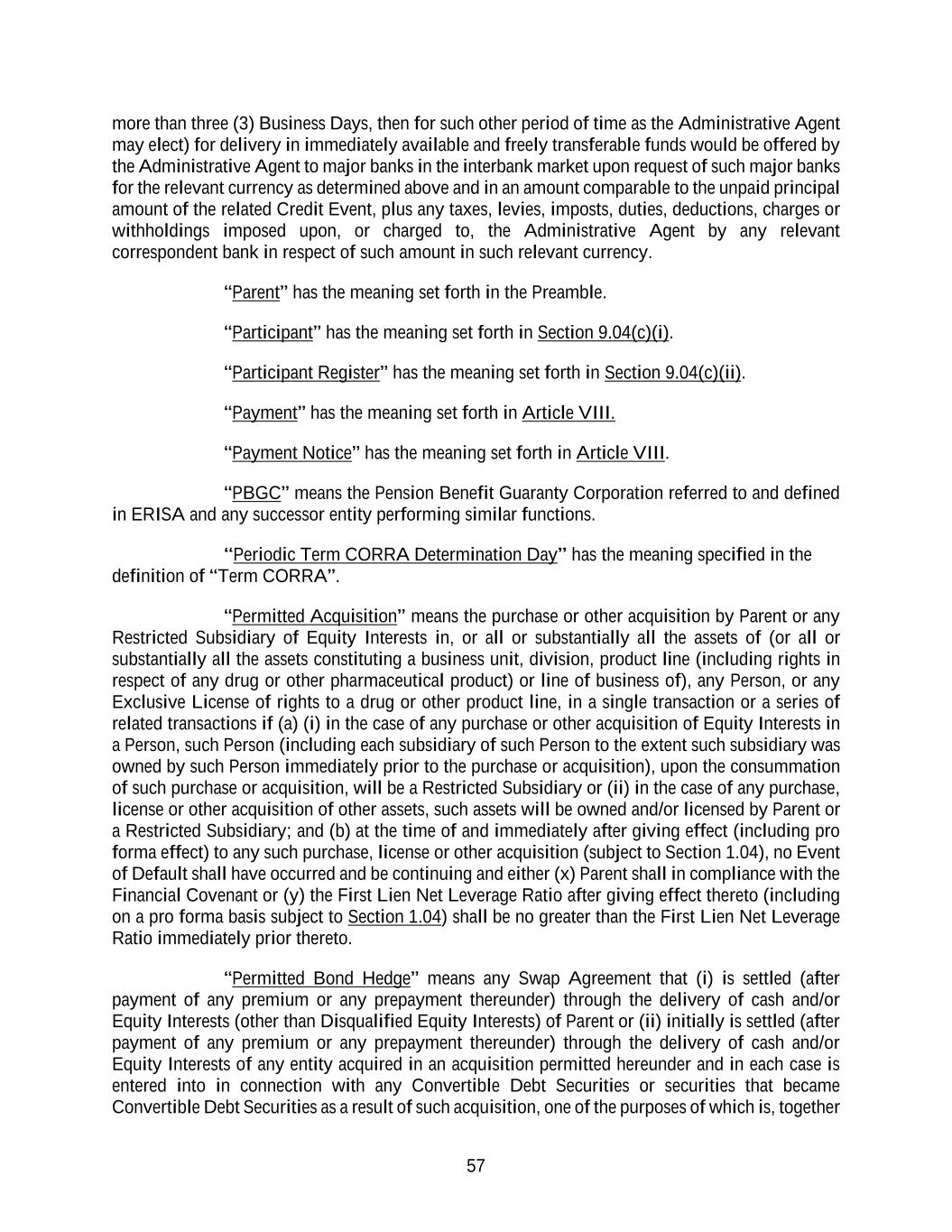 57 more than three (3) Business Days, then for such other period of time as the Administrative Agent may elect) for delivery in immediately available and freely transferable funds would be offered by the Administrative Agent to major banks in the interbank market upon request of such major banks for the relevant currency as determined above and in an amount comparable to the unpaid principal amount of the related Credit Event, plus any taxes, levies, imposts, duties, deductions, charges or withholdings imposed upon, or charged to, the Administrative Agent by any relevant correspondent bank in respect of such amount in such relevant currency. “Parent” has the meaning set forth in the Preamble. “Participant” has the meaning set forth in Section 9.04(c)(i). “Participant Register” has the meaning set forth in Section 9.04(c)(ii). “Payment” has the meaning set forth in Article VIII. “Payment Notice” has the meaning set forth in Article VIII. “PBGC” means the Pension Benefit Guaranty Corporation referred to and defined in ERISA and any successor entity performing similar functions. “Periodic Term CORRA Determination Day” has the meaning specified in the definition of “Term CORRA”. “Permitted Acquisition” means the purchase or other acquisition by Parent or any Restricted Subsidiary of Equity Interests in, or all or substantially all the assets of (or all or substantially all the assets constituting a business unit, division, product line (including rights in respect of any drug or other pharmaceutical product) or line of business of), any Person, or any Exclusive License of rights to a drug or other product line, in a single transaction or a series of related transactions if (a) (i) in the case of any purchase or other acquisition of Equity Interests in a Person, such Person (including each subsidiary of such Person to the extent such subsidiary was owned by such Person immediately prior to the purchase or acquisition), upon the consummation of such purchase or acquisition, will be a Restricted Subsidiary or (ii) in the case of any purchase, license or other acquisition of other assets, such assets will be owned and/or licensed by Parent or a Restricted Subsidiary; and (b) at the time of and immediately after giving effect (including pro forma effect) to any such purchase, license or other acquisition (subject to Section 1.04), no Event of Default shall have occurred and be continuing and either (x) Parent shall in compliance with the Financial Covenant or (y) the First Lien Net Leverage Ratio after giving effect thereto (including on a pro forma basis subject to Section 1.04) shall be no greater than the First Lien Net Leverage Ratio immediately prior thereto. “Permitted Bond Hedge” means any Swap Agreement that (i) is settled (after payment of any premium or any prepayment thereunder) through the delivery of cash and/or Equity Interests (other than Disqualified Equity Interests) of Parent or (ii) initially is settled (after payment of any premium or any prepayment thereunder) through the delivery of cash and/or Equity Interests of any entity acquired in an acquisition permitted hereunder and in each case is entered into in connection with any Convertible Debt Securities or securities that became Convertible Debt Securities as a result of such acquisition, one of the purposes of which is, together