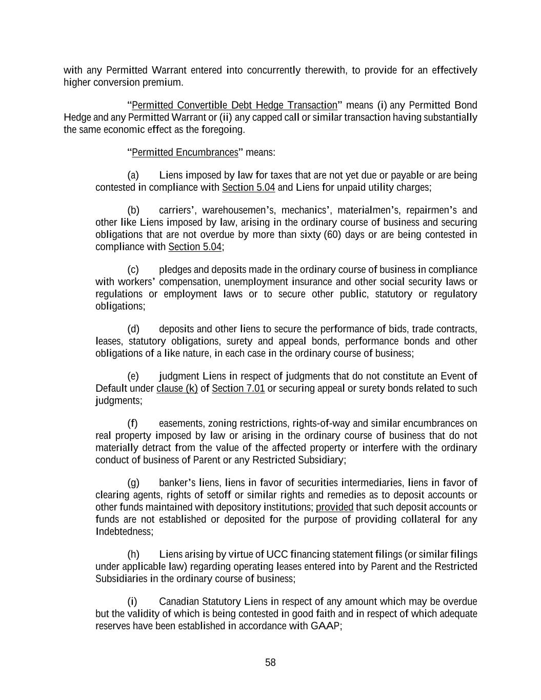58 with any Permitted Warrant entered into concurrently therewith, to provide for an effectively higher conversion premium. “Permitted Convertible Debt Hedge Transaction” means (i) any Permitted Bond Hedge and any Permitted Warrant or (ii) any capped call or similar transaction having substantially the same economic effect as the foregoing. “Permitted Encumbrances” means: (a) Liens imposed by law for taxes that are not yet due or payable or are being contested in compliance with Section 5.04 and Liens for unpaid utility charges; (b) carriers’, warehousemen’s, mechanics’, materialmen’s, repairmen’s and other like Liens imposed by law, arising in the ordinary course of business and securing obligations that are not overdue by more than sixty (60) days or are being contested in compliance with Section 5.04; (c) pledges and deposits made in the ordinary course of business in compliance with workers’ compensation, unemployment insurance and other social security laws or regulations or employment laws or to secure other public, statutory or regulatory obligations; (d) deposits and other liens to secure the performance of bids, trade contracts, leases, statutory obligations, surety and appeal bonds, performance bonds and other obligations of a like nature, in each case in the ordinary course of business; (e) judgment Liens in respect of judgments that do not constitute an Event of Default under clause (k) of Section 7.01 or securing appeal or surety bonds related to such judgments; (f) easements, zoning restrictions, rights-of-way and similar encumbrances on real property imposed by law or arising in the ordinary course of business that do not materially detract from the value of the affected property or interfere with the ordinary conduct of business of Parent or any Restricted Subsidiary; (g) banker’s liens, liens in favor of securities intermediaries, liens in favor of clearing agents, rights of setoff or similar rights and remedies as to deposit accounts or other funds maintained with depository institutions; provided that such deposit accounts or funds are not established or deposited for the purpose of providing collateral for any Indebtedness; (h) Liens arising by virtue of UCC financing statement filings (or similar filings under applicable law) regarding operating leases entered into by Parent and the Restricted Subsidiaries in the ordinary course of business; (i) Canadian Statutory Liens in respect of any amount which may be overdue but the validity of which is being contested in good faith and in respect of which adequate reserves have been established in accordance with GAAP;