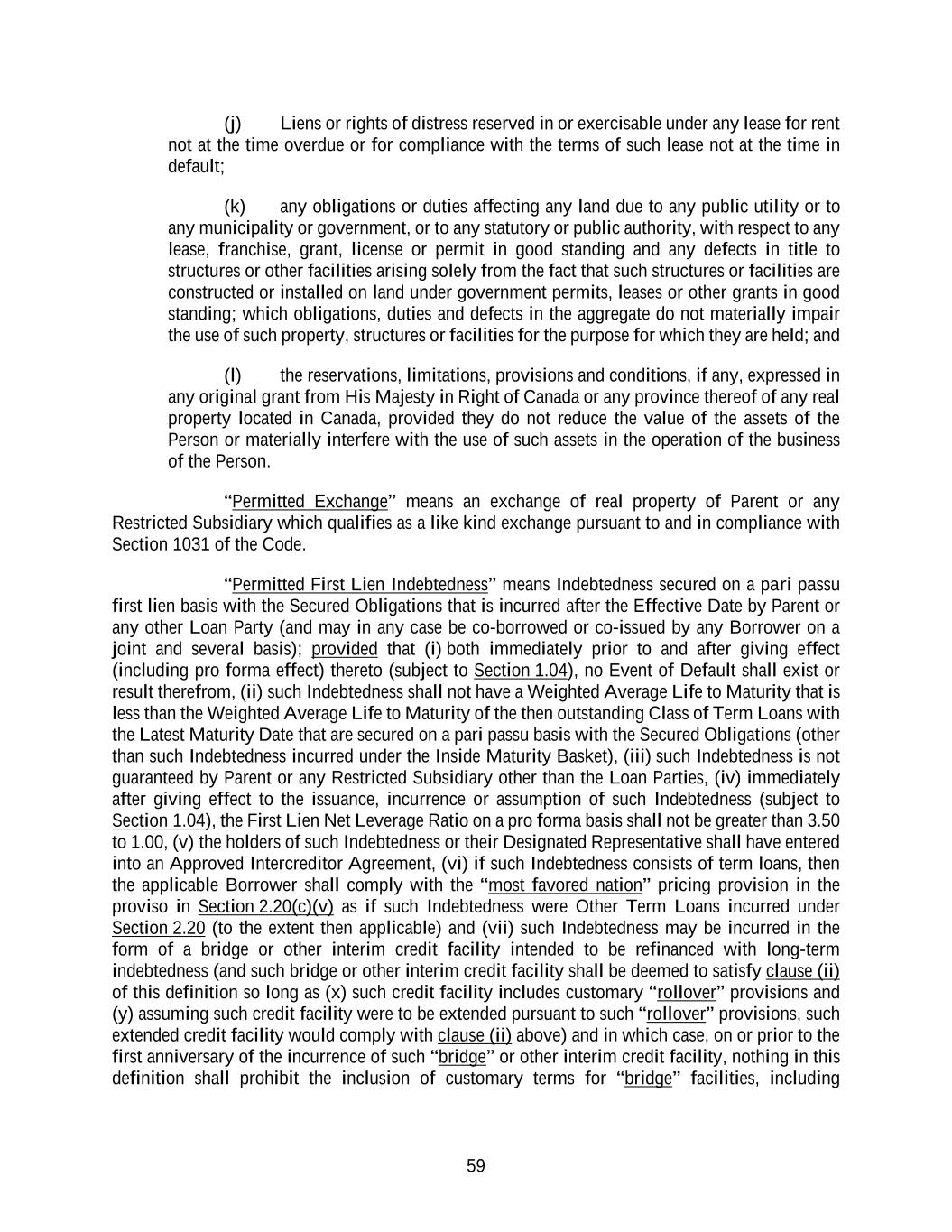 59 (j) Liens or rights of distress reserved in or exercisable under any lease for rent not at the time overdue or for compliance with the terms of such lease not at the time in default; (k) any obligations or duties affecting any land due to any public utility or to any municipality or government, or to any statutory or public authority, with respect to any lease, franchise, grant, license or permit in good standing and any defects in title to structures or other facilities arising solely from the fact that such structures or facilities are constructed or installed on land under government permits, leases or other grants in good standing; which obligations, duties and defects in the aggregate do not materially impair the use of such property, structures or facilities for the purpose for which they are held; and (l) the reservations, limitations, provisions and conditions, if any, expressed in any original grant from His Majesty in Right of Canada or any province thereof of any real property located in Canada, provided they do not reduce the value of the assets of the Person or materially interfere with the use of such assets in the operation of the business of the Person. “Permitted Exchange” means an exchange of real property of Parent or any Restricted Subsidiary which qualifies as a like kind exchange pursuant to and in compliance with Section 1031 of the Code. “Permitted First Lien Indebtedness” means Indebtedness secured on a pari passu first lien basis with the Secured Obligations that is incurred after the Effective Date by Parent or any other Loan Party (and may in any case be co-borrowed or co-issued by any Borrower on a joint and several basis); provided that (i) both immediately prior to and after giving effect (including pro forma effect) thereto (subject to Section 1.04), no Event of Default shall exist or result therefrom, (ii) such Indebtedness shall not have a Weighted Average Life to Maturity that is less than the Weighted Average Life to Maturity of the then outstanding Class of Term Loans with the Latest Maturity Date that are secured on a pari passu basis with the Secured Obligations (other than such Indebtedness incurred under the Inside Maturity Basket), (iii) such Indebtedness is not guaranteed by Parent or any Restricted Subsidiary other than the Loan Parties, (iv) immediately after giving effect to the issuance, incurrence or assumption of such Indebtedness (subject to Section 1.04), the First Lien Net Leverage Ratio on a pro forma basis shall not be greater than 3.50 to 1.00, (v) the holders of such Indebtedness or their Designated Representative shall have entered into an Approved Intercreditor Agreement, (vi) if such Indebtedness consists of term loans, then the applicable Borrower shall comply with the “most favored nation” pricing provision in the proviso in Section 2.20(c)(v) as if such Indebtedness were Other Term Loans incurred under Section 2.20 (to the extent then applicable) and (vii) such Indebtedness may be incurred in the form of a bridge or other interim credit facility intended to be refinanced with long-term indebtedness (and such bridge or other interim credit facility shall be deemed to satisfy clause (ii) of this definition so long as (x) such credit facility includes customary “rollover” provisions and (y) assuming such credit facility were to be extended pursuant to such “rollover” provisions, such extended credit facility would comply with clause (ii) above) and in which case, on or prior to the first anniversary of the incurrence of such “bridge” or other interim credit facility, nothing in this definition shall prohibit the inclusion of customary terms for “bridge” facilities, including