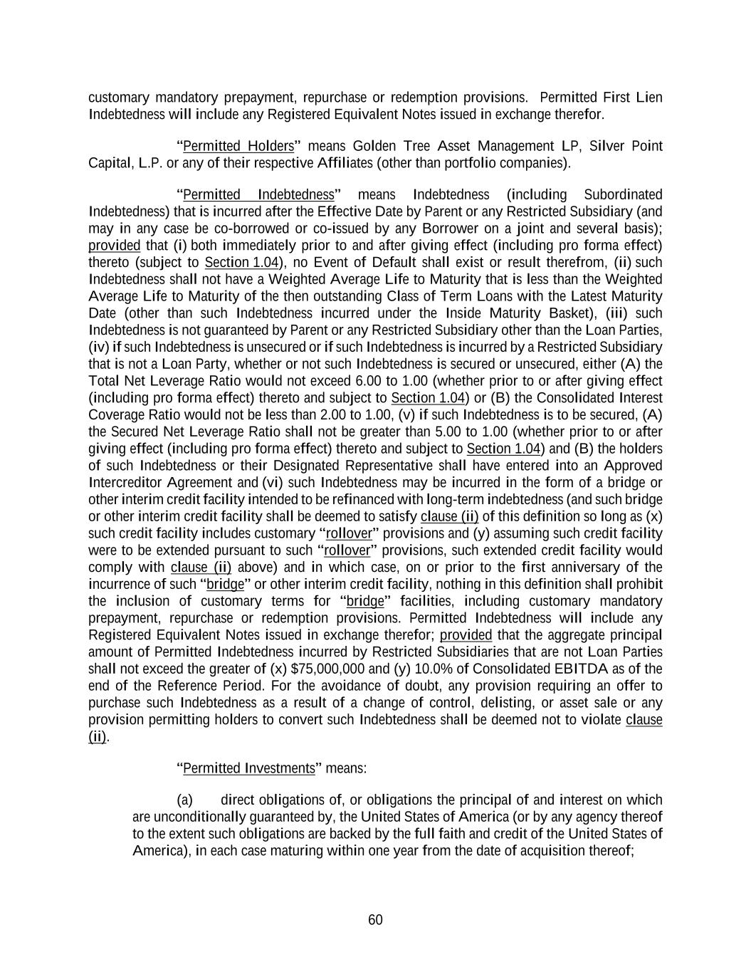 60 customary mandatory prepayment, repurchase or redemption provisions. Permitted First Lien Indebtedness will include any Registered Equivalent Notes issued in exchange therefor. “Permitted Holders” means Golden Tree Asset Management LP, Silver Point Capital, L.P. or any of their respective Affiliates (other than portfolio companies). “Permitted Indebtedness” means Indebtedness (including Subordinated Indebtedness) that is incurred after the Effective Date by Parent or any Restricted Subsidiary (and may in any case be co-borrowed or co-issued by any Borrower on a joint and several basis); provided that (i) both immediately prior to and after giving effect (including pro forma effect) thereto (subject to Section 1.04), no Event of Default shall exist or result therefrom, (ii) such Indebtedness shall not have a Weighted Average Life to Maturity that is less than the Weighted Average Life to Maturity of the then outstanding Class of Term Loans with the Latest Maturity Date (other than such Indebtedness incurred under the Inside Maturity Basket), (iii) such Indebtedness is not guaranteed by Parent or any Restricted Subsidiary other than the Loan Parties, (iv) if such Indebtedness is unsecured or if such Indebtedness is incurred by a Restricted Subsidiary that is not a Loan Party, whether or not such Indebtedness is secured or unsecured, either (A) the Total Net Leverage Ratio would not exceed 6.00 to 1.00 (whether prior to or after giving effect (including pro forma effect) thereto and subject to Section 1.04) or (B) the Consolidated Interest Coverage Ratio would not be less than 2.00 to 1.00, (v) if such Indebtedness is to be secured, (A) the Secured Net Leverage Ratio shall not be greater than 5.00 to 1.00 (whether prior to or after giving effect (including pro forma effect) thereto and subject to Section 1.04) and (B) the holders of such Indebtedness or their Designated Representative shall have entered into an Approved Intercreditor Agreement and (vi) such Indebtedness may be incurred in the form of a bridge or other interim credit facility intended to be refinanced with long-term indebtedness (and such bridge or other interim credit facility shall be deemed to satisfy clause (ii) of this definition so long as (x) such credit facility includes customary “rollover” provisions and (y) assuming such credit facility were to be extended pursuant to such “rollover” provisions, such extended credit facility would comply with clause (ii) above) and in which case, on or prior to the first anniversary of the incurrence of such “bridge” or other interim credit facility, nothing in this definition shall prohibit the inclusion of customary terms for “bridge” facilities, including customary mandatory prepayment, repurchase or redemption provisions. Permitted Indebtedness will include any Registered Equivalent Notes issued in exchange therefor; provided that the aggregate principal amount of Permitted Indebtedness incurred by Restricted Subsidiaries that are not Loan Parties shall not exceed the greater of (x) $75,000,000 and (y) 10.0% of Consolidated EBITDA as of the end of the Reference Period. For the avoidance of doubt, any provision requiring an offer to purchase such Indebtedness as a result of a change of control, delisting, or asset sale or any provision permitting holders to convert such Indebtedness shall be deemed not to violate clause (ii). “Permitted Investments” means: (a) direct obligations of, or obligations the principal of and interest on which are unconditionally guaranteed by, the United States of America (or by any agency thereof to the extent such obligations are backed by the full faith and credit of the United States of America), in each case maturing within one year from the date of acquisition thereof;