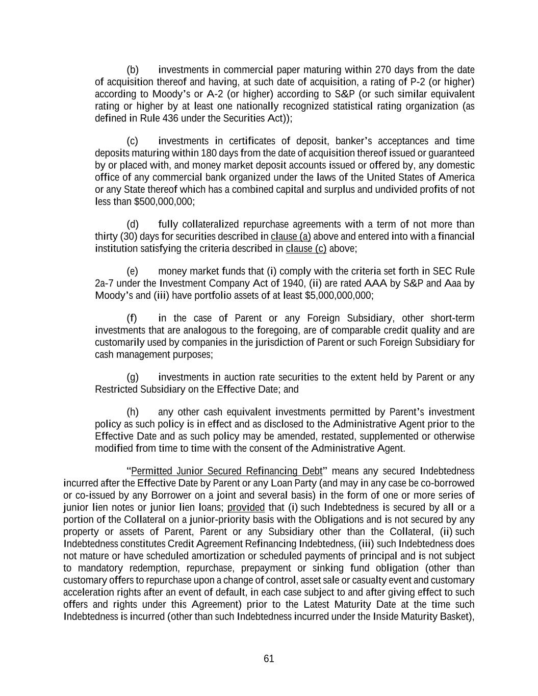 61 (b) investments in commercial paper maturing within 270 days from the date of acquisition thereof and having, at such date of acquisition, a rating of P-2 (or higher) according to Moody’s or A-2 (or higher) according to S&P (or such similar equivalent rating or higher by at least one nationally recognized statistical rating organization (as defined in Rule 436 under the Securities Act)); (c) investments in certificates of deposit, banker’s acceptances and time deposits maturing within 180 days from the date of acquisition thereof issued or guaranteed by or placed with, and money market deposit accounts issued or offered by, any domestic office of any commercial bank organized under the laws of the United States of America or any State thereof which has a combined capital and surplus and undivided profits of not less than $500,000,000; (d) fully collateralized repurchase agreements with a term of not more than thirty (30) days for securities described in clause (a) above and entered into with a financial institution satisfying the criteria described in clause (c) above; (e) money market funds that (i) comply with the criteria set forth in SEC Rule 2a-7 under the Investment Company Act of 1940, (ii) are rated AAA by S&P and Aaa by Moody’s and (iii) have portfolio assets of at least $5,000,000,000; (f) in the case of Parent or any Foreign Subsidiary, other short-term investments that are analogous to the foregoing, are of comparable credit quality and are customarily used by companies in the jurisdiction of Parent or such Foreign Subsidiary for cash management purposes; (g) investments in auction rate securities to the extent held by Parent or any Restricted Subsidiary on the Effective Date; and (h) any other cash equivalent investments permitted by Parent’s investment policy as such policy is in effect and as disclosed to the Administrative Agent prior to the Effective Date and as such policy may be amended, restated, supplemented or otherwise modified from time to time with the consent of the Administrative Agent. “Permitted Junior Secured Refinancing Debt” means any secured Indebtedness incurred after the Effective Date by Parent or any Loan Party (and may in any case be co-borrowed or co-issued by any Borrower on a joint and several basis) in the form of one or more series of junior lien notes or junior lien loans; provided that (i) such Indebtedness is secured by all or a portion of the Collateral on a junior-priority basis with the Obligations and is not secured by any property or assets of Parent, Parent or any Subsidiary other than the Collateral, (ii) such Indebtedness constitutes Credit Agreement Refinancing Indebtedness, (iii) such Indebtedness does not mature or have scheduled amortization or scheduled payments of principal and is not subject to mandatory redemption, repurchase, prepayment or sinking fund obligation (other than customary offers to repurchase upon a change of control, asset sale or casualty event and customary acceleration rights after an event of default, in each case subject to and after giving effect to such offers and rights under this Agreement) prior to the Latest Maturity Date at the time such Indebtedness is incurred (other than such Indebtedness incurred under the Inside Maturity Basket),
