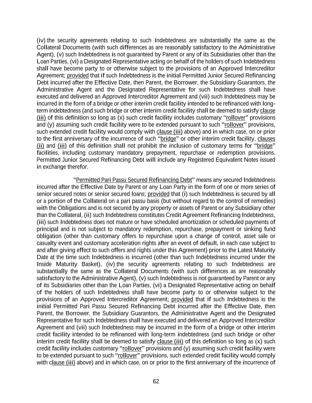 62 (iv) the security agreements relating to such Indebtedness are substantially the same as the Collateral Documents (with such differences as are reasonably satisfactory to the Administrative Agent), (v) such Indebtedness is not guaranteed by Parent or any of its Subsidiaries other than the Loan Parties, (vi) a Designated Representative acting on behalf of the holders of such Indebtedness shall have become party to or otherwise subject to the provisions of an Approved Intercreditor Agreement; provided that if such Indebtedness is the initial Permitted Junior Secured Refinancing Debt incurred after the Effective Date, then Parent, the Borrower, the Subsidiary Guarantors, the Administrative Agent and the Designated Representative for such Indebtedness shall have executed and delivered an Approved Intercreditor Agreement and (vii) such Indebtedness may be incurred in the form of a bridge or other interim credit facility intended to be refinanced with long- term indebtedness (and such bridge or other interim credit facility shall be deemed to satisfy clause (iii) of this definition so long as (x) such credit facility includes customary “rollover” provisions and (y) assuming such credit facility were to be extended pursuant to such “rollover” provisions, such extended credit facility would comply with clause (iii) above) and in which case, on or prior to the first anniversary of the incurrence of such “bridge” or other interim credit facility, clauses (ii) and (iii) of this definition shall not prohibit the inclusion of customary terms for “bridge” facilities, including customary mandatory prepayment, repurchase or redemption provisions. Permitted Junior Secured Refinancing Debt will include any Registered Equivalent Notes issued in exchange therefor. “Permitted Pari Passu Secured Refinancing Debt” means any secured Indebtedness incurred after the Effective Date by Parent or any Loan Party in the form of one or more series of senior secured notes or senior secured loans; provided that (i) such Indebtedness is secured by all or a portion of the Collateral on a pari passu basis (but without regard to the control of remedies) with the Obligations and is not secured by any property or assets of Parent or any Subsidiary other than the Collateral, (ii) such Indebtedness constitutes Credit Agreement Refinancing Indebtedness, (iii) such Indebtedness does not mature or have scheduled amortization or scheduled payments of principal and is not subject to mandatory redemption, repurchase, prepayment or sinking fund obligation (other than customary offers to repurchase upon a change of control, asset sale or casualty event and customary acceleration rights after an event of default, in each case subject to and after giving effect to such offers and rights under this Agreement) prior to the Latest Maturity Date at the time such Indebtedness is incurred (other than such Indebtedness incurred under the Inside Maturity Basket), (iv) the security agreements relating to such Indebtedness are substantially the same as the Collateral Documents (with such differences as are reasonably satisfactory to the Administrative Agent), (v) such Indebtedness is not guaranteed by Parent or any of its Subsidiaries other than the Loan Parties, (vi) a Designated Representative acting on behalf of the holders of such Indebtedness shall have become party to or otherwise subject to the provisions of an Approved Intercreditor Agreement; provided that if such Indebtedness is the initial Permitted Pari Passu Secured Refinancing Debt incurred after the Effective Date, then Parent, the Borrower, the Subsidiary Guarantors, the Administrative Agent and the Designated Representative for such Indebtedness shall have executed and delivered an Approved Intercreditor Agreement and (vii) such Indebtedness may be incurred in the form of a bridge or other interim credit facility intended to be refinanced with long-term indebtedness (and such bridge or other interim credit facility shall be deemed to satisfy clause (iii) of this definition so long as (x) such credit facility includes customary “rollover” provisions and (y) assuming such credit facility were to be extended pursuant to such “rollover” provisions, such extended credit facility would comply with clause (iii) above) and in which case, on or prior to the first anniversary of the incurrence of