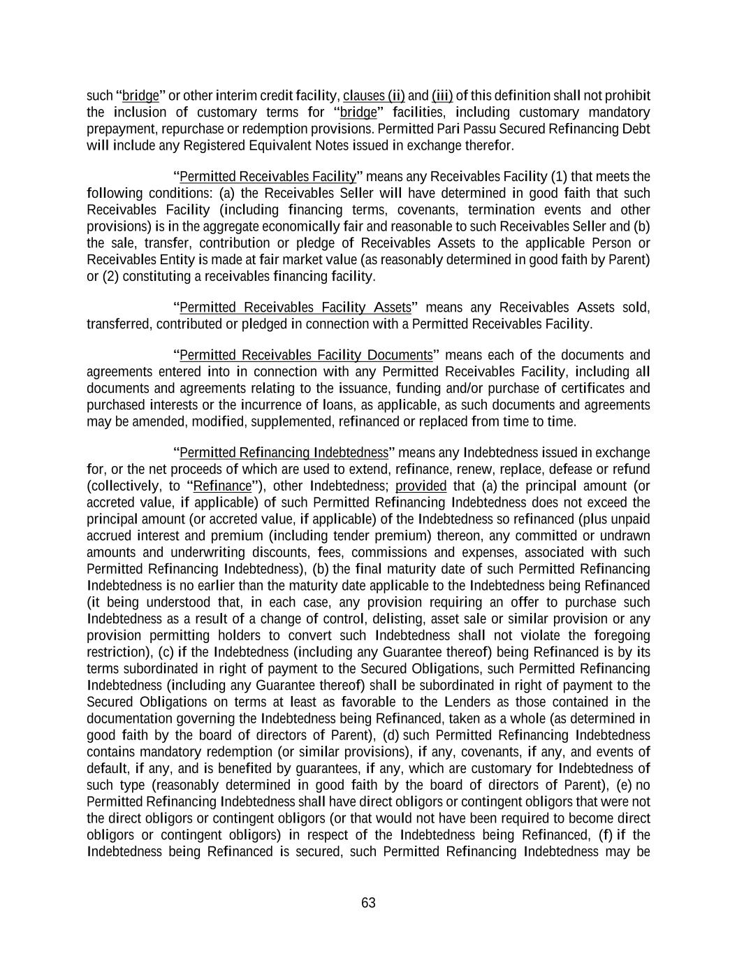 63 such “bridge” or other interim credit facility, clauses (ii) and (iii) of this definition shall not prohibit the inclusion of customary terms for “bridge” facilities, including customary mandatory prepayment, repurchase or redemption provisions. Permitted Pari Passu Secured Refinancing Debt will include any Registered Equivalent Notes issued in exchange therefor. “Permitted Receivables Facility” means any Receivables Facility (1) that meets the following conditions: (a) the Receivables Seller will have determined in good faith that such Receivables Facility (including financing terms, covenants, termination events and other provisions) is in the aggregate economically fair and reasonable to such Receivables Seller and (b) the sale, transfer, contribution or pledge of Receivables Assets to the applicable Person or Receivables Entity is made at fair market value (as reasonably determined in good faith by Parent) or (2) constituting a receivables financing facility. “Permitted Receivables Facility Assets” means any Receivables Assets sold, transferred, contributed or pledged in connection with a Permitted Receivables Facility. “Permitted Receivables Facility Documents” means each of the documents and agreements entered into in connection with any Permitted Receivables Facility, including all documents and agreements relating to the issuance, funding and/or purchase of certificates and purchased interests or the incurrence of loans, as applicable, as such documents and agreements may be amended, modified, supplemented, refinanced or replaced from time to time. “Permitted Refinancing Indebtedness” means any Indebtedness issued in exchange for, or the net proceeds of which are used to extend, refinance, renew, replace, defease or refund (collectively, to “Refinance”), other Indebtedness; provided that (a) the principal amount (or accreted value, if applicable) of such Permitted Refinancing Indebtedness does not exceed the principal amount (or accreted value, if applicable) of the Indebtedness so refinanced (plus unpaid accrued interest and premium (including tender premium) thereon, any committed or undrawn amounts and underwriting discounts, fees, commissions and expenses, associated with such Permitted Refinancing Indebtedness), (b) the final maturity date of such Permitted Refinancing Indebtedness is no earlier than the maturity date applicable to the Indebtedness being Refinanced (it being understood that, in each case, any provision requiring an offer to purchase such Indebtedness as a result of a change of control, delisting, asset sale or similar provision or any provision permitting holders to convert such Indebtedness shall not violate the foregoing restriction), (c) if the Indebtedness (including any Guarantee thereof) being Refinanced is by its terms subordinated in right of payment to the Secured Obligations, such Permitted Refinancing Indebtedness (including any Guarantee thereof) shall be subordinated in right of payment to the Secured Obligations on terms at least as favorable to the Lenders as those contained in the documentation governing the Indebtedness being Refinanced, taken as a whole (as determined in good faith by the board of directors of Parent), (d) such Permitted Refinancing Indebtedness contains mandatory redemption (or similar provisions), if any, covenants, if any, and events of default, if any, and is benefited by guarantees, if any, which are customary for Indebtedness of such type (reasonably determined in good faith by the board of directors of Parent), (e) no Permitted Refinancing Indebtedness shall have direct obligors or contingent obligors that were not the direct obligors or contingent obligors (or that would not have been required to become direct obligors or contingent obligors) in respect of the Indebtedness being Refinanced, (f) if the Indebtedness being Refinanced is secured, such Permitted Refinancing Indebtedness may be
