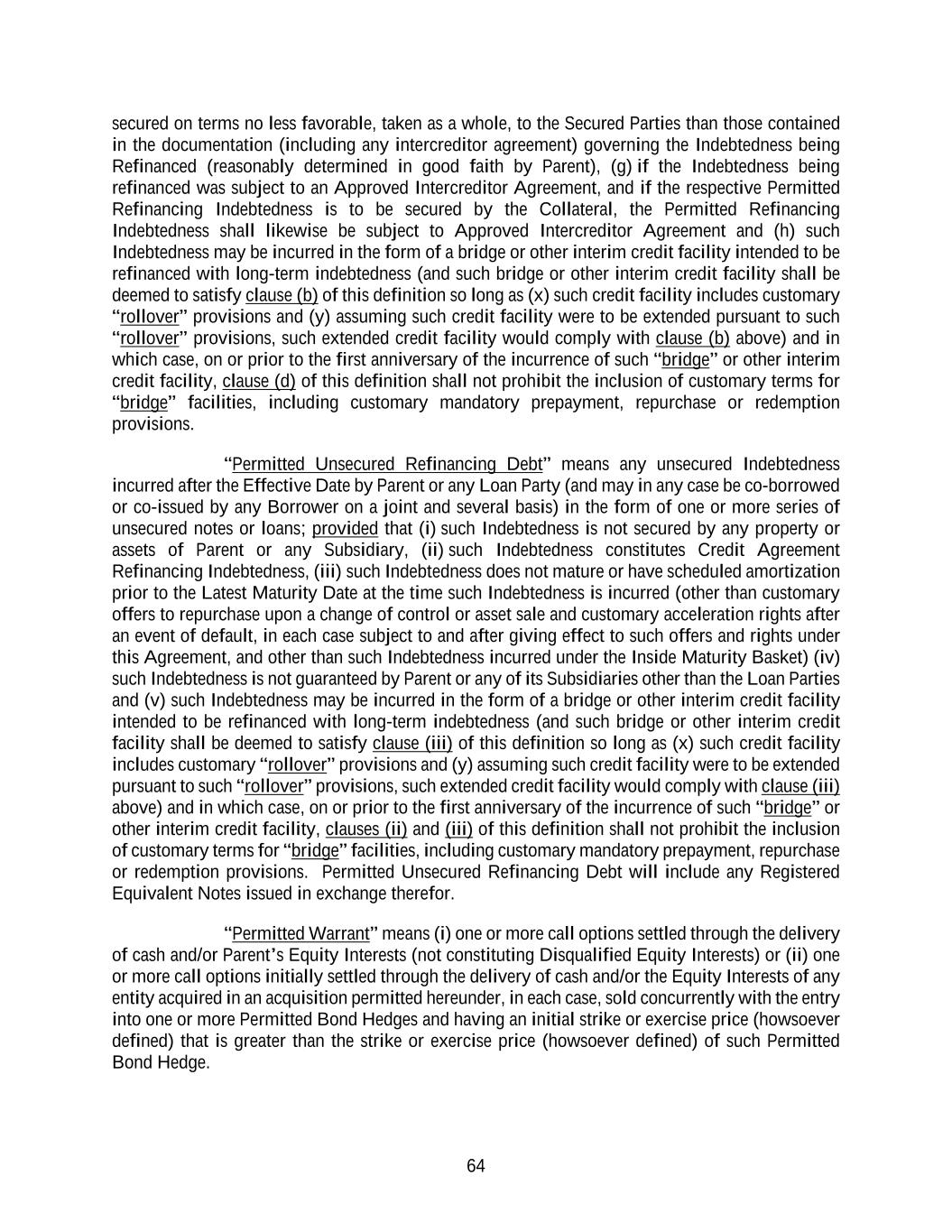 64 secured on terms no less favorable, taken as a whole, to the Secured Parties than those contained in the documentation (including any intercreditor agreement) governing the Indebtedness being Refinanced (reasonably determined in good faith by Parent), (g) if the Indebtedness being refinanced was subject to an Approved Intercreditor Agreement, and if the respective Permitted Refinancing Indebtedness is to be secured by the Collateral, the Permitted Refinancing Indebtedness shall likewise be subject to Approved Intercreditor Agreement and (h) such Indebtedness may be incurred in the form of a bridge or other interim credit facility intended to be refinanced with long-term indebtedness (and such bridge or other interim credit facility shall be deemed to satisfy clause (b) of this definition so long as (x) such credit facility includes customary “rollover” provisions and (y) assuming such credit facility were to be extended pursuant to such “rollover” provisions, such extended credit facility would comply with clause (b) above) and in which case, on or prior to the first anniversary of the incurrence of such “bridge” or other interim credit facility, clause (d) of this definition shall not prohibit the inclusion of customary terms for “bridge” facilities, including customary mandatory prepayment, repurchase or redemption provisions. “Permitted Unsecured Refinancing Debt” means any unsecured Indebtedness incurred after the Effective Date by Parent or any Loan Party (and may in any case be co-borrowed or co-issued by any Borrower on a joint and several basis) in the form of one or more series of unsecured notes or loans; provided that (i) such Indebtedness is not secured by any property or assets of Parent or any Subsidiary, (ii) such Indebtedness constitutes Credit Agreement Refinancing Indebtedness, (iii) such Indebtedness does not mature or have scheduled amortization prior to the Latest Maturity Date at the time such Indebtedness is incurred (other than customary offers to repurchase upon a change of control or asset sale and customary acceleration rights after an event of default, in each case subject to and after giving effect to such offers and rights under this Agreement, and other than such Indebtedness incurred under the Inside Maturity Basket) (iv) such Indebtedness is not guaranteed by Parent or any of its Subsidiaries other than the Loan Parties and (v) such Indebtedness may be incurred in the form of a bridge or other interim credit facility intended to be refinanced with long-term indebtedness (and such bridge or other interim credit facility shall be deemed to satisfy clause (iii) of this definition so long as (x) such credit facility includes customary “rollover” provisions and (y) assuming such credit facility were to be extended pursuant to such “rollover” provisions, such extended credit facility would comply with clause (iii) above) and in which case, on or prior to the first anniversary of the incurrence of such “bridge” or other interim credit facility, clauses (ii) and (iii) of this definition shall not prohibit the inclusion of customary terms for “bridge” facilities, including customary mandatory prepayment, repurchase or redemption provisions. Permitted Unsecured Refinancing Debt will include any Registered Equivalent Notes issued in exchange therefor. “Permitted Warrant” means (i) one or more call options settled through the delivery of cash and/or Parent’s Equity Interests (not constituting Disqualified Equity Interests) or (ii) one or more call options initially settled through the delivery of cash and/or the Equity Interests of any entity acquired in an acquisition permitted hereunder, in each case, sold concurrently with the entry into one or more Permitted Bond Hedges and having an initial strike or exercise price (howsoever defined) that is greater than the strike or exercise price (howsoever defined) of such Permitted Bond Hedge.