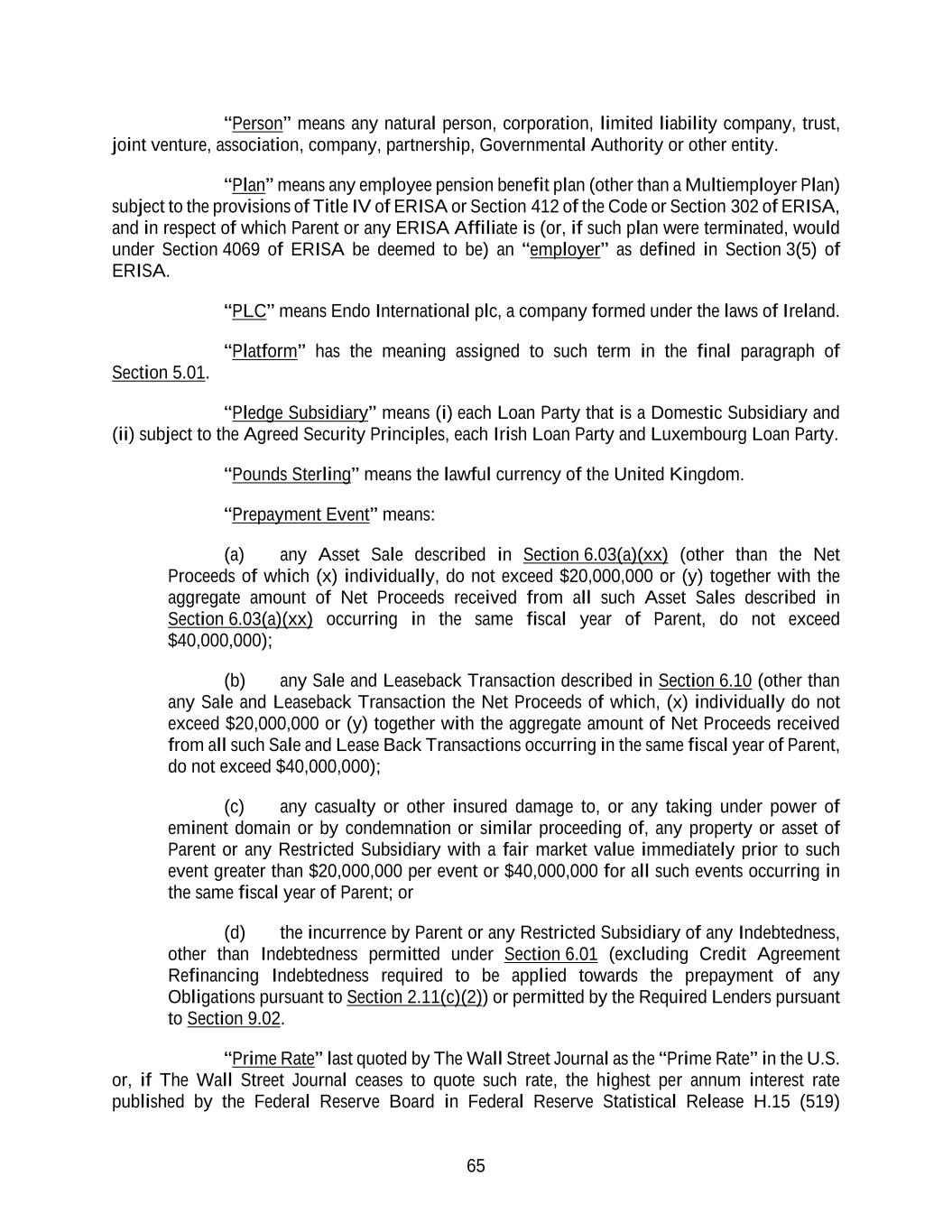 65 “Person” means any natural person, corporation, limited liability company, trust, joint venture, association, company, partnership, Governmental Authority or other entity. “Plan” means any employee pension benefit plan (other than a Multiemployer Plan) subject to the provisions of Title IV of ERISA or Section 412 of the Code or Section 302 of ERISA, and in respect of which Parent or any ERISA Affiliate is (or, if such plan were terminated, would under Section 4069 of ERISA be deemed to be) an “employer” as defined in Section 3(5) of ERISA. “PLC” means Endo International plc, a company formed under the laws of Ireland. “Platform” has the meaning assigned to such term in the final paragraph of Section 5.01. “Pledge Subsidiary” means (i) each Loan Party that is a Domestic Subsidiary and (ii) subject to the Agreed Security Principles, each Irish Loan Party and Luxembourg Loan Party. “Pounds Sterling” means the lawful currency of the United Kingdom. “Prepayment Event” means: (a) any Asset Sale described in Section 6.03(a)(xx) (other than the Net Proceeds of which (x) individually, do not exceed $20,000,000 or (y) together with the aggregate amount of Net Proceeds received from all such Asset Sales described in Section 6.03(a)(xx) occurring in the same fiscal year of Parent, do not exceed $40,000,000); (b) any Sale and Leaseback Transaction described in Section 6.10 (other than any Sale and Leaseback Transaction the Net Proceeds of which, (x) individually do not exceed $20,000,000 or (y) together with the aggregate amount of Net Proceeds received from all such Sale and Lease Back Transactions occurring in the same fiscal year of Parent, do not exceed $40,000,000); (c) any casualty or other insured damage to, or any taking under power of eminent domain or by condemnation or similar proceeding of, any property or asset of Parent or any Restricted Subsidiary with a fair market value immediately prior to such event greater than $20,000,000 per event or $40,000,000 for all such events occurring in the same fiscal year of Parent; or (d) the incurrence by Parent or any Restricted Subsidiary of any Indebtedness, other than Indebtedness permitted under Section 6.01 (excluding Credit Agreement Refinancing Indebtedness required to be applied towards the prepayment of any Obligations pursuant to Section 2.11(c)(2)) or permitted by the Required Lenders pursuant to Section 9.02. “Prime Rate” last quoted by The Wall Street Journal as the “Prime Rate” in the U.S. or, if The Wall Street Journal ceases to quote such rate, the highest per annum interest rate published by the Federal Reserve Board in Federal Reserve Statistical Release H.15 (519)