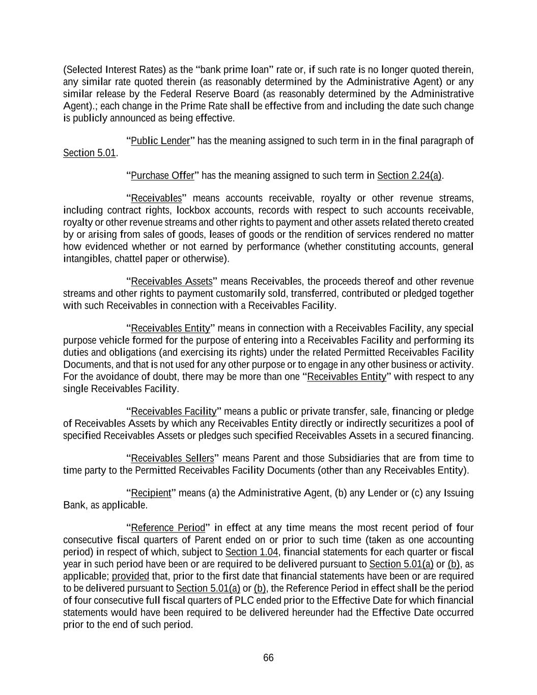 66 (Selected Interest Rates) as the “bank prime loan” rate or, if such rate is no longer quoted therein, any similar rate quoted therein (as reasonably determined by the Administrative Agent) or any similar release by the Federal Reserve Board (as reasonably determined by the Administrative Agent).; each change in the Prime Rate shall be effective from and including the date such change is publicly announced as being effective. “Public Lender” has the meaning assigned to such term in in the final paragraph of Section 5.01. “Purchase Offer” has the meaning assigned to such term in Section 2.24(a). “Receivables” means accounts receivable, royalty or other revenue streams, including contract rights, lockbox accounts, records with respect to such accounts receivable, royalty or other revenue streams and other rights to payment and other assets related thereto created by or arising from sales of goods, leases of goods or the rendition of services rendered no matter how evidenced whether or not earned by performance (whether constituting accounts, general intangibles, chattel paper or otherwise). “Receivables Assets” means Receivables, the proceeds thereof and other revenue streams and other rights to payment customarily sold, transferred, contributed or pledged together with such Receivables in connection with a Receivables Facility. “Receivables Entity” means in connection with a Receivables Facility, any special purpose vehicle formed for the purpose of entering into a Receivables Facility and performing its duties and obligations (and exercising its rights) under the related Permitted Receivables Facility Documents, and that is not used for any other purpose or to engage in any other business or activity. For the avoidance of doubt, there may be more than one “Receivables Entity” with respect to any single Receivables Facility. “Receivables Facility” means a public or private transfer, sale, financing or pledge of Receivables Assets by which any Receivables Entity directly or indirectly securitizes a pool of specified Receivables Assets or pledges such specified Receivables Assets in a secured financing. “Receivables Sellers” means Parent and those Subsidiaries that are from time to time party to the Permitted Receivables Facility Documents (other than any Receivables Entity). “Recipient” means (a) the Administrative Agent, (b) any Lender or (c) any Issuing Bank, as applicable. “Reference Period” in effect at any time means the most recent period of four consecutive fiscal quarters of Parent ended on or prior to such time (taken as one accounting period) in respect of which, subject to Section 1.04, financial statements for each quarter or fiscal year in such period have been or are required to be delivered pursuant to Section 5.01(a) or (b), as applicable; provided that, prior to the first date that financial statements have been or are required to be delivered pursuant to Section 5.01(a) or (b), the Reference Period in effect shall be the period of four consecutive full fiscal quarters of PLC ended prior to the Effective Date for which financial statements would have been required to be delivered hereunder had the Effective Date occurred prior to the end of such period.