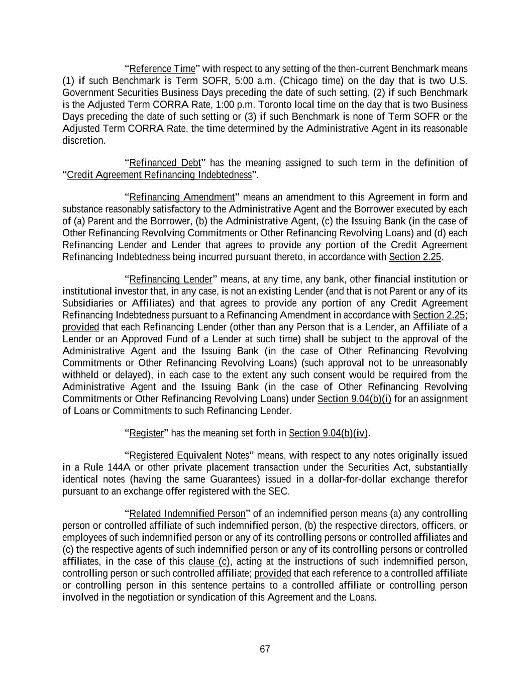 67 “Reference Time” with respect to any setting of the then-current Benchmark means (1) if such Benchmark is Term SOFR, 5:00 a.m. (Chicago time) on the day that is two U.S. Government Securities Business Days preceding the date of such setting, (2) if such Benchmark is the Adjusted Term CORRA Rate, 1:00 p.m. Toronto local time on the day that is two Business Days preceding the date of such setting or (3) if such Benchmark is none of Term SOFR or the Adjusted Term CORRA Rate, the time determined by the Administrative Agent in its reasonable discretion. “Refinanced Debt” has the meaning assigned to such term in the definition of “Credit Agreement Refinancing Indebtedness”. “Refinancing Amendment” means an amendment to this Agreement in form and substance reasonably satisfactory to the Administrative Agent and the Borrower executed by each of (a) Parent and the Borrower, (b) the Administrative Agent, (c) the Issuing Bank (in the case of Other Refinancing Revolving Commitments or Other Refinancing Revolving Loans) and (d) each Refinancing Lender and Lender that agrees to provide any portion of the Credit Agreement Refinancing Indebtedness being incurred pursuant thereto, in accordance with Section 2.25. “Refinancing Lender” means, at any time, any bank, other financial institution or institutional investor that, in any case, is not an existing Lender (and that is not Parent or any of its Subsidiaries or Affiliates) and that agrees to provide any portion of any Credit Agreement Refinancing Indebtedness pursuant to a Refinancing Amendment in accordance with Section 2.25; provided that each Refinancing Lender (other than any Person that is a Lender, an Affiliate of a Lender or an Approved Fund of a Lender at such time) shall be subject to the approval of the Administrative Agent and the Issuing Bank (in the case of Other Refinancing Revolving Commitments or Other Refinancing Revolving Loans) (such approval not to be unreasonably withheld or delayed), in each case to the extent any such consent would be required from the Administrative Agent and the Issuing Bank (in the case of Other Refinancing Revolving Commitments or Other Refinancing Revolving Loans) under Section 9.04(b)(i) for an assignment of Loans or Commitments to such Refinancing Lender. “Register” has the meaning set forth in Section 9.04(b)(iv). “Registered Equivalent Notes” means, with respect to any notes originally issued in a Rule 144A or other private placement transaction under the Securities Act, substantially identical notes (having the same Guarantees) issued in a dollar-for-dollar exchange therefor pursuant to an exchange offer registered with the SEC. “Related Indemnified Person” of an indemnified person means (a) any controlling person or controlled affiliate of such indemnified person, (b) the respective directors, officers, or employees of such indemnified person or any of its controlling persons or controlled affiliates and (c) the respective agents of such indemnified person or any of its controlling persons or controlled affiliates, in the case of this clause (c), acting at the instructions of such indemnified person, controlling person or such controlled affiliate; provided that each reference to a controlled affiliate or controlling person in this sentence pertains to a controlled affiliate or controlling person involved in the negotiation or syndication of this Agreement and the Loans.