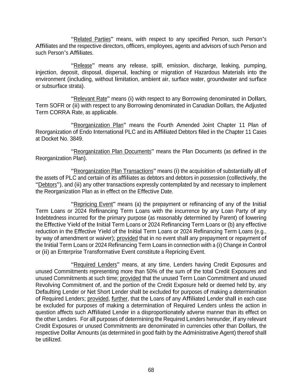 68 “Related Parties” means, with respect to any specified Person, such Person’s Affiliates and the respective directors, officers, employees, agents and advisors of such Person and such Person’s Affiliates. “Release” means any release, spill, emission, discharge, leaking, pumping, injection, deposit, disposal, dispersal, leaching or migration of Hazardous Materials into the environment (including, without limitation, ambient air, surface water, groundwater and surface or subsurface strata). “Relevant Rate” means (i) with respect to any Borrowing denominated in Dollars, Term SOFR or (ii) with respect to any Borrowing denominated in Canadian Dollars, the Adjusted Term CORRA Rate, as applicable. “Reorganization Plan” means the Fourth Amended Joint Chapter 11 Plan of Reorganization of Endo International PLC and its Affiliated Debtors filed in the Chapter 11 Cases at Docket No. 3849. “Reorganization Plan Documents” means the Plan Documents (as defined in the Reorganization Plan). “Reorganization Plan Transactions” means (i) the acquisition of substantially all of the assets of PLC and certain of its affiliates as debtors and debtors in possession (collectively, the “Debtors”), and (ii) any other transactions expressly contemplated by and necessary to implement the Reorganization Plan as in effect on the Effective Date. “Repricing Event” means (a) the prepayment or refinancing of any of the Initial Term Loans or 2024 Refinancing Term Loans with the incurrence by any Loan Party of any Indebtedness incurred for the primary purpose (as reasonably determined by Parent) of lowering the Effective Yield of the Initial Term Loans or 2024 Refinancing Term Loans or (b) any effective reduction in the Effective Yield of the Initial Term Loans or 2024 Refinancing Term Loans (e.g., by way of amendment or waiver); provided that in no event shall any prepayment or repayment of the Initial Term Loans or 2024 Refinancing Term Loans in connection with a (i) Change in Control or (ii) an Enterprise Transformative Event constitute a Repricing Event. “Required Lenders” means, at any time, Lenders having Credit Exposures and unused Commitments representing more than 50% of the sum of the total Credit Exposures and unused Commitments at such time; provided that the unused Term Loan Commitment and unused Revolving Commitment of, and the portion of the Credit Exposure held or deemed held by, any Defaulting Lender or Net Short Lender shall be excluded for purposes of making a determination of Required Lenders; provided, further, that the Loans of any Affiliated Lender shall in each case be excluded for purposes of making a determination of Required Lenders unless the action in question affects such Affiliated Lender in a disproportionately adverse manner than its effect on the other Lenders. For all purposes of determining the Required Lenders hereunder, if any relevant Credit Exposures or unused Commitments are denominated in currencies other than Dollars, the respective Dollar Amounts (as determined in good faith by the Administrative Agent) thereof shall be utilized.