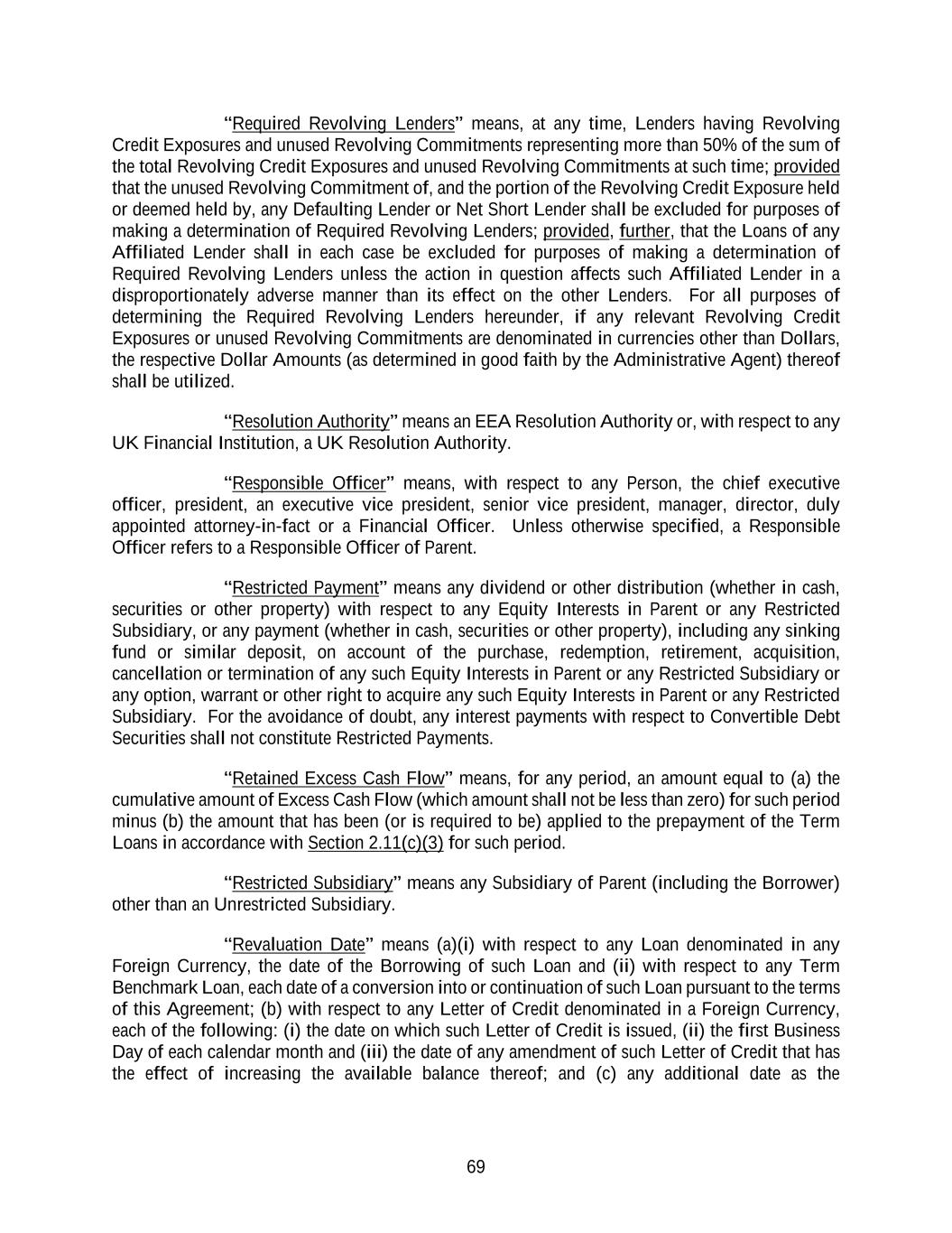 69 “Required Revolving Lenders” means, at any time, Lenders having Revolving Credit Exposures and unused Revolving Commitments representing more than 50% of the sum of the total Revolving Credit Exposures and unused Revolving Commitments at such time; provided that the unused Revolving Commitment of, and the portion of the Revolving Credit Exposure held or deemed held by, any Defaulting Lender or Net Short Lender shall be excluded for purposes of making a determination of Required Revolving Lenders; provided, further, that the Loans of any Affiliated Lender shall in each case be excluded for purposes of making a determination of Required Revolving Lenders unless the action in question affects such Affiliated Lender in a disproportionately adverse manner than its effect on the other Lenders. For all purposes of determining the Required Revolving Lenders hereunder, if any relevant Revolving Credit Exposures or unused Revolving Commitments are denominated in currencies other than Dollars, the respective Dollar Amounts (as determined in good faith by the Administrative Agent) thereof shall be utilized. “Resolution Authority” means an EEA Resolution Authority or, with respect to any UK Financial Institution, a UK Resolution Authority. “Responsible Officer” means, with respect to any Person, the chief executive officer, president, an executive vice president, senior vice president, manager, director, duly appointed attorney-in-fact or a Financial Officer. Unless otherwise specified, a Responsible Officer refers to a Responsible Officer of Parent. “Restricted Payment” means any dividend or other distribution (whether in cash, securities or other property) with respect to any Equity Interests in Parent or any Restricted Subsidiary, or any payment (whether in cash, securities or other property), including any sinking fund or similar deposit, on account of the purchase, redemption, retirement, acquisition, cancellation or termination of any such Equity Interests in Parent or any Restricted Subsidiary or any option, warrant or other right to acquire any such Equity Interests in Parent or any Restricted Subsidiary. For the avoidance of doubt, any interest payments with respect to Convertible Debt Securities shall not constitute Restricted Payments. “Retained Excess Cash Flow” means, for any period, an amount equal to (a) the cumulative amount of Excess Cash Flow (which amount shall not be less than zero) for such period minus (b) the amount that has been (or is required to be) applied to the prepayment of the Term Loans in accordance with Section 2.11(c)(3) for such period. “Restricted Subsidiary” means any Subsidiary of Parent (including the Borrower) other than an Unrestricted Subsidiary. “Revaluation Date” means (a)(i) with respect to any Loan denominated in any Foreign Currency, the date of the Borrowing of such Loan and (ii) with respect to any Term Benchmark Loan, each date of a conversion into or continuation of such Loan pursuant to the terms of this Agreement; (b) with respect to any Letter of Credit denominated in a Foreign Currency, each of the following: (i) the date on which such Letter of Credit is issued, (ii) the first Business Day of each calendar month and (iii) the date of any amendment of such Letter of Credit that has the effect of increasing the available balance thereof; and (c) any additional date as the