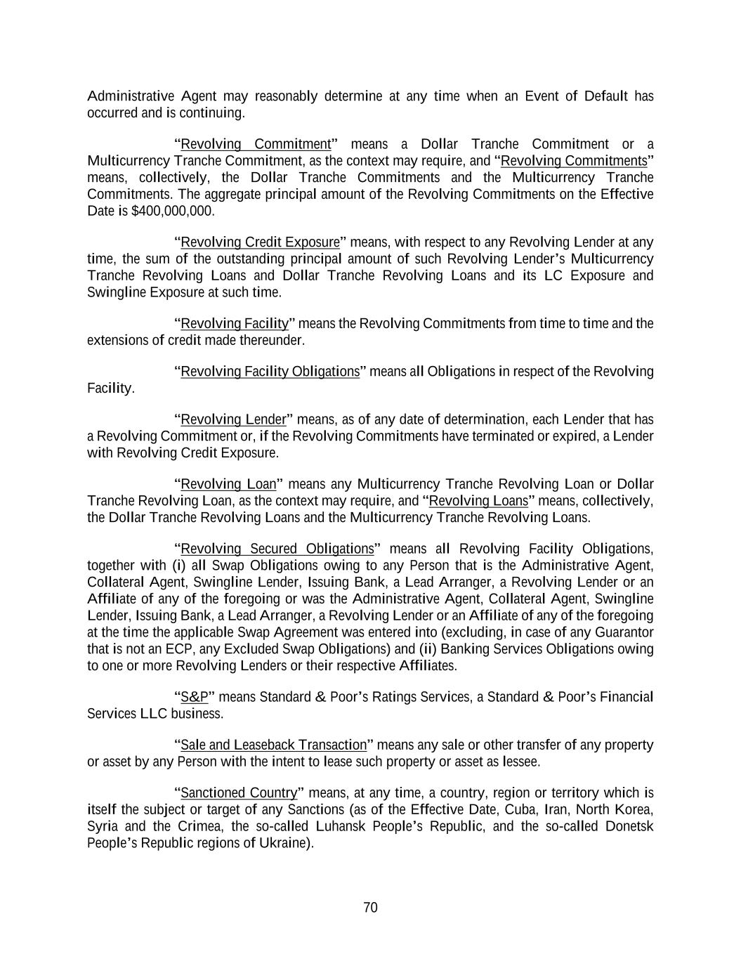 70 Administrative Agent may reasonably determine at any time when an Event of Default has occurred and is continuing. “Revolving Commitment” means a Dollar Tranche Commitment or a Multicurrency Tranche Commitment, as the context may require, and “Revolving Commitments” means, collectively, the Dollar Tranche Commitments and the Multicurrency Tranche Commitments. The aggregate principal amount of the Revolving Commitments on the Effective Date is $400,000,000. “Revolving Credit Exposure” means, with respect to any Revolving Lender at any time, the sum of the outstanding principal amount of such Revolving Lender’s Multicurrency Tranche Revolving Loans and Dollar Tranche Revolving Loans and its LC Exposure and Swingline Exposure at such time. “Revolving Facility” means the Revolving Commitments from time to time and the extensions of credit made thereunder. “Revolving Facility Obligations” means all Obligations in respect of the Revolving Facility. “Revolving Lender” means, as of any date of determination, each Lender that has a Revolving Commitment or, if the Revolving Commitments have terminated or expired, a Lender with Revolving Credit Exposure. “Revolving Loan” means any Multicurrency Tranche Revolving Loan or Dollar Tranche Revolving Loan, as the context may require, and “Revolving Loans” means, collectively, the Dollar Tranche Revolving Loans and the Multicurrency Tranche Revolving Loans. “Revolving Secured Obligations” means all Revolving Facility Obligations, together with (i) all Swap Obligations owing to any Person that is the Administrative Agent, Collateral Agent, Swingline Lender, Issuing Bank, a Lead Arranger, a Revolving Lender or an Affiliate of any of the foregoing or was the Administrative Agent, Collateral Agent, Swingline Lender, Issuing Bank, a Lead Arranger, a Revolving Lender or an Affiliate of any of the foregoing at the time the applicable Swap Agreement was entered into (excluding, in case of any Guarantor that is not an ECP, any Excluded Swap Obligations) and (ii) Banking Services Obligations owing to one or more Revolving Lenders or their respective Affiliates. “S&P” means Standard & Poor’s Ratings Services, a Standard & Poor’s Financial Services LLC business. “Sale and Leaseback Transaction” means any sale or other transfer of any property or asset by any Person with the intent to lease such property or asset as lessee. “Sanctioned Country” means, at any time, a country, region or territory which is itself the subject or target of any Sanctions (as of the Effective Date, Cuba, Iran, North Korea, Syria and the Crimea, the so-called Luhansk People’s Republic, and the so-called Donetsk People’s Republic regions of Ukraine).