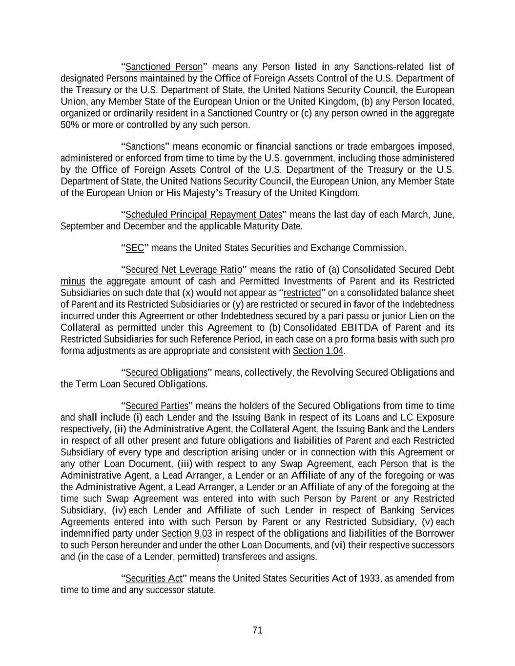 71 “Sanctioned Person” means any Person listed in any Sanctions-related list of designated Persons maintained by the Office of Foreign Assets Control of the U.S. Department of the Treasury or the U.S. Department of State, the United Nations Security Council, the European Union, any Member State of the European Union or the United Kingdom, (b) any Person located, organized or ordinarily resident in a Sanctioned Country or (c) any person owned in the aggregate 50% or more or controlled by any such person. “Sanctions” means economic or financial sanctions or trade embargoes imposed, administered or enforced from time to time by the U.S. government, including those administered by the Office of Foreign Assets Control of the U.S. Department of the Treasury or the U.S. Department of State, the United Nations Security Council, the European Union, any Member State of the European Union or His Majesty’s Treasury of the United Kingdom. “Scheduled Principal Repayment Dates” means the last day of each March, June, September and December and the applicable Maturity Date. “SEC” means the United States Securities and Exchange Commission. “Secured Net Leverage Ratio” means the ratio of (a) Consolidated Secured Debt minus the aggregate amount of cash and Permitted Investments of Parent and its Restricted Subsidiaries on such date that (x) would not appear as “restricted” on a consolidated balance sheet of Parent and its Restricted Subsidiaries or (y) are restricted or secured in favor of the Indebtedness incurred under this Agreement or other Indebtedness secured by a pari passu or junior Lien on the Collateral as permitted under this Agreement to (b) Consolidated EBITDA of Parent and its Restricted Subsidiaries for such Reference Period, in each case on a pro forma basis with such pro forma adjustments as are appropriate and consistent with Section 1.04. “Secured Obligations” means, collectively, the Revolving Secured Obligations and the Term Loan Secured Obligations. “Secured Parties” means the holders of the Secured Obligations from time to time and shall include (i) each Lender and the Issuing Bank in respect of its Loans and LC Exposure respectively, (ii) the Administrative Agent, the Collateral Agent, the Issuing Bank and the Lenders in respect of all other present and future obligations and liabilities of Parent and each Restricted Subsidiary of every type and description arising under or in connection with this Agreement or any other Loan Document, (iii) with respect to any Swap Agreement, each Person that is the Administrative Agent, a Lead Arranger, a Lender or an Affiliate of any of the foregoing or was the Administrative Agent, a Lead Arranger, a Lender or an Affiliate of any of the foregoing at the time such Swap Agreement was entered into with such Person by Parent or any Restricted Subsidiary, (iv) each Lender and Affiliate of such Lender in respect of Banking Services Agreements entered into with such Person by Parent or any Restricted Subsidiary, (v) each indemnified party under Section 9.03 in respect of the obligations and liabilities of the Borrower to such Person hereunder and under the other Loan Documents, and (vi) their respective successors and (in the case of a Lender, permitted) transferees and assigns. “Securities Act” means the United States Securities Act of 1933, as amended from time to time and any successor statute.