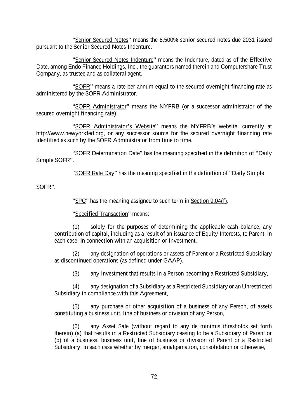72 “Senior Secured Notes” means the 8.500% senior secured notes due 2031 issued pursuant to the Senior Secured Notes Indenture. “Senior Secured Notes Indenture” means the Indenture, dated as of the Effective Date, among Endo Finance Holdings, Inc., the guarantors named therein and Computershare Trust Company, as trustee and as collateral agent. “SOFR” means a rate per annum equal to the secured overnight financing rate as administered by the SOFR Administrator. “SOFR Administrator” means the NYFRB (or a successor administrator of the secured overnight financing rate). “SOFR Administrator’s Website” means the NYFRB’s website, currently at http://www.newyorkfed.org, or any successor source for the secured overnight financing rate identified as such by the SOFR Administrator from time to time. “SOFR Determination Date” has the meaning specified in the definition of “Daily Simple SOFR”. “SOFR Rate Day” has the meaning specified in the definition of “Daily Simple SOFR”. “SPC” has the meaning assigned to such term in Section 9.04(f). “Specified Transaction” means: (1) solely for the purposes of determining the applicable cash balance, any contribution of capital, including as a result of an issuance of Equity Interests, to Parent, in each case, in connection with an acquisition or Investment, (2) any designation of operations or assets of Parent or a Restricted Subsidiary as discontinued operations (as defined under GAAP), (3) any Investment that results in a Person becoming a Restricted Subsidiary, (4) any designation of a Subsidiary as a Restricted Subsidiary or an Unrestricted Subsidiary in compliance with this Agreement, (5) any purchase or other acquisition of a business of any Person, of assets constituting a business unit, line of business or division of any Person, (6) any Asset Sale (without regard to any de minimis thresholds set forth therein) (a) that results in a Restricted Subsidiary ceasing to be a Subsidiary of Parent or (b) of a business, business unit, line of business or division of Parent or a Restricted Subsidiary, in each case whether by merger, amalgamation, consolidation or otherwise,