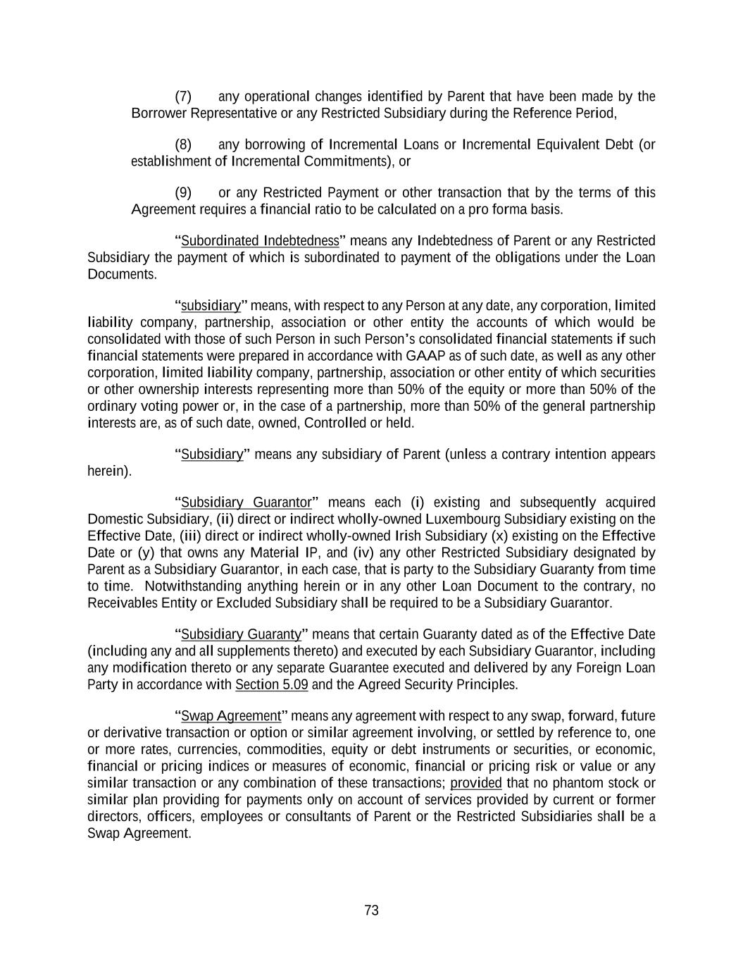 73 (7) any operational changes identified by Parent that have been made by the Borrower Representative or any Restricted Subsidiary during the Reference Period, (8) any borrowing of Incremental Loans or Incremental Equivalent Debt (or establishment of Incremental Commitments), or (9) or any Restricted Payment or other transaction that by the terms of this Agreement requires a financial ratio to be calculated on a pro forma basis. “Subordinated Indebtedness” means any Indebtedness of Parent or any Restricted Subsidiary the payment of which is subordinated to payment of the obligations under the Loan Documents. “subsidiary” means, with respect to any Person at any date, any corporation, limited liability company, partnership, association or other entity the accounts of which would be consolidated with those of such Person in such Person’s consolidated financial statements if such financial statements were prepared in accordance with GAAP as of such date, as well as any other corporation, limited liability company, partnership, association or other entity of which securities or other ownership interests representing more than 50% of the equity or more than 50% of the ordinary voting power or, in the case of a partnership, more than 50% of the general partnership interests are, as of such date, owned, Controlled or held. “Subsidiary” means any subsidiary of Parent (unless a contrary intention appears herein). “Subsidiary Guarantor” means each (i) existing and subsequently acquired Domestic Subsidiary, (ii) direct or indirect wholly-owned Luxembourg Subsidiary existing on the Effective Date, (iii) direct or indirect wholly-owned Irish Subsidiary (x) existing on the Effective Date or (y) that owns any Material IP, and (iv) any other Restricted Subsidiary designated by Parent as a Subsidiary Guarantor, in each case, that is party to the Subsidiary Guaranty from time to time. Notwithstanding anything herein or in any other Loan Document to the contrary, no Receivables Entity or Excluded Subsidiary shall be required to be a Subsidiary Guarantor. “Subsidiary Guaranty” means that certain Guaranty dated as of the Effective Date (including any and all supplements thereto) and executed by each Subsidiary Guarantor, including any modification thereto or any separate Guarantee executed and delivered by any Foreign Loan Party in accordance with Section 5.09 and the Agreed Security Principles. “Swap Agreement” means any agreement with respect to any swap, forward, future or derivative transaction or option or similar agreement involving, or settled by reference to, one or more rates, currencies, commodities, equity or debt instruments or securities, or economic, financial or pricing indices or measures of economic, financial or pricing risk or value or any similar transaction or any combination of these transactions; provided that no phantom stock or similar plan providing for payments only on account of services provided by current or former directors, officers, employees or consultants of Parent or the Restricted Subsidiaries shall be a Swap Agreement.