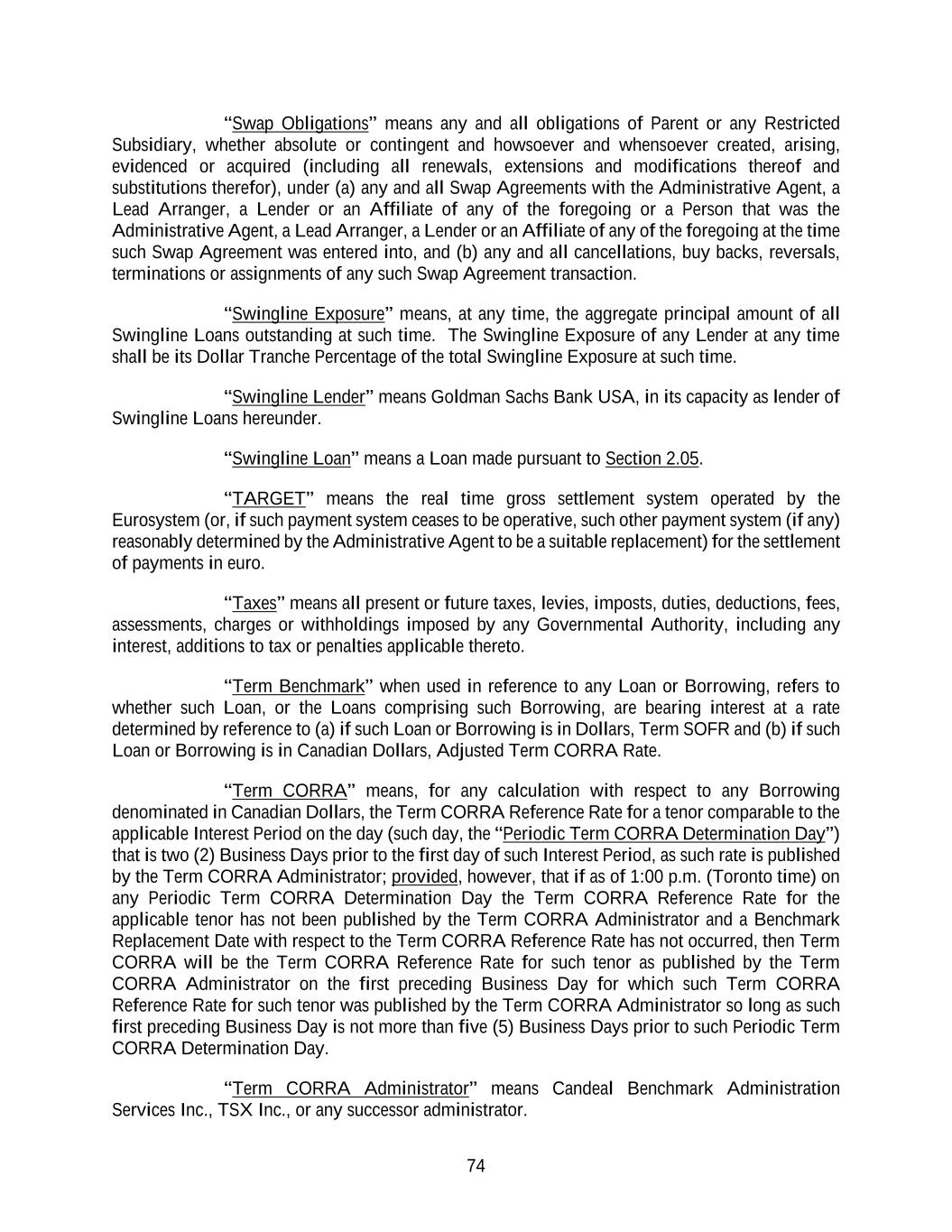 74 “Swap Obligations” means any and all obligations of Parent or any Restricted Subsidiary, whether absolute or contingent and howsoever and whensoever created, arising, evidenced or acquired (including all renewals, extensions and modifications thereof and substitutions therefor), under (a) any and all Swap Agreements with the Administrative Agent, a Lead Arranger, a Lender or an Affiliate of any of the foregoing or a Person that was the Administrative Agent, a Lead Arranger, a Lender or an Affiliate of any of the foregoing at the time such Swap Agreement was entered into, and (b) any and all cancellations, buy backs, reversals, terminations or assignments of any such Swap Agreement transaction. “Swingline Exposure” means, at any time, the aggregate principal amount of all Swingline Loans outstanding at such time. The Swingline Exposure of any Lender at any time shall be its Dollar Tranche Percentage of the total Swingline Exposure at such time. “Swingline Lender” means Goldman Sachs Bank USA, in its capacity as lender of Swingline Loans hereunder. “Swingline Loan” means a Loan made pursuant to Section 2.05. “TARGET” means the real time gross settlement system operated by the Eurosystem (or, if such payment system ceases to be operative, such other payment system (if any) reasonably determined by the Administrative Agent to be a suitable replacement) for the settlement of payments in euro. “Taxes” means all present or future taxes, levies, imposts, duties, deductions, fees, assessments, charges or withholdings imposed by any Governmental Authority, including any interest, additions to tax or penalties applicable thereto. “Term Benchmark” when used in reference to any Loan or Borrowing, refers to whether such Loan, or the Loans comprising such Borrowing, are bearing interest at a rate determined by reference to (a) if such Loan or Borrowing is in Dollars, Term SOFR and (b) if such Loan or Borrowing is in Canadian Dollars, Adjusted Term CORRA Rate. “Term CORRA” means, for any calculation with respect to any Borrowing denominated in Canadian Dollars, the Term CORRA Reference Rate for a tenor comparable to the applicable Interest Period on the day (such day, the “Periodic Term CORRA Determination Day”) that is two (2) Business Days prior to the first day of such Interest Period, as such rate is published by the Term CORRA Administrator; provided, however, that if as of 1:00 p.m. (Toronto time) on any Periodic Term CORRA Determination Day the Term CORRA Reference Rate for the applicable tenor has not been published by the Term CORRA Administrator and a Benchmark Replacement Date with respect to the Term CORRA Reference Rate has not occurred, then Term CORRA will be the Term CORRA Reference Rate for such tenor as published by the Term CORRA Administrator on the first preceding Business Day for which such Term CORRA Reference Rate for such tenor was published by the Term CORRA Administrator so long as such first preceding Business Day is not more than five (5) Business Days prior to such Periodic Term CORRA Determination Day. “Term CORRA Administrator” means Candeal Benchmark Administration Services Inc., TSX Inc., or any successor administrator.