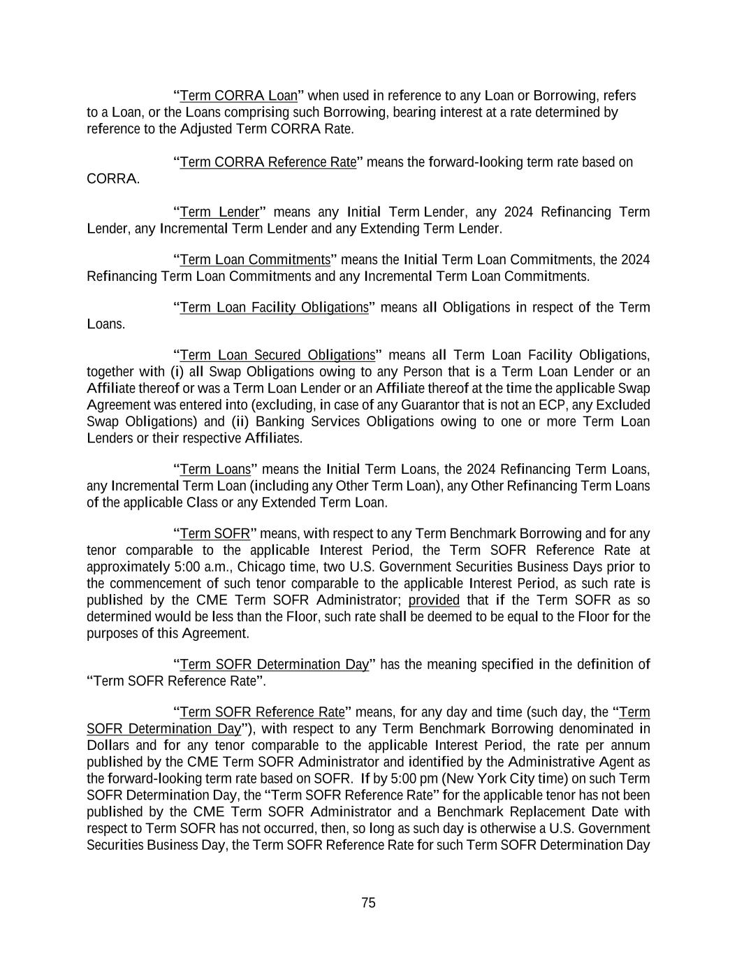75 “Term CORRA Loan” when used in reference to any Loan or Borrowing, refers to a Loan, or the Loans comprising such Borrowing, bearing interest at a rate determined by reference to the Adjusted Term CORRA Rate. “Term CORRA Reference Rate” means the forward-looking term rate based on CORRA. “Term Lender” means any Initial Term Lender, any 2024 Refinancing Term Lender, any Incremental Term Lender and any Extending Term Lender. “Term Loan Commitments” means the Initial Term Loan Commitments, the 2024 Refinancing Term Loan Commitments and any Incremental Term Loan Commitments. “Term Loan Facility Obligations” means all Obligations in respect of the Term Loans. “Term Loan Secured Obligations” means all Term Loan Facility Obligations, together with (i) all Swap Obligations owing to any Person that is a Term Loan Lender or an Affiliate thereof or was a Term Loan Lender or an Affiliate thereof at the time the applicable Swap Agreement was entered into (excluding, in case of any Guarantor that is not an ECP, any Excluded Swap Obligations) and (ii) Banking Services Obligations owing to one or more Term Loan Lenders or their respective Affiliates. “Term Loans” means the Initial Term Loans, the 2024 Refinancing Term Loans, any Incremental Term Loan (including any Other Term Loan), any Other Refinancing Term Loans of the applicable Class or any Extended Term Loan. “Term SOFR” means, with respect to any Term Benchmark Borrowing and for any tenor comparable to the applicable Interest Period, the Term SOFR Reference Rate at approximately 5:00 a.m., Chicago time, two U.S. Government Securities Business Days prior to the commencement of such tenor comparable to the applicable Interest Period, as such rate is published by the CME Term SOFR Administrator; provided that if the Term SOFR as so determined would be less than the Floor, such rate shall be deemed to be equal to the Floor for the purposes of this Agreement. “Term SOFR Determination Day” has the meaning specified in the definition of “Term SOFR Reference Rate”. “Term SOFR Reference Rate” means, for any day and time (such day, the “Term SOFR Determination Day”), with respect to any Term Benchmark Borrowing denominated in Dollars and for any tenor comparable to the applicable Interest Period, the rate per annum published by the CME Term SOFR Administrator and identified by the Administrative Agent as the forward-looking term rate based on SOFR. If by 5:00 pm (New York City time) on such Term SOFR Determination Day, the “Term SOFR Reference Rate” for the applicable tenor has not been published by the CME Term SOFR Administrator and a Benchmark Replacement Date with respect to Term SOFR has not occurred, then, so long as such day is otherwise a U.S. Government Securities Business Day, the Term SOFR Reference Rate for such Term SOFR Determination Day