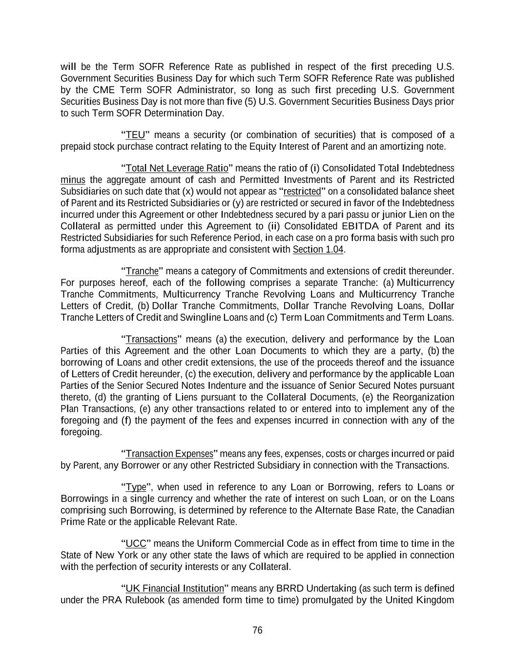 76 will be the Term SOFR Reference Rate as published in respect of the first preceding U.S. Government Securities Business Day for which such Term SOFR Reference Rate was published by the CME Term SOFR Administrator, so long as such first preceding U.S. Government Securities Business Day is not more than five (5) U.S. Government Securities Business Days prior to such Term SOFR Determination Day. “TEU” means a security (or combination of securities) that is composed of a prepaid stock purchase contract relating to the Equity Interest of Parent and an amortizing note. “Total Net Leverage Ratio” means the ratio of (i) Consolidated Total Indebtedness minus the aggregate amount of cash and Permitted Investments of Parent and its Restricted Subsidiaries on such date that (x) would not appear as “restricted” on a consolidated balance sheet of Parent and its Restricted Subsidiaries or (y) are restricted or secured in favor of the Indebtedness incurred under this Agreement or other Indebtedness secured by a pari passu or junior Lien on the Collateral as permitted under this Agreement to (ii) Consolidated EBITDA of Parent and its Restricted Subsidiaries for such Reference Period, in each case on a pro forma basis with such pro forma adjustments as are appropriate and consistent with Section 1.04. “Tranche” means a category of Commitments and extensions of credit thereunder. For purposes hereof, each of the following comprises a separate Tranche: (a) Multicurrency Tranche Commitments, Multicurrency Tranche Revolving Loans and Multicurrency Tranche Letters of Credit, (b) Dollar Tranche Commitments, Dollar Tranche Revolving Loans, Dollar Tranche Letters of Credit and Swingline Loans and (c) Term Loan Commitments and Term Loans. “Transactions” means (a) the execution, delivery and performance by the Loan Parties of this Agreement and the other Loan Documents to which they are a party, (b) the borrowing of Loans and other credit extensions, the use of the proceeds thereof and the issuance of Letters of Credit hereunder, (c) the execution, delivery and performance by the applicable Loan Parties of the Senior Secured Notes Indenture and the issuance of Senior Secured Notes pursuant thereto, (d) the granting of Liens pursuant to the Collateral Documents, (e) the Reorganization Plan Transactions, (e) any other transactions related to or entered into to implement any of the foregoing and (f) the payment of the fees and expenses incurred in connection with any of the foregoing. “Transaction Expenses” means any fees, expenses, costs or charges incurred or paid by Parent, any Borrower or any other Restricted Subsidiary in connection with the Transactions. “Type”, when used in reference to any Loan or Borrowing, refers to Loans or Borrowings in a single currency and whether the rate of interest on such Loan, or on the Loans comprising such Borrowing, is determined by reference to the Alternate Base Rate, the Canadian Prime Rate or the applicable Relevant Rate. “UCC” means the Uniform Commercial Code as in effect from time to time in the State of New York or any other state the laws of which are required to be applied in connection with the perfection of security interests or any Collateral. “UK Financial Institution” means any BRRD Undertaking (as such term is defined under the PRA Rulebook (as amended form time to time) promulgated by the United Kingdom