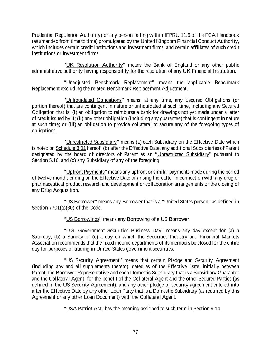 77 Prudential Regulation Authority) or any person falling within IFPRU 11.6 of the FCA Handbook (as amended from time to time) promulgated by the United Kingdom Financial Conduct Authority, which includes certain credit institutions and investment firms, and certain affiliates of such credit institutions or investment firms. “UK Resolution Authority” means the Bank of England or any other public administrative authority having responsibility for the resolution of any UK Financial Institution. “Unadjusted Benchmark Replacement” means the applicable Benchmark Replacement excluding the related Benchmark Replacement Adjustment. “Unliquidated Obligations” means, at any time, any Secured Obligations (or portion thereof) that are contingent in nature or unliquidated at such time, including any Secured Obligation that is: (i) an obligation to reimburse a bank for drawings not yet made under a letter of credit issued by it; (ii) any other obligation (including any guarantee) that is contingent in nature at such time; or (iii) an obligation to provide collateral to secure any of the foregoing types of obligations. “Unrestricted Subsidiary” means (a) each Subsidiary on the Effective Date which is noted on Schedule 3.01 hereof, (b) after the Effective Date, any additional Subsidiaries of Parent designated by the board of directors of Parent as an “Unrestricted Subsidiary” pursuant to Section 5.10, and (c) any Subsidiary of any of the foregoing. “Upfront Payments” means any upfront or similar payments made during the period of twelve months ending on the Effective Date or arising thereafter in connection with any drug or pharmaceutical product research and development or collaboration arrangements or the closing of any Drug Acquisition. “US Borrower” means any Borrower that is a “United States person” as defined in Section 7701(a)(30) of the Code. “US Borrowings” means any Borrowing of a US Borrower. “U.S. Government Securities Business Day” means any day except for (a) a Saturday, (b) a Sunday or (c) a day on which the Securities Industry and Financial Markets Association recommends that the fixed income departments of its members be closed for the entire day for purposes of trading in United States government securities. “US Security Agreement” means that certain Pledge and Security Agreement (including any and all supplements thereto), dated as of the Effective Date, initially between Parent, the Borrower Representative and each Domestic Subsidiary that is a Subsidiary Guarantor and the Collateral Agent, for the benefit of the Collateral Agent and the other Secured Parties (as defined in the US Security Agreement), and any other pledge or security agreement entered into after the Effective Date by any other Loan Party that is a Domestic Subsidiary (as required by this Agreement or any other Loan Document) with the Collateral Agent. “USA Patriot Act” has the meaning assigned to such term in Section 9.14.