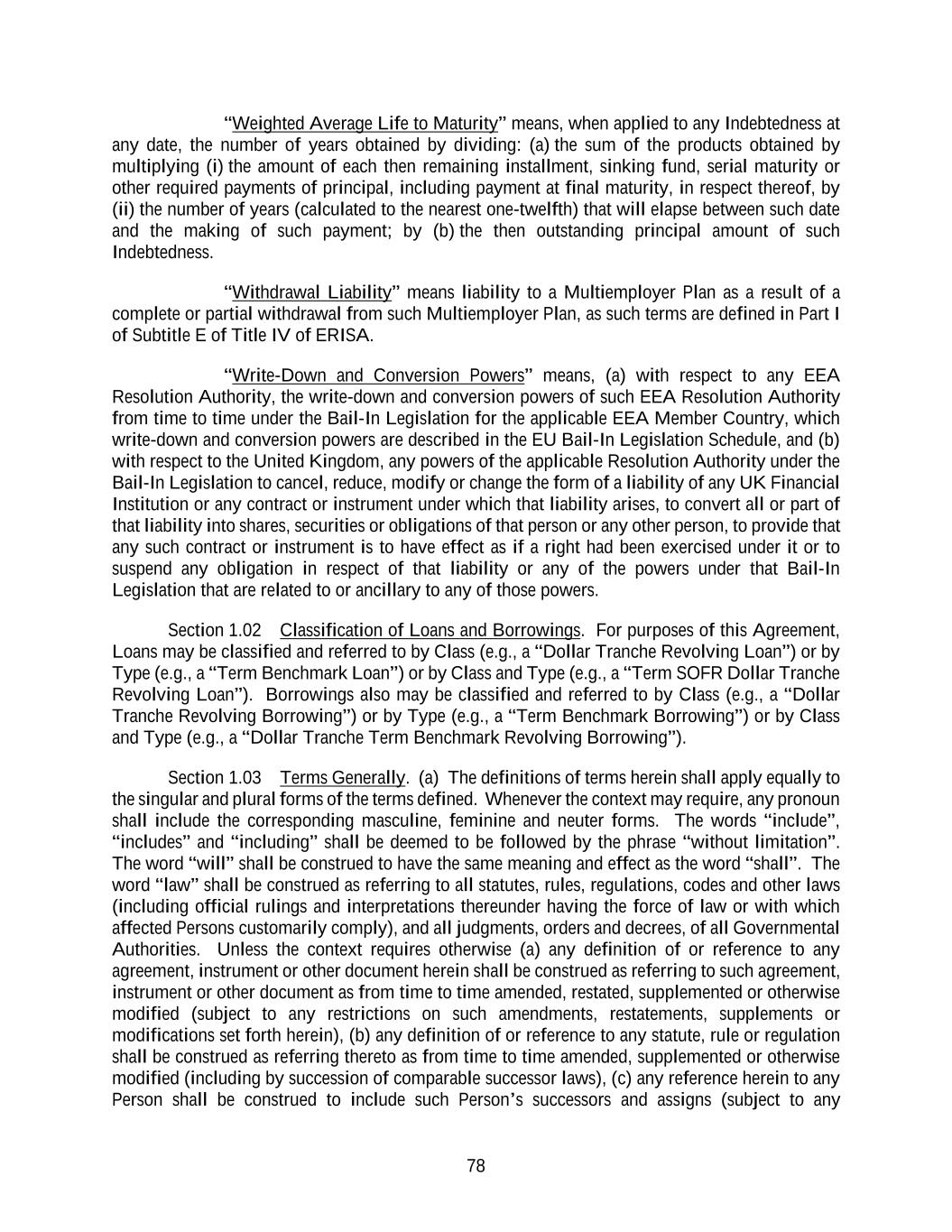 78 “Weighted Average Life to Maturity” means, when applied to any Indebtedness at any date, the number of years obtained by dividing: (a) the sum of the products obtained by multiplying (i) the amount of each then remaining installment, sinking fund, serial maturity or other required payments of principal, including payment at final maturity, in respect thereof, by (ii) the number of years (calculated to the nearest one-twelfth) that will elapse between such date and the making of such payment; by (b) the then outstanding principal amount of such Indebtedness. “Withdrawal Liability” means liability to a Multiemployer Plan as a result of a complete or partial withdrawal from such Multiemployer Plan, as such terms are defined in Part I of Subtitle E of Title IV of ERISA. “Write-Down and Conversion Powers” means, (a) with respect to any EEA Resolution Authority, the write-down and conversion powers of such EEA Resolution Authority from time to time under the Bail-In Legislation for the applicable EEA Member Country, which write-down and conversion powers are described in the EU Bail-In Legislation Schedule, and (b) with respect to the United Kingdom, any powers of the applicable Resolution Authority under the Bail-In Legislation to cancel, reduce, modify or change the form of a liability of any UK Financial Institution or any contract or instrument under which that liability arises, to convert all or part of that liability into shares, securities or obligations of that person or any other person, to provide that any such contract or instrument is to have effect as if a right had been exercised under it or to suspend any obligation in respect of that liability or any of the powers under that Bail-In Legislation that are related to or ancillary to any of those powers. Section 1.02 Classification of Loans and Borrowings. For purposes of this Agreement, Loans may be classified and referred to by Class (e.g., a “Dollar Tranche Revolving Loan”) or by Type (e.g., a “Term Benchmark Loan”) or by Class and Type (e.g., a “Term SOFR Dollar Tranche Revolving Loan”). Borrowings also may be classified and referred to by Class (e.g., a “Dollar Tranche Revolving Borrowing”) or by Type (e.g., a “Term Benchmark Borrowing”) or by Class and Type (e.g., a “Dollar Tranche Term Benchmark Revolving Borrowing”). Section 1.03 Terms Generally. (a) The definitions of terms herein shall apply equally to the singular and plural forms of the terms defined. Whenever the context may require, any pronoun shall include the corresponding masculine, feminine and neuter forms. The words “include”, “includes” and “including” shall be deemed to be followed by the phrase “without limitation”. The word “will” shall be construed to have the same meaning and effect as the word “shall”. The word “law” shall be construed as referring to all statutes, rules, regulations, codes and other laws (including official rulings and interpretations thereunder having the force of law or with which affected Persons customarily comply), and all judgments, orders and decrees, of all Governmental Authorities. Unless the context requires otherwise (a) any definition of or reference to any agreement, instrument or other document herein shall be construed as referring to such agreement, instrument or other document as from time to time amended, restated, supplemented or otherwise modified (subject to any restrictions on such amendments, restatements, supplements or modifications set forth herein), (b) any definition of or reference to any statute, rule or regulation shall be construed as referring thereto as from time to time amended, supplemented or otherwise modified (including by succession of comparable successor laws), (c) any reference herein to any Person shall be construed to include such Person’s successors and assigns (subject to any