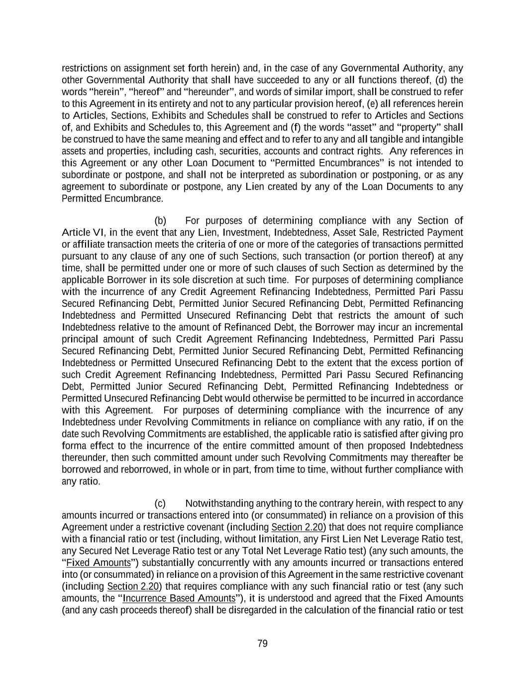 79 restrictions on assignment set forth herein) and, in the case of any Governmental Authority, any other Governmental Authority that shall have succeeded to any or all functions thereof, (d) the words “herein”, “hereof” and “hereunder”, and words of similar import, shall be construed to refer to this Agreement in its entirety and not to any particular provision hereof, (e) all references herein to Articles, Sections, Exhibits and Schedules shall be construed to refer to Articles and Sections of, and Exhibits and Schedules to, this Agreement and (f) the words “asset” and “property” shall be construed to have the same meaning and effect and to refer to any and all tangible and intangible assets and properties, including cash, securities, accounts and contract rights. Any references in this Agreement or any other Loan Document to “Permitted Encumbrances” is not intended to subordinate or postpone, and shall not be interpreted as subordination or postponing, or as any agreement to subordinate or postpone, any Lien created by any of the Loan Documents to any Permitted Encumbrance. (b) For purposes of determining compliance with any Section of Article VI, in the event that any Lien, Investment, Indebtedness, Asset Sale, Restricted Payment or affiliate transaction meets the criteria of one or more of the categories of transactions permitted pursuant to any clause of any one of such Sections, such transaction (or portion thereof) at any time, shall be permitted under one or more of such clauses of such Section as determined by the applicable Borrower in its sole discretion at such time. For purposes of determining compliance with the incurrence of any Credit Agreement Refinancing Indebtedness, Permitted Pari Passu Secured Refinancing Debt, Permitted Junior Secured Refinancing Debt, Permitted Refinancing Indebtedness and Permitted Unsecured Refinancing Debt that restricts the amount of such Indebtedness relative to the amount of Refinanced Debt, the Borrower may incur an incremental principal amount of such Credit Agreement Refinancing Indebtedness, Permitted Pari Passu Secured Refinancing Debt, Permitted Junior Secured Refinancing Debt, Permitted Refinancing Indebtedness or Permitted Unsecured Refinancing Debt to the extent that the excess portion of such Credit Agreement Refinancing Indebtedness, Permitted Pari Passu Secured Refinancing Debt, Permitted Junior Secured Refinancing Debt, Permitted Refinancing Indebtedness or Permitted Unsecured Refinancing Debt would otherwise be permitted to be incurred in accordance with this Agreement. For purposes of determining compliance with the incurrence of any Indebtedness under Revolving Commitments in reliance on compliance with any ratio, if on the date such Revolving Commitments are established, the applicable ratio is satisfied after giving pro forma effect to the incurrence of the entire committed amount of then proposed Indebtedness thereunder, then such committed amount under such Revolving Commitments may thereafter be borrowed and reborrowed, in whole or in part, from time to time, without further compliance with any ratio. (c) Notwithstanding anything to the contrary herein, with respect to any amounts incurred or transactions entered into (or consummated) in reliance on a provision of this Agreement under a restrictive covenant (including Section 2.20) that does not require compliance with a financial ratio or test (including, without limitation, any First Lien Net Leverage Ratio test, any Secured Net Leverage Ratio test or any Total Net Leverage Ratio test) (any such amounts, the “Fixed Amounts”) substantially concurrently with any amounts incurred or transactions entered into (or consummated) in reliance on a provision of this Agreement in the same restrictive covenant (including Section 2.20) that requires compliance with any such financial ratio or test (any such amounts, the “Incurrence Based Amounts”), it is understood and agreed that the Fixed Amounts (and any cash proceeds thereof) shall be disregarded in the calculation of the financial ratio or test