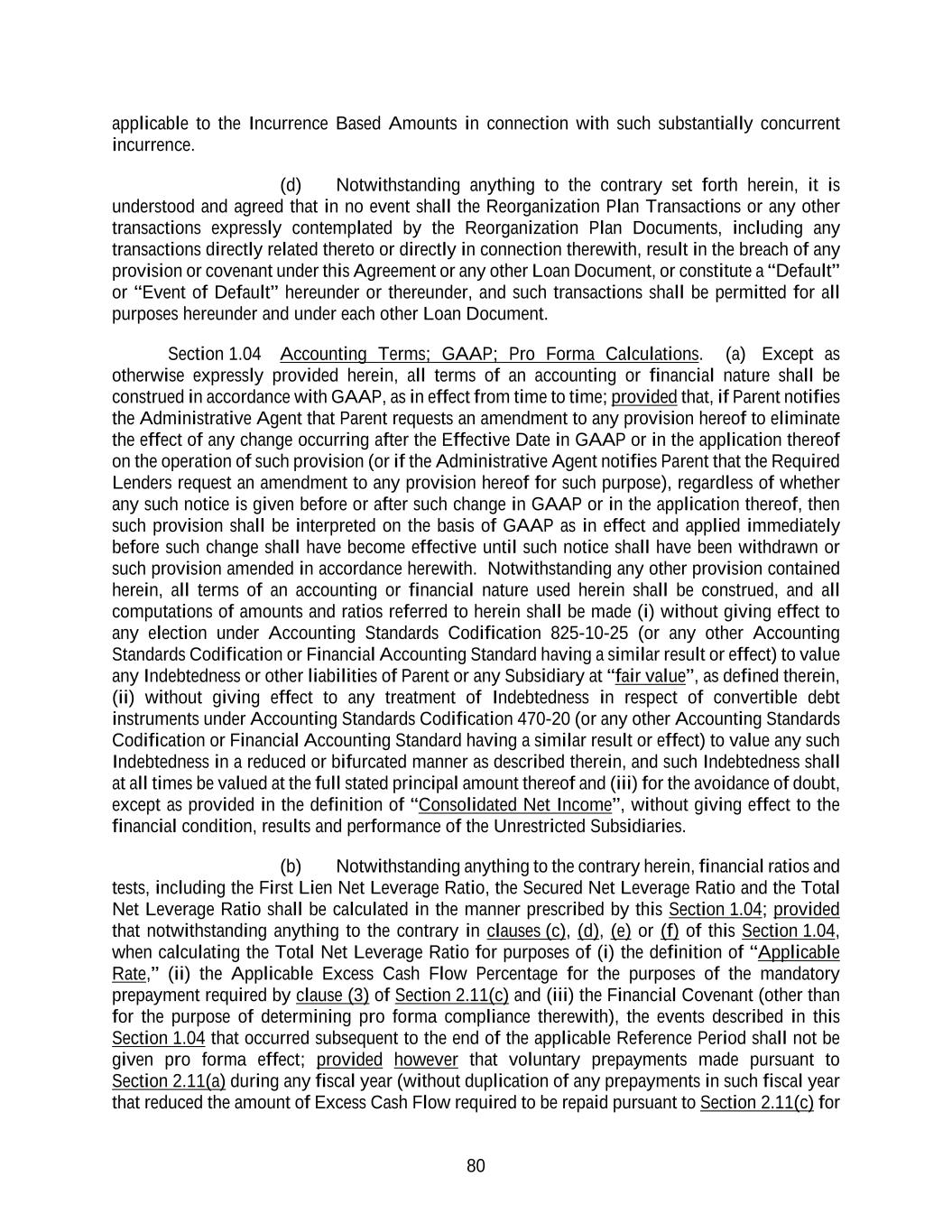 80 applicable to the Incurrence Based Amounts in connection with such substantially concurrent incurrence. (d) Notwithstanding anything to the contrary set forth herein, it is understood and agreed that in no event shall the Reorganization Plan Transactions or any other transactions expressly contemplated by the Reorganization Plan Documents, including any transactions directly related thereto or directly in connection therewith, result in the breach of any provision or covenant under this Agreement or any other Loan Document, or constitute a “Default” or “Event of Default” hereunder or thereunder, and such transactions shall be permitted for all purposes hereunder and under each other Loan Document. Section 1.04 Accounting Terms; GAAP; Pro Forma Calculations. (a) Except as otherwise expressly provided herein, all terms of an accounting or financial nature shall be construed in accordance with GAAP, as in effect from time to time; provided that, if Parent notifies the Administrative Agent that Parent requests an amendment to any provision hereof to eliminate the effect of any change occurring after the Effective Date in GAAP or in the application thereof on the operation of such provision (or if the Administrative Agent notifies Parent that the Required Lenders request an amendment to any provision hereof for such purpose), regardless of whether any such notice is given before or after such change in GAAP or in the application thereof, then such provision shall be interpreted on the basis of GAAP as in effect and applied immediately before such change shall have become effective until such notice shall have been withdrawn or such provision amended in accordance herewith. Notwithstanding any other provision contained herein, all terms of an accounting or financial nature used herein shall be construed, and all computations of amounts and ratios referred to herein shall be made (i) without giving effect to any election under Accounting Standards Codification 825-10-25 (or any other Accounting Standards Codification or Financial Accounting Standard having a similar result or effect) to value any Indebtedness or other liabilities of Parent or any Subsidiary at “fair value”, as defined therein, (ii) without giving effect to any treatment of Indebtedness in respect of convertible debt instruments under Accounting Standards Codification 470-20 (or any other Accounting Standards Codification or Financial Accounting Standard having a similar result or effect) to value any such Indebtedness in a reduced or bifurcated manner as described therein, and such Indebtedness shall at all times be valued at the full stated principal amount thereof and (iii) for the avoidance of doubt, except as provided in the definition of “Consolidated Net Income”, without giving effect to the financial condition, results and performance of the Unrestricted Subsidiaries. (b) Notwithstanding anything to the contrary herein, financial ratios and tests, including the First Lien Net Leverage Ratio, the Secured Net Leverage Ratio and the Total Net Leverage Ratio shall be calculated in the manner prescribed by this Section 1.04; provided that notwithstanding anything to the contrary in clauses (c), (d), (e) or (f) of this Section 1.04, when calculating the Total Net Leverage Ratio for purposes of (i) the definition of “Applicable Rate,” (ii) the Applicable Excess Cash Flow Percentage for the purposes of the mandatory prepayment required by clause (3) of Section 2.11(c) and (iii) the Financial Covenant (other than for the purpose of determining pro forma compliance therewith), the events described in this Section 1.04 that occurred subsequent to the end of the applicable Reference Period shall not be given pro forma effect; provided however that voluntary prepayments made pursuant to Section 2.11(a) during any fiscal year (without duplication of any prepayments in such fiscal year that reduced the amount of Excess Cash Flow required to be repaid pursuant to Section 2.11(c) for