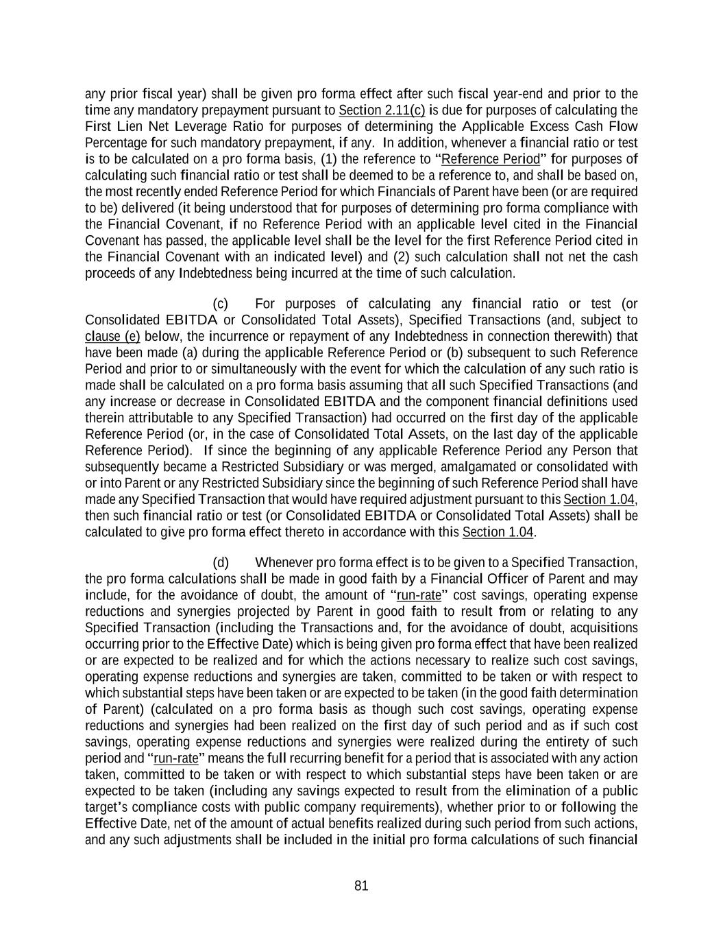 81 any prior fiscal year) shall be given pro forma effect after such fiscal year-end and prior to the time any mandatory prepayment pursuant to Section 2.11(c) is due for purposes of calculating the First Lien Net Leverage Ratio for purposes of determining the Applicable Excess Cash Flow Percentage for such mandatory prepayment, if any. In addition, whenever a financial ratio or test is to be calculated on a pro forma basis, (1) the reference to “Reference Period” for purposes of calculating such financial ratio or test shall be deemed to be a reference to, and shall be based on, the most recently ended Reference Period for which Financials of Parent have been (or are required to be) delivered (it being understood that for purposes of determining pro forma compliance with the Financial Covenant, if no Reference Period with an applicable level cited in the Financial Covenant has passed, the applicable level shall be the level for the first Reference Period cited in the Financial Covenant with an indicated level) and (2) such calculation shall not net the cash proceeds of any Indebtedness being incurred at the time of such calculation. (c) For purposes of calculating any financial ratio or test (or Consolidated EBITDA or Consolidated Total Assets), Specified Transactions (and, subject to clause (e) below, the incurrence or repayment of any Indebtedness in connection therewith) that have been made (a) during the applicable Reference Period or (b) subsequent to such Reference Period and prior to or simultaneously with the event for which the calculation of any such ratio is made shall be calculated on a pro forma basis assuming that all such Specified Transactions (and any increase or decrease in Consolidated EBITDA and the component financial definitions used therein attributable to any Specified Transaction) had occurred on the first day of the applicable Reference Period (or, in the case of Consolidated Total Assets, on the last day of the applicable Reference Period). If since the beginning of any applicable Reference Period any Person that subsequently became a Restricted Subsidiary or was merged, amalgamated or consolidated with or into Parent or any Restricted Subsidiary since the beginning of such Reference Period shall have made any Specified Transaction that would have required adjustment pursuant to this Section 1.04, then such financial ratio or test (or Consolidated EBITDA or Consolidated Total Assets) shall be calculated to give pro forma effect thereto in accordance with this Section 1.04. (d) Whenever pro forma effect is to be given to a Specified Transaction, the pro forma calculations shall be made in good faith by a Financial Officer of Parent and may include, for the avoidance of doubt, the amount of “run-rate” cost savings, operating expense reductions and synergies projected by Parent in good faith to result from or relating to any Specified Transaction (including the Transactions and, for the avoidance of doubt, acquisitions occurring prior to the Effective Date) which is being given pro forma effect that have been realized or are expected to be realized and for which the actions necessary to realize such cost savings, operating expense reductions and synergies are taken, committed to be taken or with respect to which substantial steps have been taken or are expected to be taken (in the good faith determination of Parent) (calculated on a pro forma basis as though such cost savings, operating expense reductions and synergies had been realized on the first day of such period and as if such cost savings, operating expense reductions and synergies were realized during the entirety of such period and “run-rate” means the full recurring benefit for a period that is associated with any action taken, committed to be taken or with respect to which substantial steps have been taken or are expected to be taken (including any savings expected to result from the elimination of a public target’s compliance costs with public company requirements), whether prior to or following the Effective Date, net of the amount of actual benefits realized during such period from such actions, and any such adjustments shall be included in the initial pro forma calculations of such financial