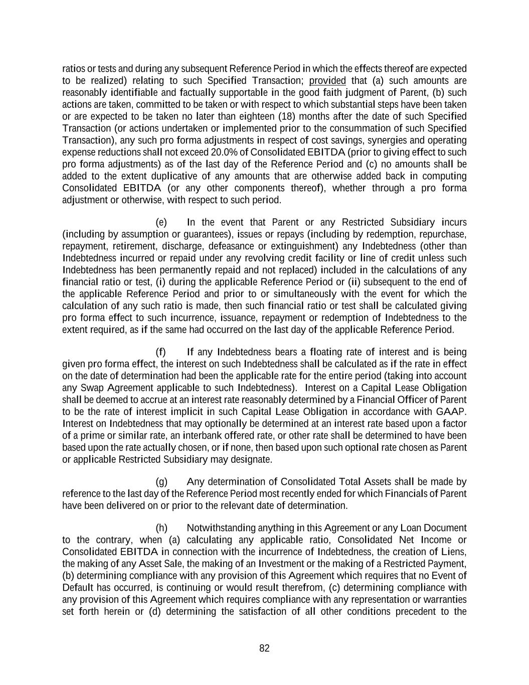 82 ratios or tests and during any subsequent Reference Period in which the effects thereof are expected to be realized) relating to such Specified Transaction; provided that (a) such amounts are reasonably identifiable and factually supportable in the good faith judgment of Parent, (b) such actions are taken, committed to be taken or with respect to which substantial steps have been taken or are expected to be taken no later than eighteen (18) months after the date of such Specified Transaction (or actions undertaken or implemented prior to the consummation of such Specified Transaction), any such pro forma adjustments in respect of cost savings, synergies and operating expense reductions shall not exceed 20.0% of Consolidated EBITDA (prior to giving effect to such pro forma adjustments) as of the last day of the Reference Period and (c) no amounts shall be added to the extent duplicative of any amounts that are otherwise added back in computing Consolidated EBITDA (or any other components thereof), whether through a pro forma adjustment or otherwise, with respect to such period. (e) In the event that Parent or any Restricted Subsidiary incurs (including by assumption or guarantees), issues or repays (including by redemption, repurchase, repayment, retirement, discharge, defeasance or extinguishment) any Indebtedness (other than Indebtedness incurred or repaid under any revolving credit facility or line of credit unless such Indebtedness has been permanently repaid and not replaced) included in the calculations of any financial ratio or test, (i) during the applicable Reference Period or (ii) subsequent to the end of the applicable Reference Period and prior to or simultaneously with the event for which the calculation of any such ratio is made, then such financial ratio or test shall be calculated giving pro forma effect to such incurrence, issuance, repayment or redemption of Indebtedness to the extent required, as if the same had occurred on the last day of the applicable Reference Period. (f) If any Indebtedness bears a floating rate of interest and is being given pro forma effect, the interest on such Indebtedness shall be calculated as if the rate in effect on the date of determination had been the applicable rate for the entire period (taking into account any Swap Agreement applicable to such Indebtedness). Interest on a Capital Lease Obligation shall be deemed to accrue at an interest rate reasonably determined by a Financial Officer of Parent to be the rate of interest implicit in such Capital Lease Obligation in accordance with GAAP. Interest on Indebtedness that may optionally be determined at an interest rate based upon a factor of a prime or similar rate, an interbank offered rate, or other rate shall be determined to have been based upon the rate actually chosen, or if none, then based upon such optional rate chosen as Parent or applicable Restricted Subsidiary may designate. (g) Any determination of Consolidated Total Assets shall be made by reference to the last day of the Reference Period most recently ended for which Financials of Parent have been delivered on or prior to the relevant date of determination. (h) Notwithstanding anything in this Agreement or any Loan Document to the contrary, when (a) calculating any applicable ratio, Consolidated Net Income or Consolidated EBITDA in connection with the incurrence of Indebtedness, the creation of Liens, the making of any Asset Sale, the making of an Investment or the making of a Restricted Payment, (b) determining compliance with any provision of this Agreement which requires that no Event of Default has occurred, is continuing or would result therefrom, (c) determining compliance with any provision of this Agreement which requires compliance with any representation or warranties set forth herein or (d) determining the satisfaction of all other conditions precedent to the