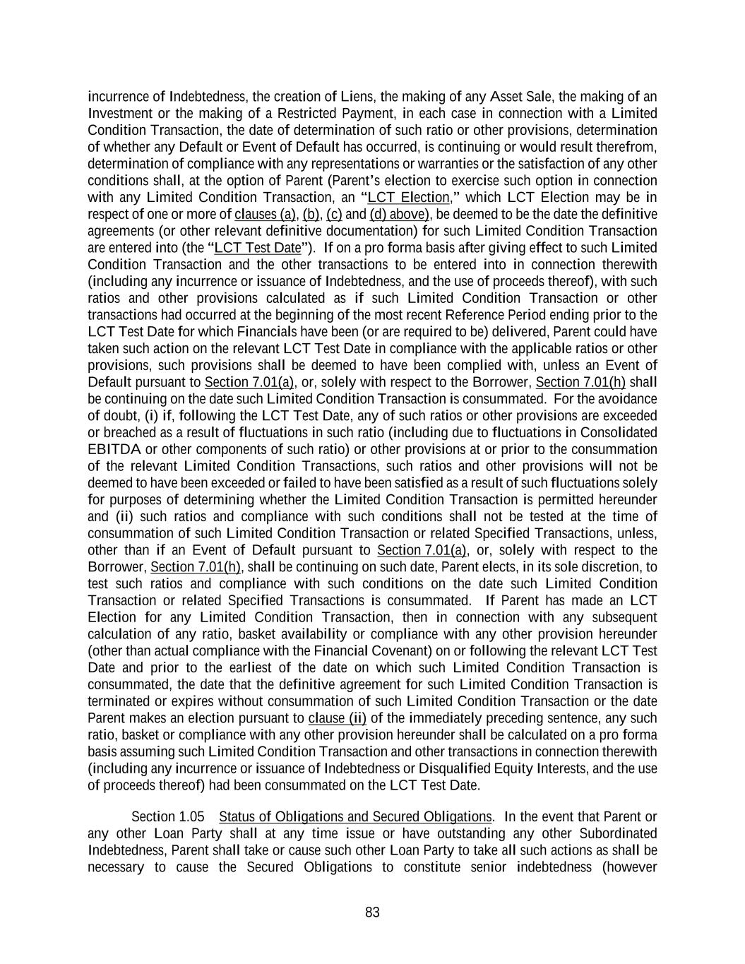 83 incurrence of Indebtedness, the creation of Liens, the making of any Asset Sale, the making of an Investment or the making of a Restricted Payment, in each case in connection with a Limited Condition Transaction, the date of determination of such ratio or other provisions, determination of whether any Default or Event of Default has occurred, is continuing or would result therefrom, determination of compliance with any representations or warranties or the satisfaction of any other conditions shall, at the option of Parent (Parent’s election to exercise such option in connection with any Limited Condition Transaction, an “LCT Election,” which LCT Election may be in respect of one or more of clauses (a), (b), (c) and (d) above), be deemed to be the date the definitive agreements (or other relevant definitive documentation) for such Limited Condition Transaction are entered into (the “LCT Test Date”). If on a pro forma basis after giving effect to such Limited Condition Transaction and the other transactions to be entered into in connection therewith (including any incurrence or issuance of Indebtedness, and the use of proceeds thereof), with such ratios and other provisions calculated as if such Limited Condition Transaction or other transactions had occurred at the beginning of the most recent Reference Period ending prior to the LCT Test Date for which Financials have been (or are required to be) delivered, Parent could have taken such action on the relevant LCT Test Date in compliance with the applicable ratios or other provisions, such provisions shall be deemed to have been complied with, unless an Event of Default pursuant to Section 7.01(a), or, solely with respect to the Borrower, Section 7.01(h) shall be continuing on the date such Limited Condition Transaction is consummated. For the avoidance of doubt, (i) if, following the LCT Test Date, any of such ratios or other provisions are exceeded or breached as a result of fluctuations in such ratio (including due to fluctuations in Consolidated EBITDA or other components of such ratio) or other provisions at or prior to the consummation of the relevant Limited Condition Transactions, such ratios and other provisions will not be deemed to have been exceeded or failed to have been satisfied as a result of such fluctuations solely for purposes of determining whether the Limited Condition Transaction is permitted hereunder and (ii) such ratios and compliance with such conditions shall not be tested at the time of consummation of such Limited Condition Transaction or related Specified Transactions, unless, other than if an Event of Default pursuant to Section 7.01(a), or, solely with respect to the Borrower, Section 7.01(h), shall be continuing on such date, Parent elects, in its sole discretion, to test such ratios and compliance with such conditions on the date such Limited Condition Transaction or related Specified Transactions is consummated. If Parent has made an LCT Election for any Limited Condition Transaction, then in connection with any subsequent calculation of any ratio, basket availability or compliance with any other provision hereunder (other than actual compliance with the Financial Covenant) on or following the relevant LCT Test Date and prior to the earliest of the date on which such Limited Condition Transaction is consummated, the date that the definitive agreement for such Limited Condition Transaction is terminated or expires without consummation of such Limited Condition Transaction or the date Parent makes an election pursuant to clause (ii) of the immediately preceding sentence, any such ratio, basket or compliance with any other provision hereunder shall be calculated on a pro forma basis assuming such Limited Condition Transaction and other transactions in connection therewith (including any incurrence or issuance of Indebtedness or Disqualified Equity Interests, and the use of proceeds thereof) had been consummated on the LCT Test Date. Section 1.05 Status of Obligations and Secured Obligations. In the event that Parent or any other Loan Party shall at any time issue or have outstanding any other Subordinated Indebtedness, Parent shall take or cause such other Loan Party to take all such actions as shall be necessary to cause the Secured Obligations to constitute senior indebtedness (however