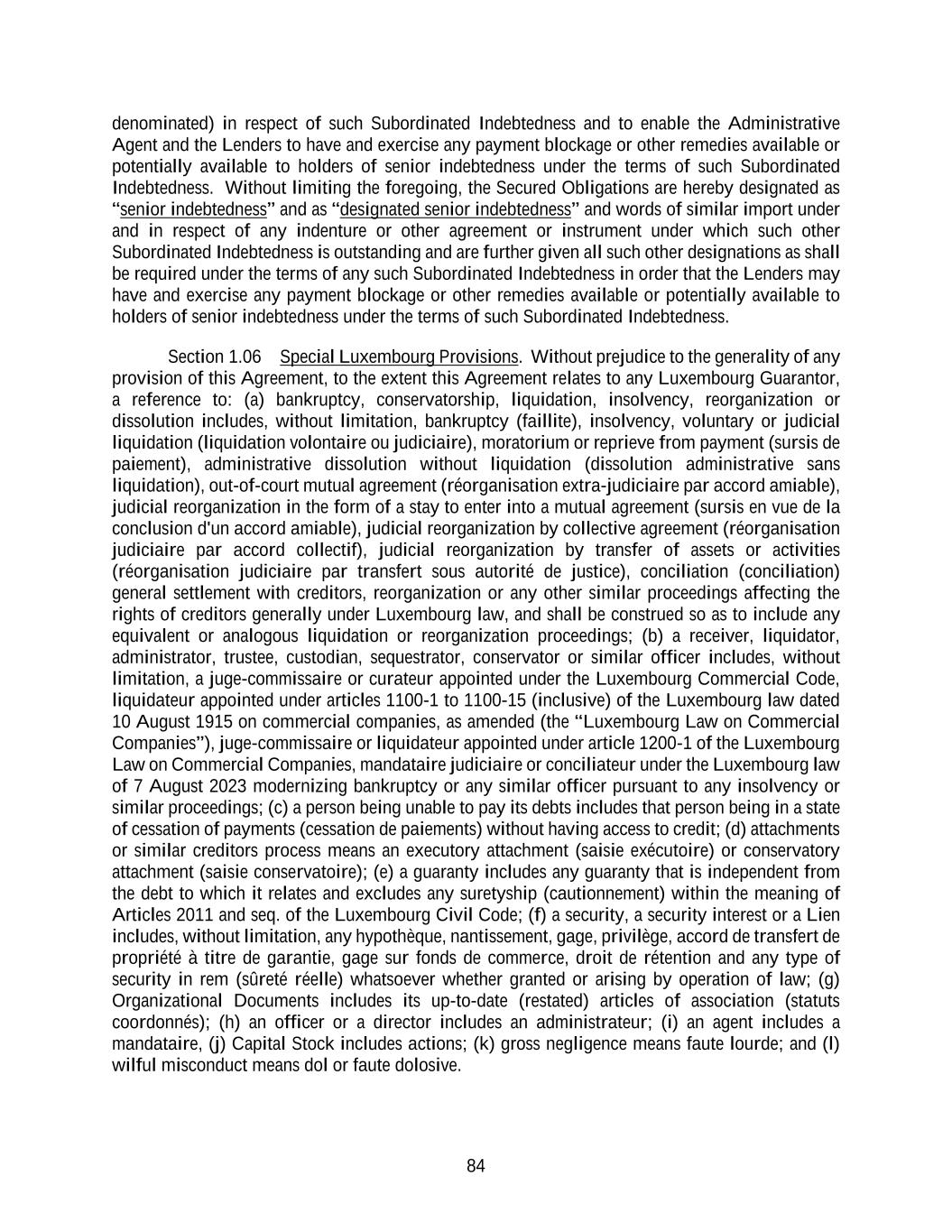 84 denominated) in respect of such Subordinated Indebtedness and to enable the Administrative Agent and the Lenders to have and exercise any payment blockage or other remedies available or potentially available to holders of senior indebtedness under the terms of such Subordinated Indebtedness. Without limiting the foregoing, the Secured Obligations are hereby designated as “senior indebtedness” and as “designated senior indebtedness” and words of similar import under and in respect of any indenture or other agreement or instrument under which such other Subordinated Indebtedness is outstanding and are further given all such other designations as shall be required under the terms of any such Subordinated Indebtedness in order that the Lenders may have and exercise any payment blockage or other remedies available or potentially available to holders of senior indebtedness under the terms of such Subordinated Indebtedness. Section 1.06 Special Luxembourg Provisions. Without prejudice to the generality of any provision of this Agreement, to the extent this Agreement relates to any Luxembourg Guarantor, a reference to: (a) bankruptcy, conservatorship, liquidation, insolvency, reorganization or dissolution includes, without limitation, bankruptcy (faillite), insolvency, voluntary or judicial liquidation (liquidation volontaire ou judiciaire), moratorium or reprieve from payment (sursis de paiement), administrative dissolution without liquidation (dissolution administrative sans liquidation), out-of-court mutual agreement (réorganisation extra-judiciaire par accord amiable), judicial reorganization in the form of a stay to enter into a mutual agreement (sursis en vue de la conclusion d'un accord amiable), judicial reorganization by collective agreement (réorganisation judiciaire par accord collectif), judicial reorganization by transfer of assets or activities (réorganisation judiciaire par transfert sous autorité de justice), conciliation (conciliation) general settlement with creditors, reorganization or any other similar proceedings affecting the rights of creditors generally under Luxembourg law, and shall be construed so as to include any equivalent or analogous liquidation or reorganization proceedings; (b) a receiver, liquidator, administrator, trustee, custodian, sequestrator, conservator or similar officer includes, without limitation, a juge-commissaire or curateur appointed under the Luxembourg Commercial Code, liquidateur appointed under articles 1100-1 to 1100-15 (inclusive) of the Luxembourg law dated 10 August 1915 on commercial companies, as amended (the “Luxembourg Law on Commercial Companies”), juge-commissaire or liquidateur appointed under article 1200-1 of the Luxembourg Law on Commercial Companies, mandataire judiciaire or conciliateur under the Luxembourg law of 7 August 2023 modernizing bankruptcy or any similar officer pursuant to any insolvency or similar proceedings; (c) a person being unable to pay its debts includes that person being in a state of cessation of payments (cessation de paiements) without having access to credit; (d) attachments or similar creditors process means an executory attachment (saisie exécutoire) or conservatory attachment (saisie conservatoire); (e) a guaranty includes any guaranty that is independent from the debt to which it relates and excludes any suretyship (cautionnement) within the meaning of Articles 2011 and seq. of the Luxembourg Civil Code; (f) a security, a security interest or a Lien includes, without limitation, any hypothèque, nantissement, gage, privilège, accord de transfert de propriété à titre de garantie, gage sur fonds de commerce, droit de rétention and any type of security in rem (sûreté réelle) whatsoever whether granted or arising by operation of law; (g) Organizational Documents includes its up-to-date (restated) articles of association (statuts coordonnés); (h) an officer or a director includes an administrateur; (i) an agent includes a mandataire, (j) Capital Stock includes actions; (k) gross negligence means faute lourde; and (l) wilful misconduct means dol or faute dolosive.